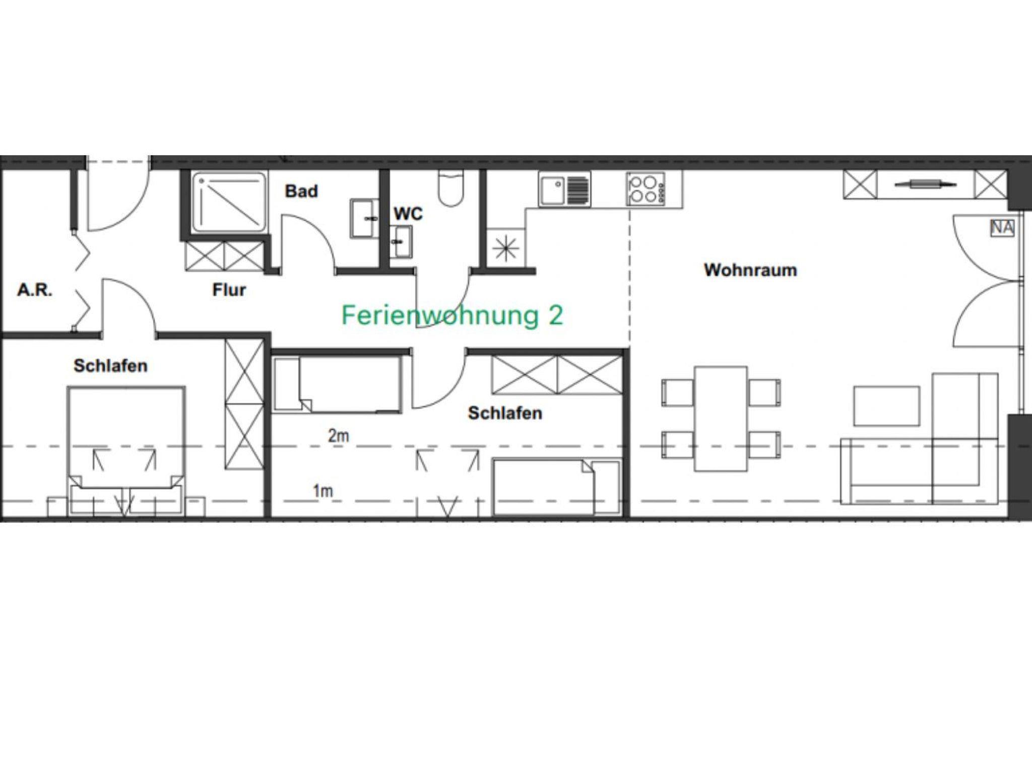 Die großzügigen, lichtdurchfluteten Wohn- und Essbereiche sind das Herzstück unserer Wohnungen. Große Fenster holen die Natur direkt ins Haus und schenken euch zu jeder Jahreszeit ein helles, freundliches Ambiente. Der warme Holzboden und die angenehme Fußbodenheizung sorgen für ein behagliches Wohngefühl – barfußlaufen ausdrücklich erwünscht! Die Wohnung verfügt über zwei gemütliche Schlafzimmer, ein modernes Bad sowie ein separates WC. Im Wohnbereich findet ihr ein bequemes Ausziehsofa, auf dem bei Bedarf bis zu zwei weitere Gäste Platz finden. Die Wohnungen sind außerdem allergikerfreundlich gestaltet. Aus Rücksicht darauf, und auf alle Gäste sind Haustiere in unseren Ferienwohnungen nicht gestattet. Die offenen, modernen Küchen sind mit allem ausgestattet, was ihr für euren Aufenthalt braucht – von Töpfen und Pfannen bis hin zur Kaffeemaschine und Spülmaschine. So könnt ihr entspannt gemeinsam kochen, essen und genießen.
