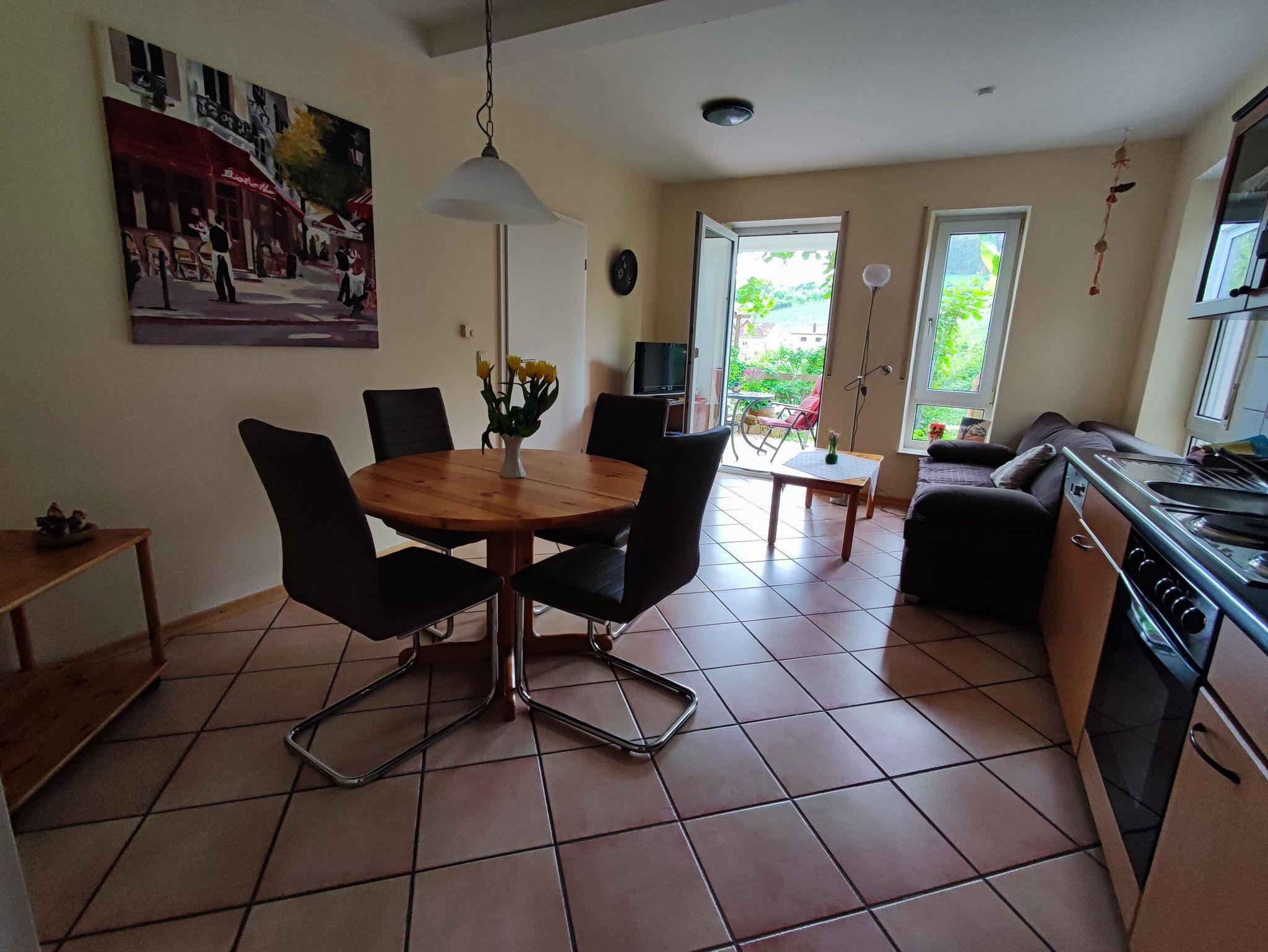 Die Ferienwohnung verfügt über ein Schlafzimmer mit Doppelbett und Zugang zur Terrasse, 1 Bad mit Dusche, Waschbecken und WC, 1 offenes Wohn-/Esszimmer mit Küche und Zugang zur Terrasse, der Wohnbereich verfügt über eine Couch mit Schlaffunktion (geeignet für 2 Kinder oder einen Erwachsenen) und einen gemütlichen Fernsehsessel, der Essbereich ist mit rundem Tisch und 4 Stühlen ausgestattet, die Küchenzeile verfügt über eine Spülmaschine, 4 Platten Kochherd, Kühlschrank mit Gefrierfach, Speisekammer/Stauraum/Weindepot, Flur mit Garderobe,große überdachte und wettergeschützte Terrasse mit Fernblick