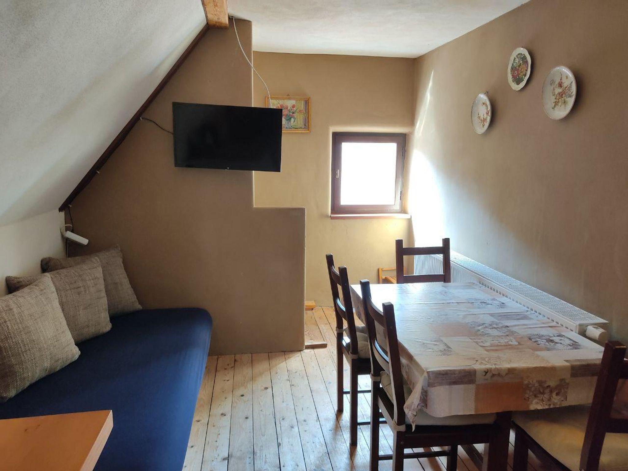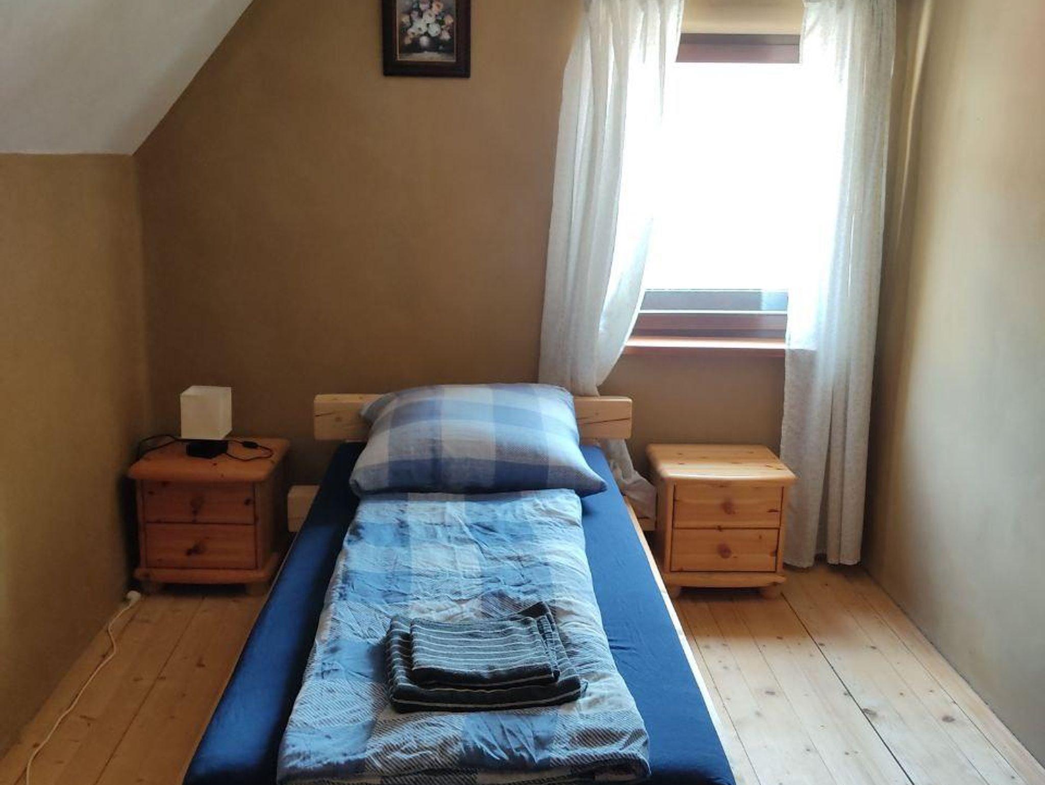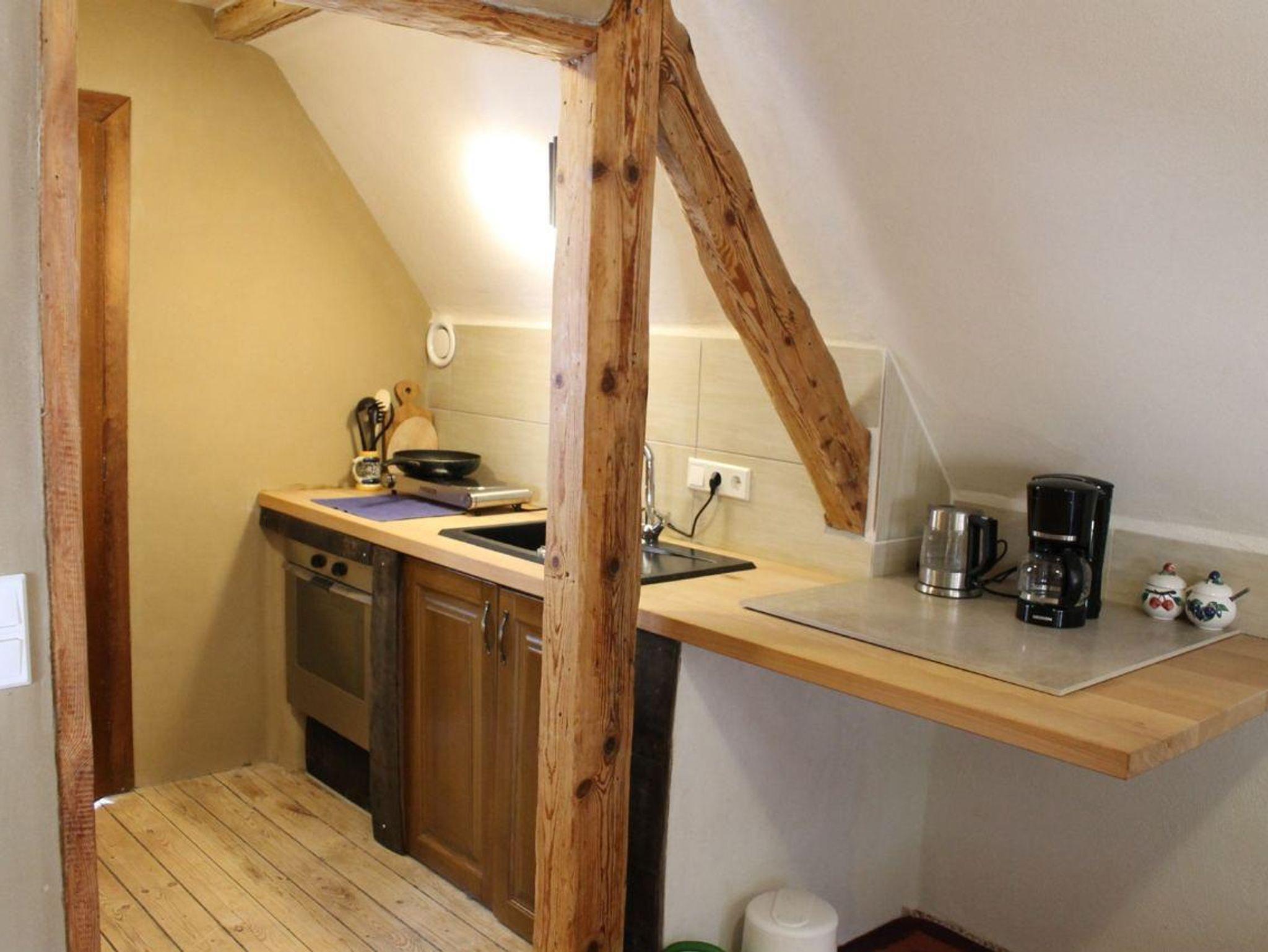 Gemütliche Ferienwohnung für bis zu vier Personen mit einem Doppelbett und zwei Einzelbetten, voll ausgestattete Küche und Bad mit Dusche. Die Wohnung befindet sich im Dachgeschoss und ist über eine steile Treppe zugänglich. Die Ferienwohnung ist urig eingerichtet, mit Holzboden und Holzbalken und hat eine wunderschöne Aussicht auf den Slevogthof.