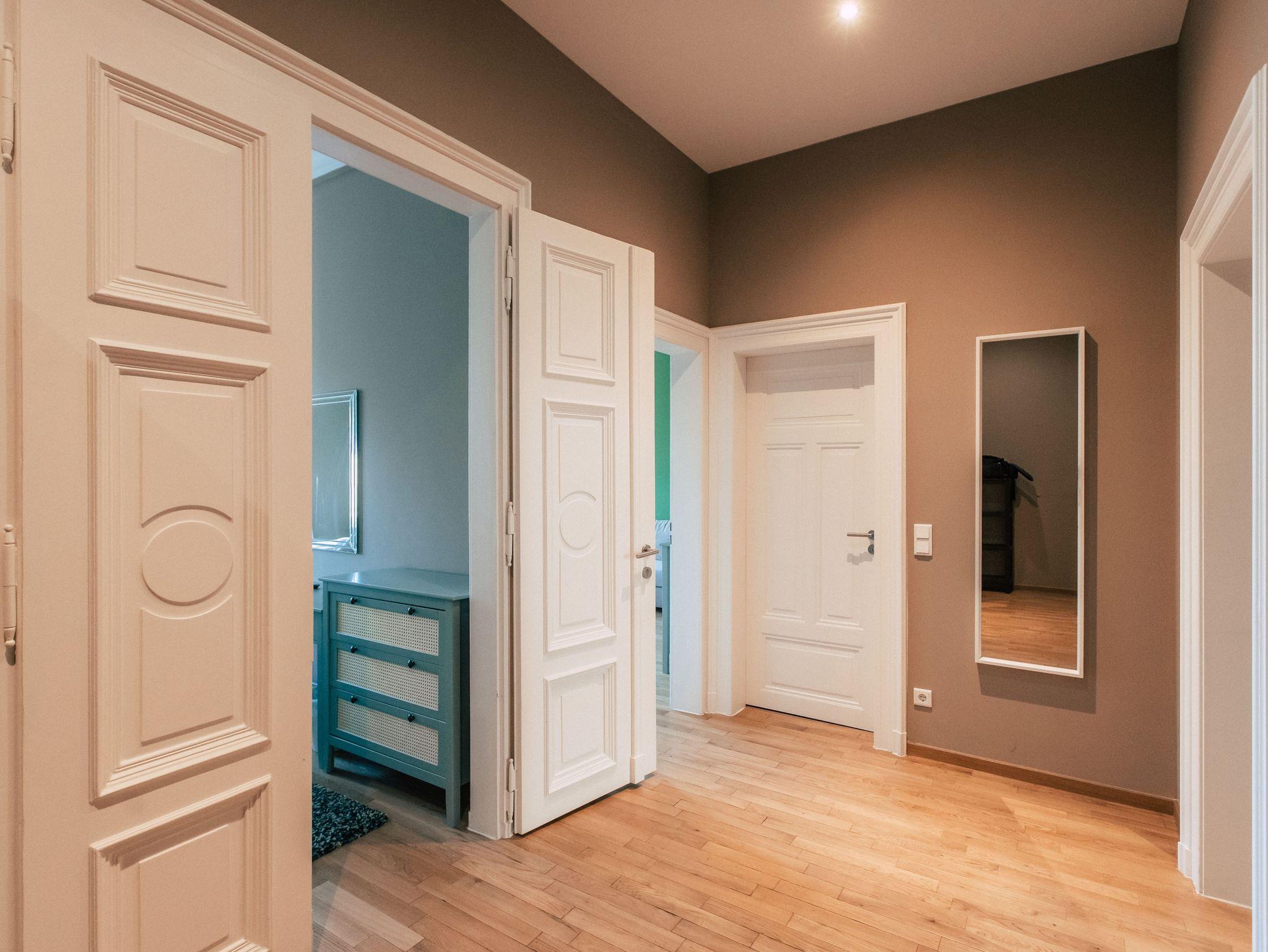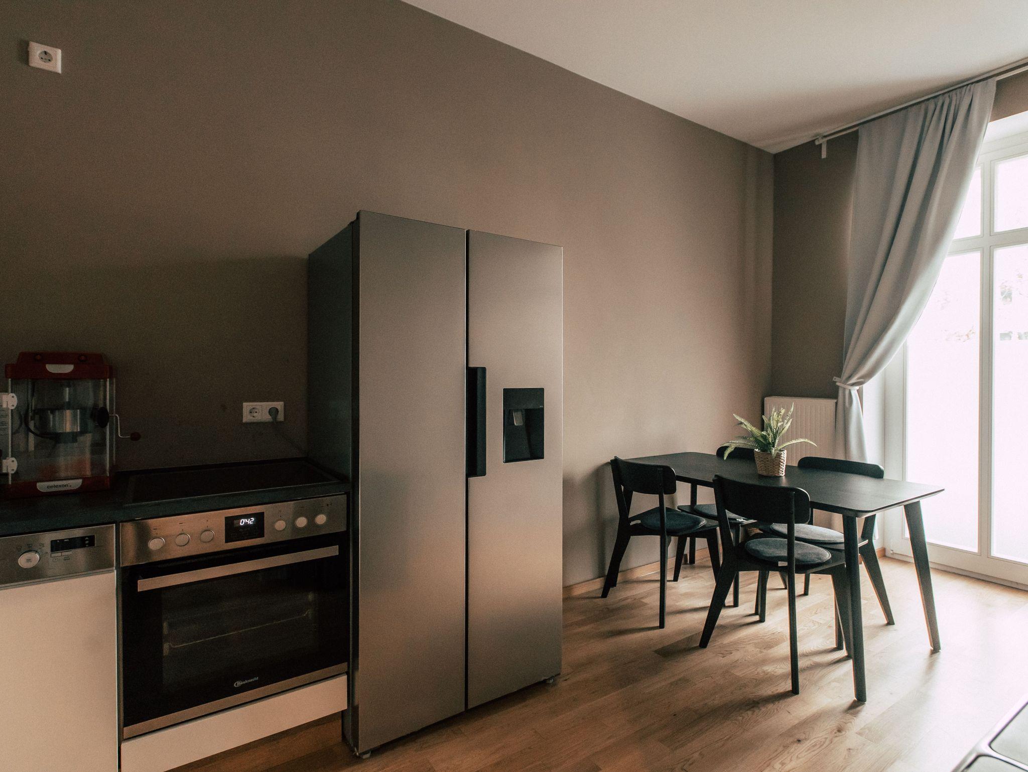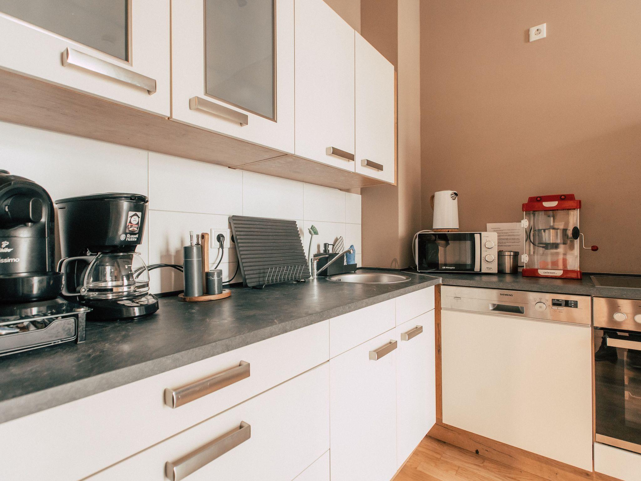 Viel Raum, hohe Decken und prachtvoller Stuck treffen auf modernen, veredelten Boho-chic ? ein absoluter Hingucker! Vom geräumigen Flur kommt man in das helle Schlaf- und Wohnzimmer. Holz und andere Naturmaterialien in warmen Farben, erfrischendes Grün und lässiger Boho-Stil bringen hier die Natur in Einklang mit klassischem Altbau und modernem Wohnen. Die entspannte Atmosphäre schafft einen trendigen Ruhepol im Herzen der Großstadt! Neben dem schicken Badezimmer mit ebenerdiger Dusche gibt es übrigens auch eine praktische Waschmaschine für alle, die gerne länger bleiben. Ergänzend zum Wohnbereich ist das Schlafzimmer mit komfortablem Boxspringbett in edlen, dunklem Schwarz gehalten und wirkt dezent luxuriös. Nicht nur vom Schlafzimmer gelangt man auf den ruhigen Balkon zum Hinterhof, sondern auch über die geschmackvolle Küche. Diese ist rundum ausgestattet und bietet, in Karamellfarben getaucht und mit verspielten Akzenten versehen, gemütlichen Platz zum Zusammensein!