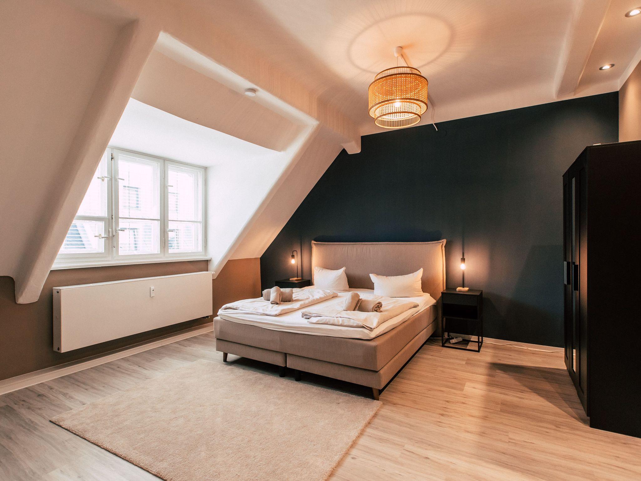 Inmitten der Leipziger Einkaufsmeile, unweit des Hauptbahnhofs, versteckt sich in einem prächtigen alten Jugendstilgebäude dieser kleine, feine Rückzugsort im Trubel der Stadt. Hoch oben mit Dachgeschossflair verbinden sich hier Altbau mit modernen, stilsicheren Elementen zu einem geschmackvollen, entschleunigten Ambiente, in dem du perfekt das Stadtleben auskosten kannst. Das geräumige Wohnzimmer mit Esstisch und Schlafsofa sind Mittelpunkt. Im Schlafzimmer nebenan verspricht das komfortable Boxspringbett unter sattem Dunkelblau erholsame Nachtruhe und die kleine separate Küche macht Kochen zum Genuss. Das moderne Badezimmer verfügt neben Dusche sogar über eine Waschmaschine. Perfekt für alle, die mitten in der Stadt Leipziger Luft schnuppern und sich auch gekonnt mit Stil zurückziehen wollen!