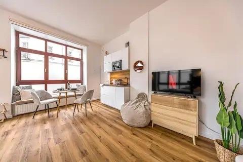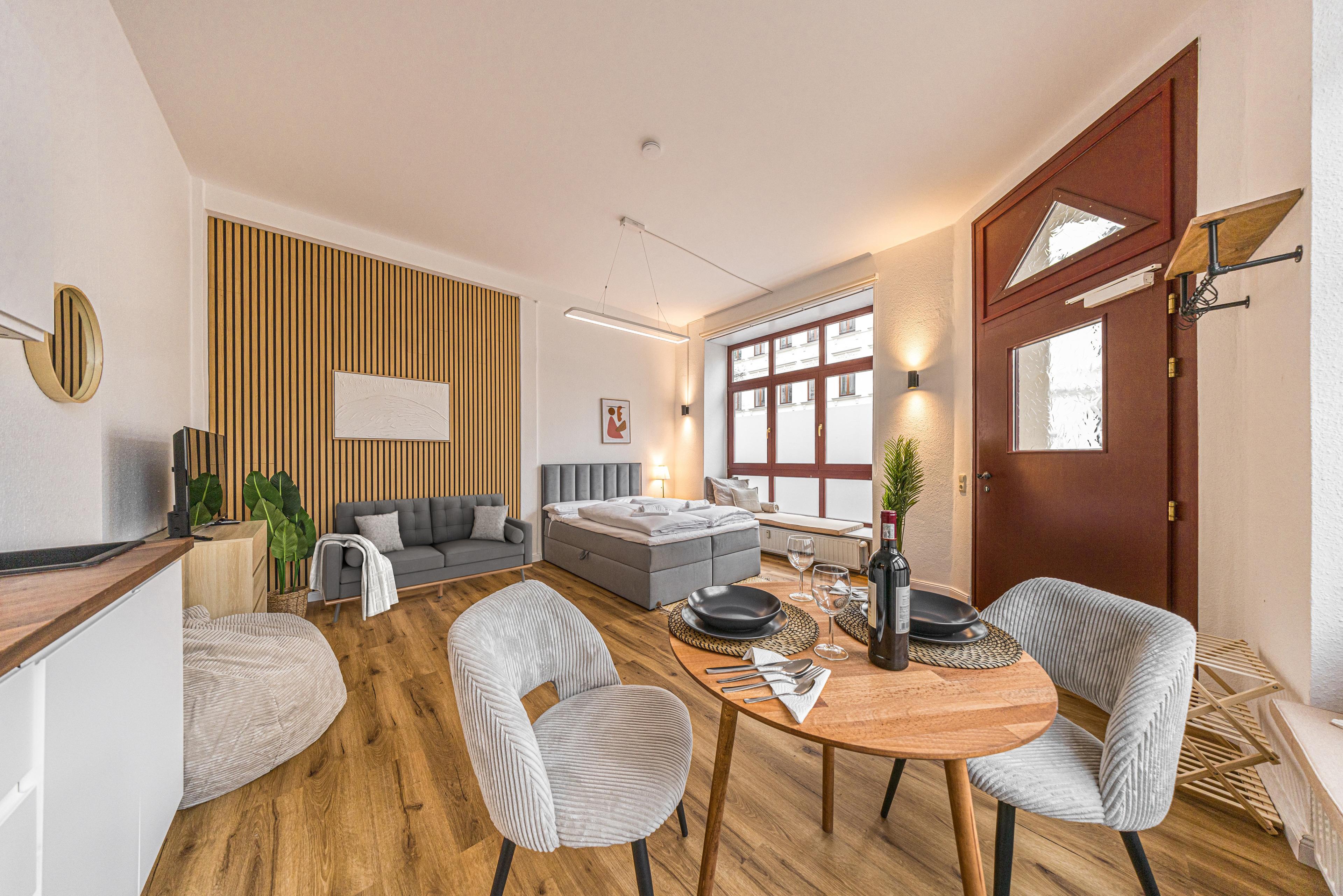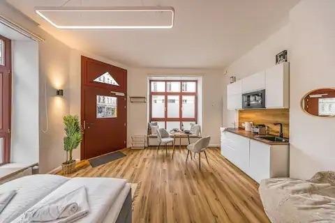 Die Wohnung ist geschmackvoll eingerichtet und verfügt über ein gemütliches Schlafzimmer mit einem bequemen Doppelbett und einem Schlafsofa sowie einer helle Küche mit einem Esstisch, welcher sich ebenso für das Homeoffice eignet. Die moderne Küche ist voll ausgestattet mit allem, was Sie benötigen, um Ihre Mahlzeiten zuzubereiten. Das Badezimmer ist neu und verfügt über eine Dusche.