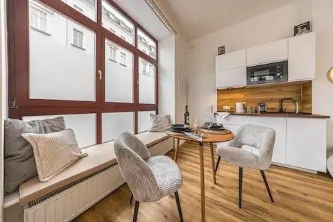 Das Apartment ist geschmackvoll eingerichtet und verfügt über ein gemütliches Schlafzimmer mit einem komfortablen Doppelbett und eine helle Küche mit Esstisch, die auch für ein Home-Office geeignet ist. Die moderne Küche ist komplett mit allem ausgestattet, was man braucht, um seine Mahlzeiten zuzubereiten. Das Bad ist neu und verfügt über eine Dusche.