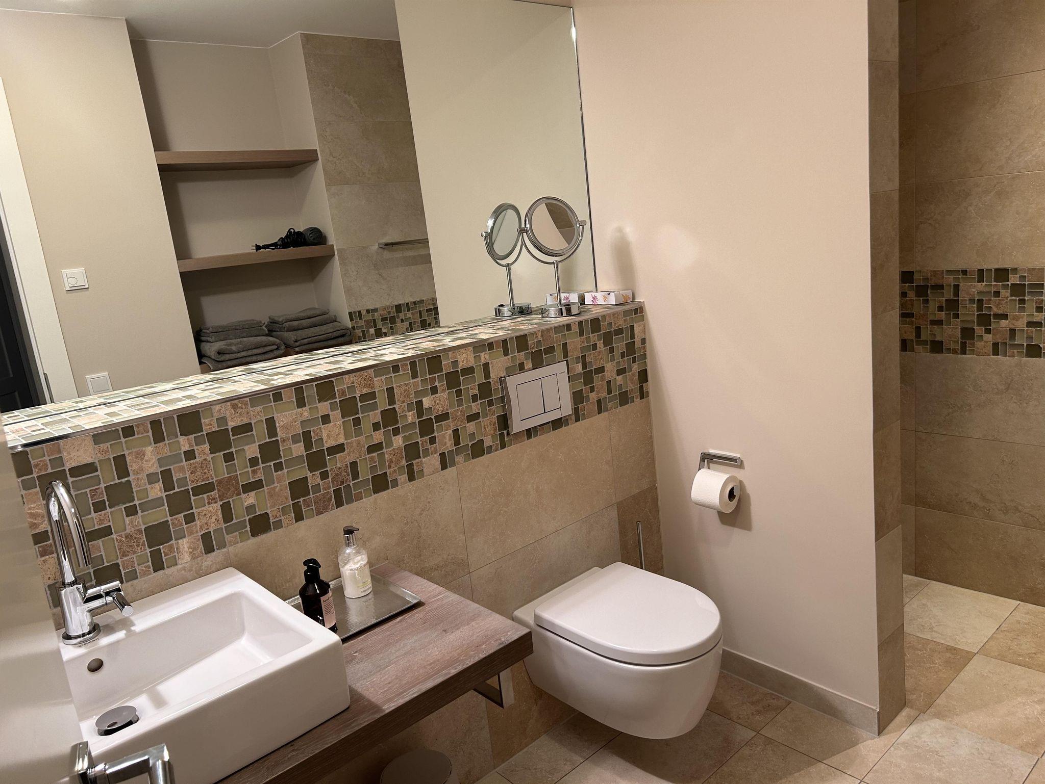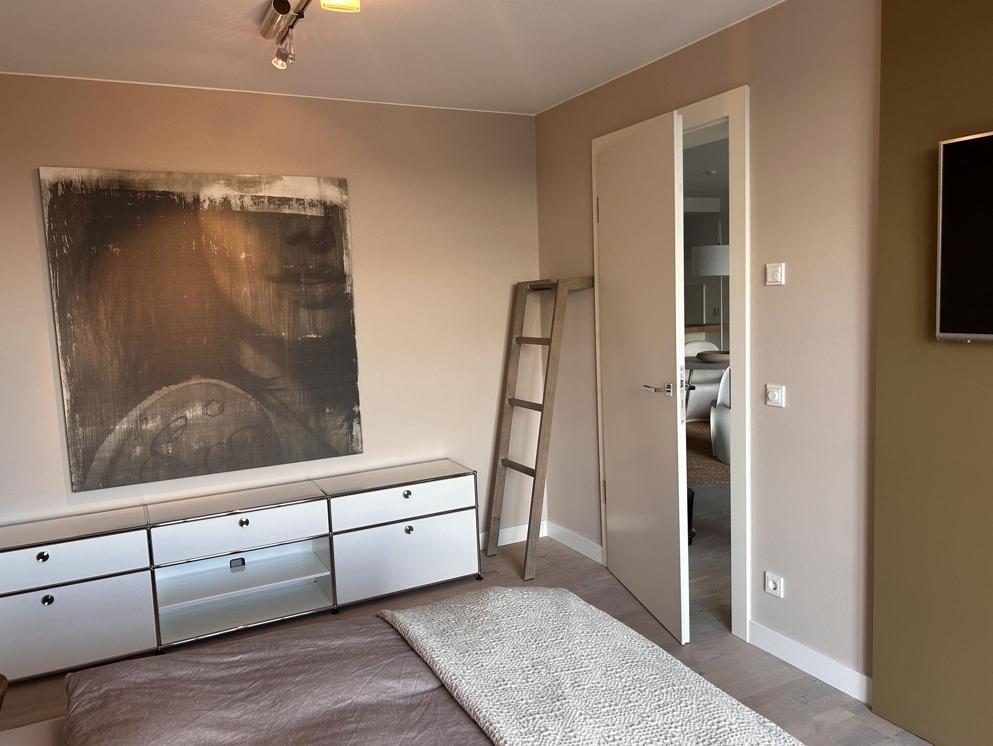 Unsere Wohnung ist modern und hochwertig eingerichtet. Eine komplett ausgestattete Küche mit Kaffeemaschine, Toaster, Backofen, Kühlschrank hat alles was Sie brauchen. Das Wohnzimmer und auch das Schlafzimmer haben jeweils einen Zugang zur Terrasse. Bad mit ebenerdiger Dusche.