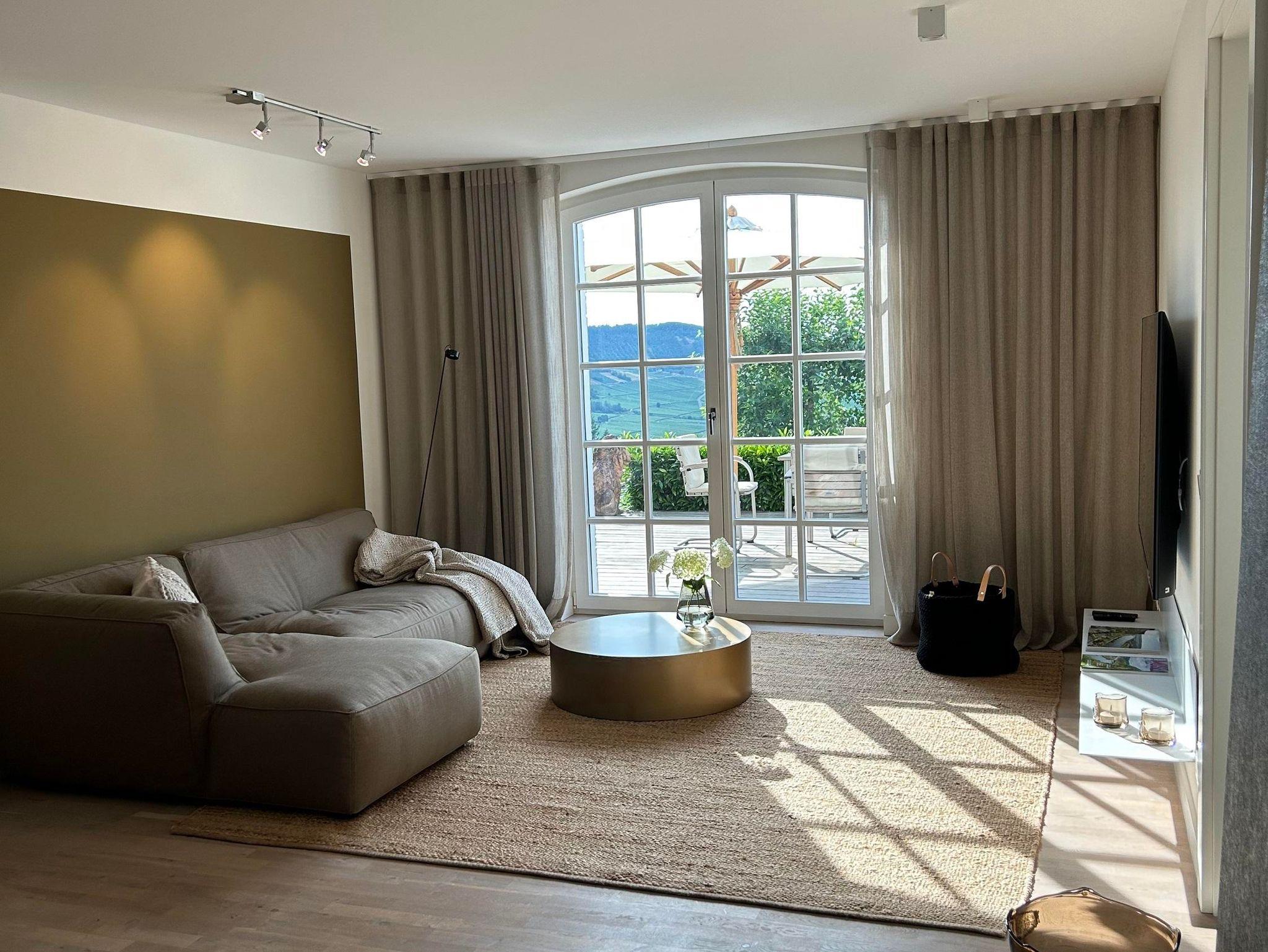 Die Ferienwohnung ist modern und hochwertig eingerichtet, mit offenem Wohnraum kombiniert Wohnzimmer mit Essbereich und Küche; das Schlafzimmer separat, ebenfalls mit Zugang zur Terrasse mit Moselblick; ein Bad mit begehbarer Dusche.
