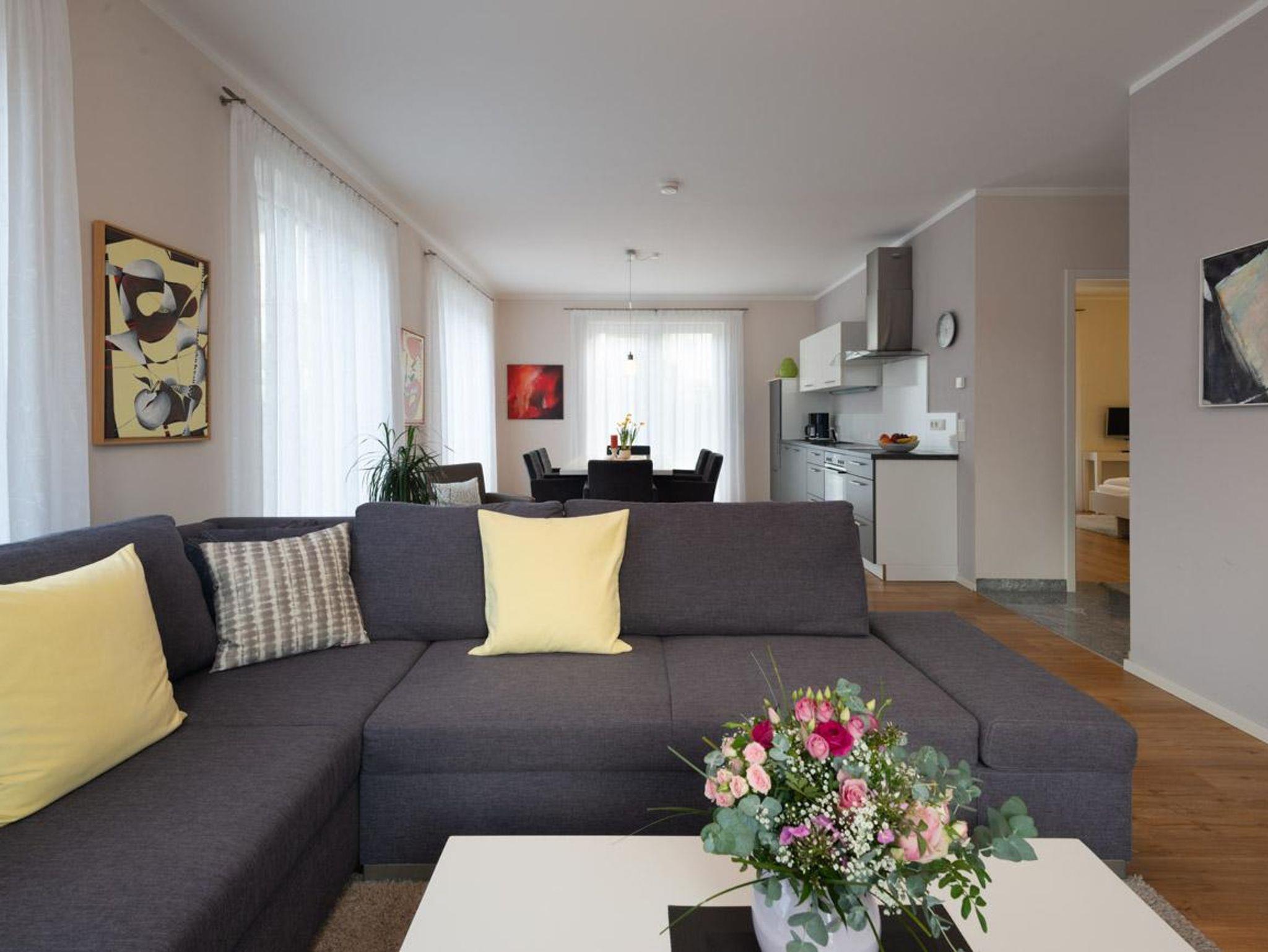Mit viel Liebe zum Detail eingerichtete Wohnung, großes Wohnzimmer mit Sofabett, 2 Doppelschlafzimmer, 2 Badezimmer mit Dusche/WC, bzw. Bad/WC, TV, Stereo-Kompaktanlage, Telefon und Balkon.