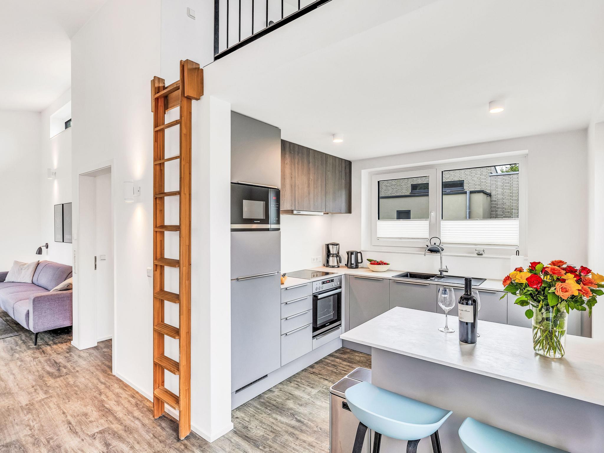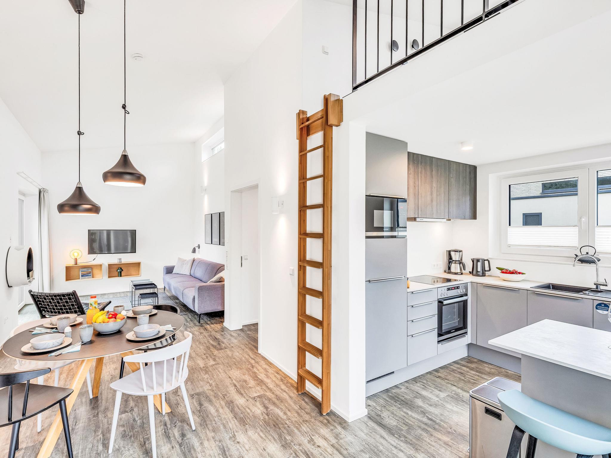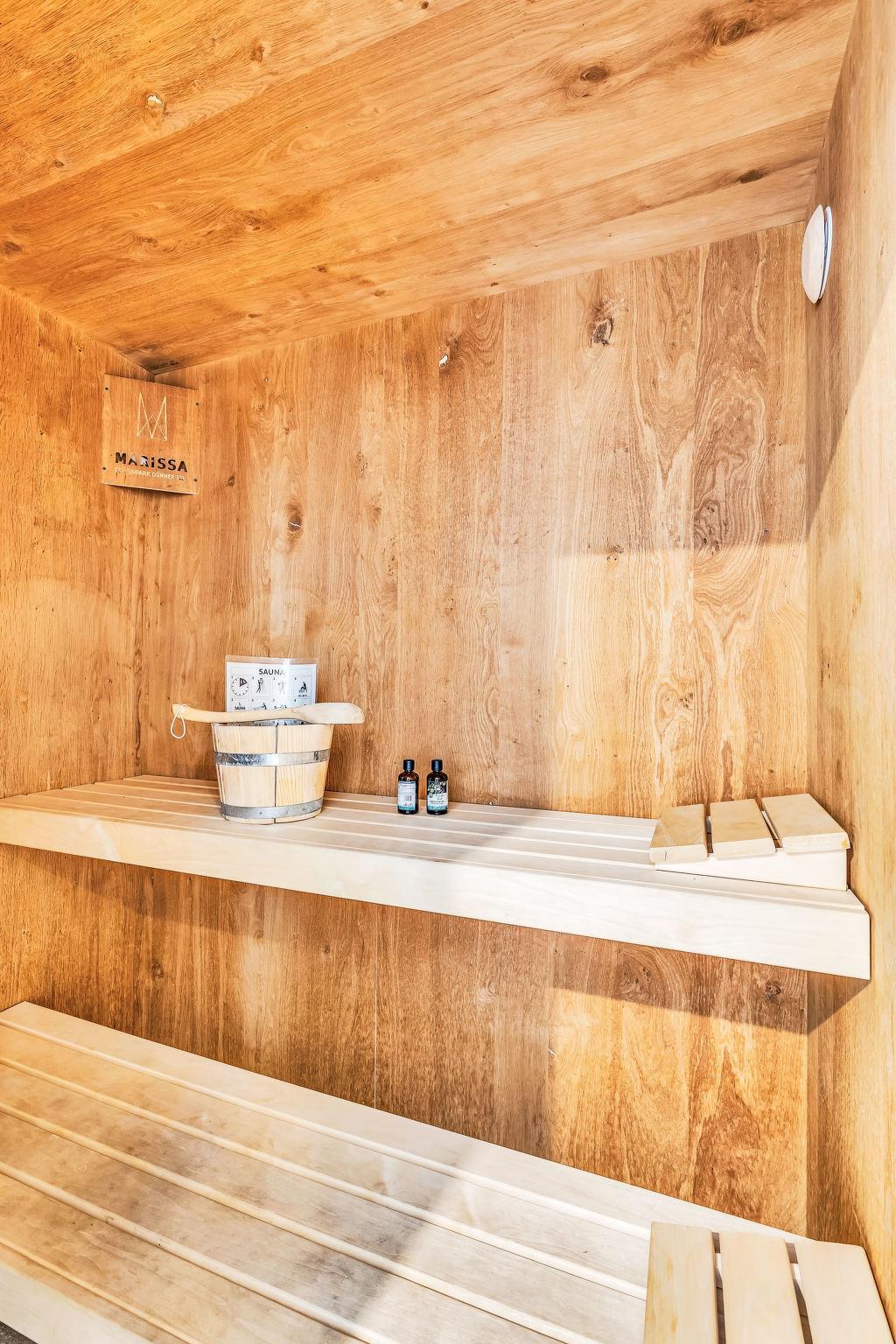 "Goldfisch", 3-room house 85 m2 on 2 levels. Tasteful and cosy furnishings: living/dining room with satellite TV (flat screen). Exit to the terrace. 2 rooms, each room with 1 double bed (2 x 90 cm, length 200 cm). Open kitchen (oven, dishwasher, 4 ceramic glass hob hotplates, toaster, kettle, microwave, electric coffee machine). Bath/WC, shower/WC. Upper floor: (ladder) open gallery with sloping ceilings with 2 sleeping facilities. Terrace. Terrace furniture, electric barbecue. Facilities: washing machine, dryer, sauna, children's high chair (extra), hair dryer. Internet (WiFi, free). Please note: non-smoking house. 1 small pet/ dog allowed. Smoke alarm.