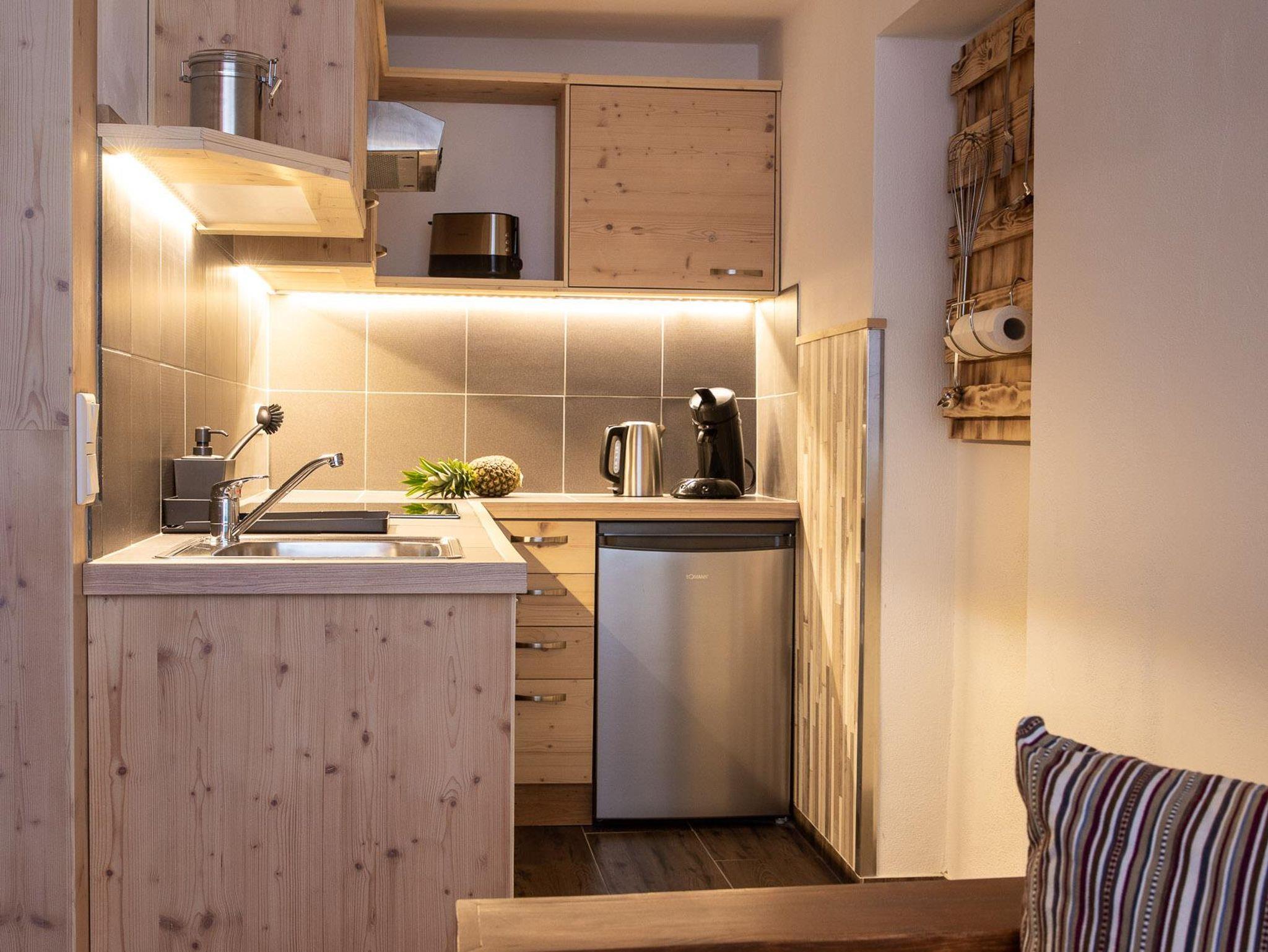Vollausgestattete Küche mit Spülmaschine, Kühlschrank mit Gefrierabteil, Wasserkocher, Toaster, Kaffeemaschine (Pads), Backofen, Ceranfeld