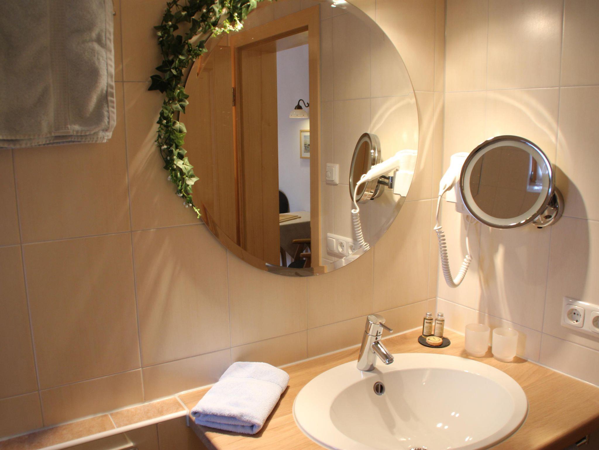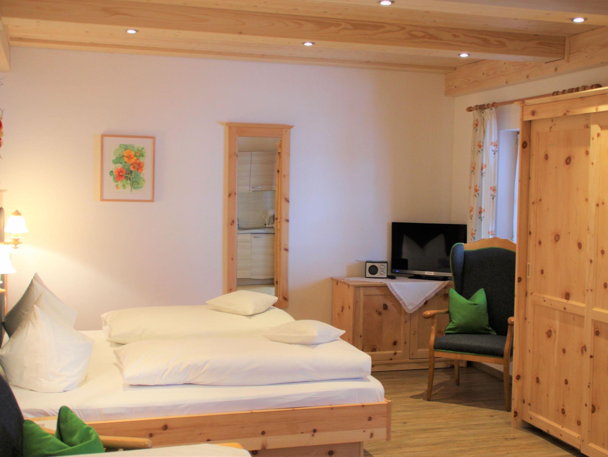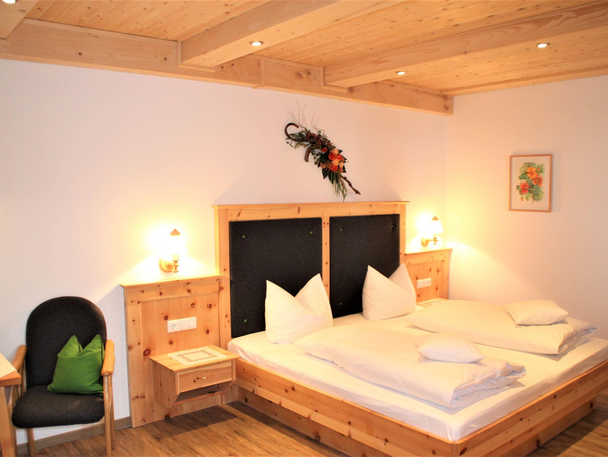 Gemütliches 4-Sterne-Doppelzimmer im bäuerlichem Landhausstil in Zirbe eingerichtet mit Küchenzeile/ DU/WC/Sat-TV/ Balkon mit Garten- und Bergblick.