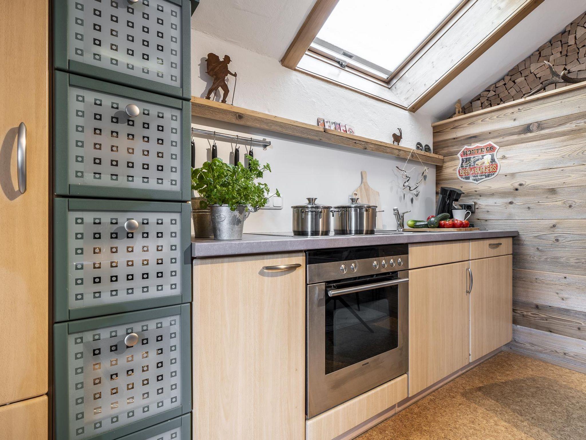 Eine komplett ausgestattete Wohnküche mit Esstisch.
