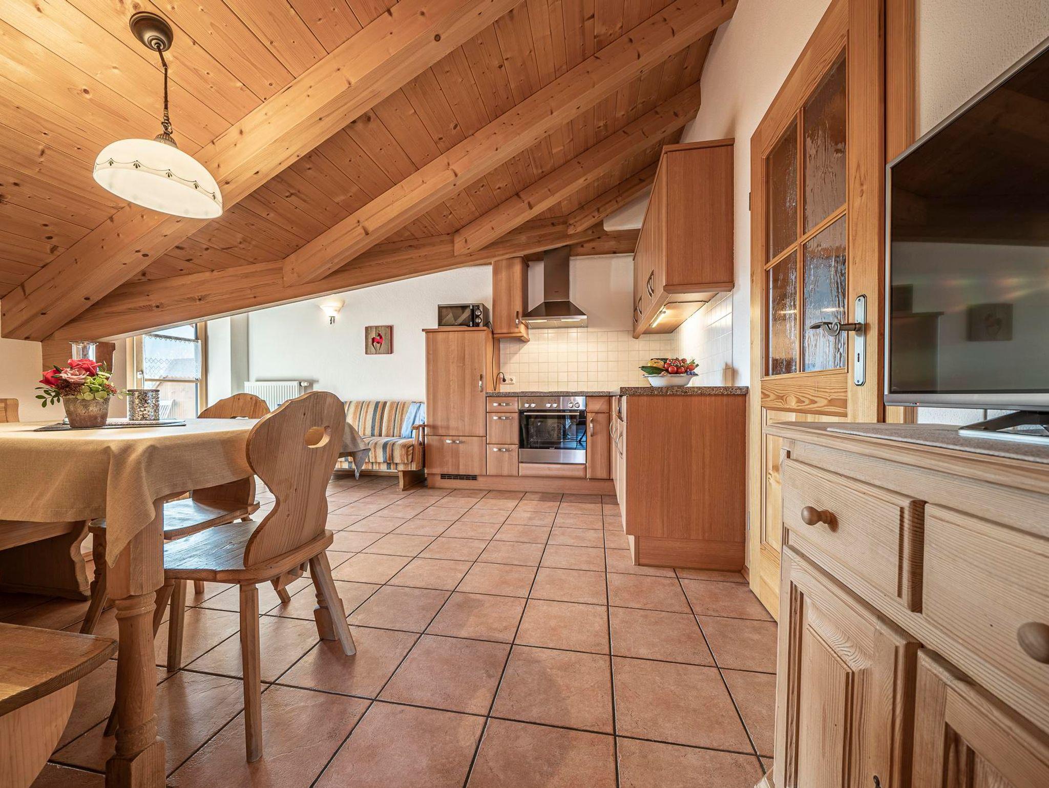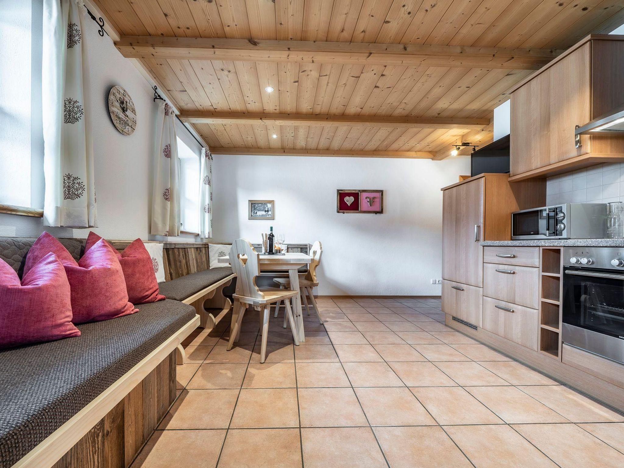 **** Wohnung im 1. Stock mit zwei handgefertigten Schlafzimmern aus Eichen- und Zirbenholz, einer komplett ausgestatteten Wohnküche mit Spülmaschine, Backofen, Mikrowelle, Kaffeemaschine und Fachbildfernseher. Bad mit Dusche/WC, Hand- und Badetücher, Handtuchtrockner, Kosmetikartikel und Fön. Großer möblierter Balkon mit unverbauter Bergsicht.