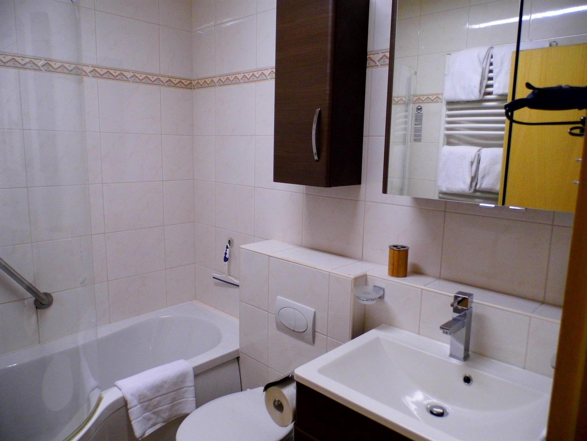Badezimmer mit WC: Badewannen-Duschkombination, Handtuchheizkörper, Fön.