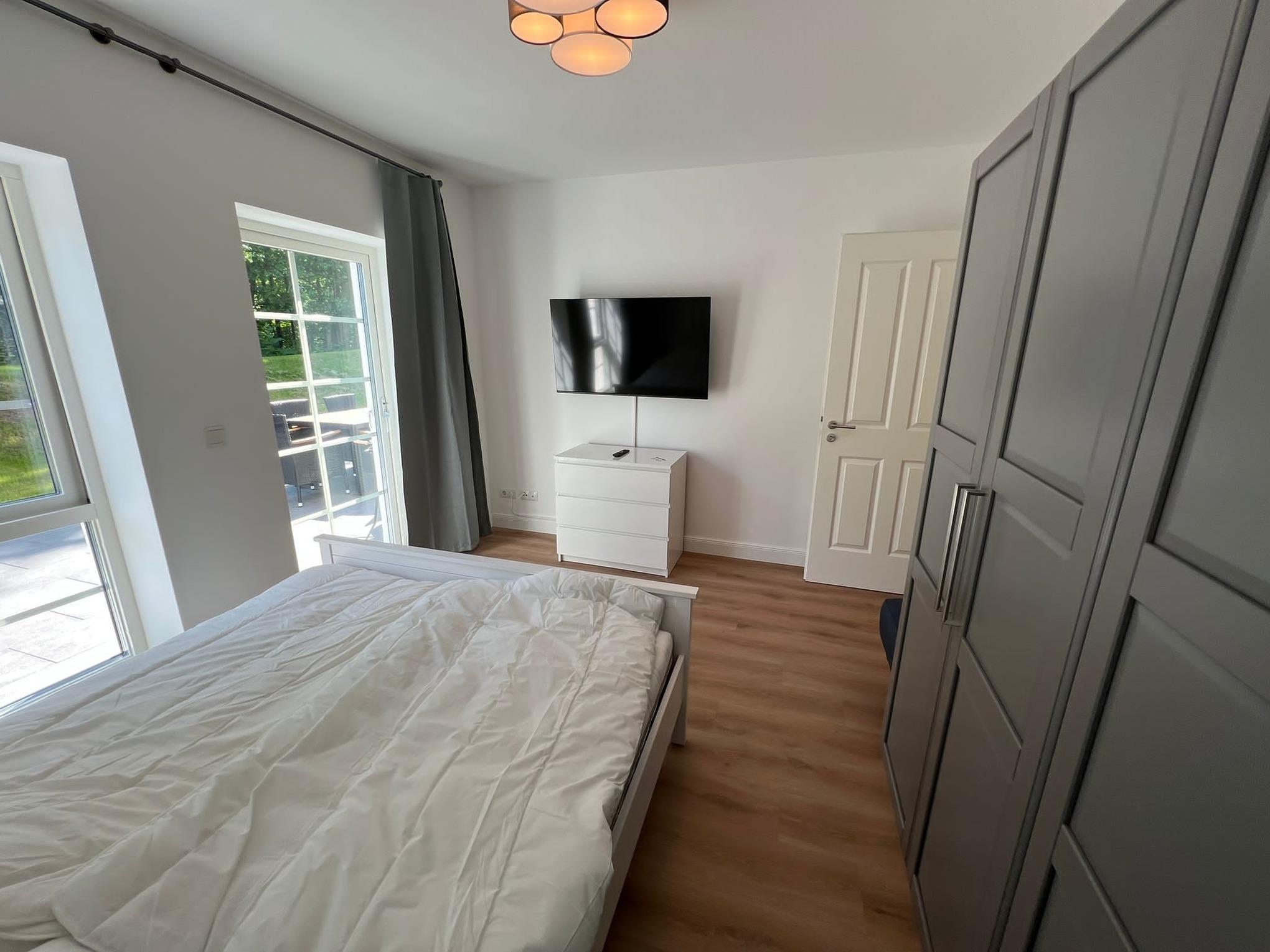 • Schlafzimmer (ca. 16 m²) mit Doppelbett (2x90x200 cm), Kleiderschrank, TV und Zugang zur großen, überdachten Terrasse