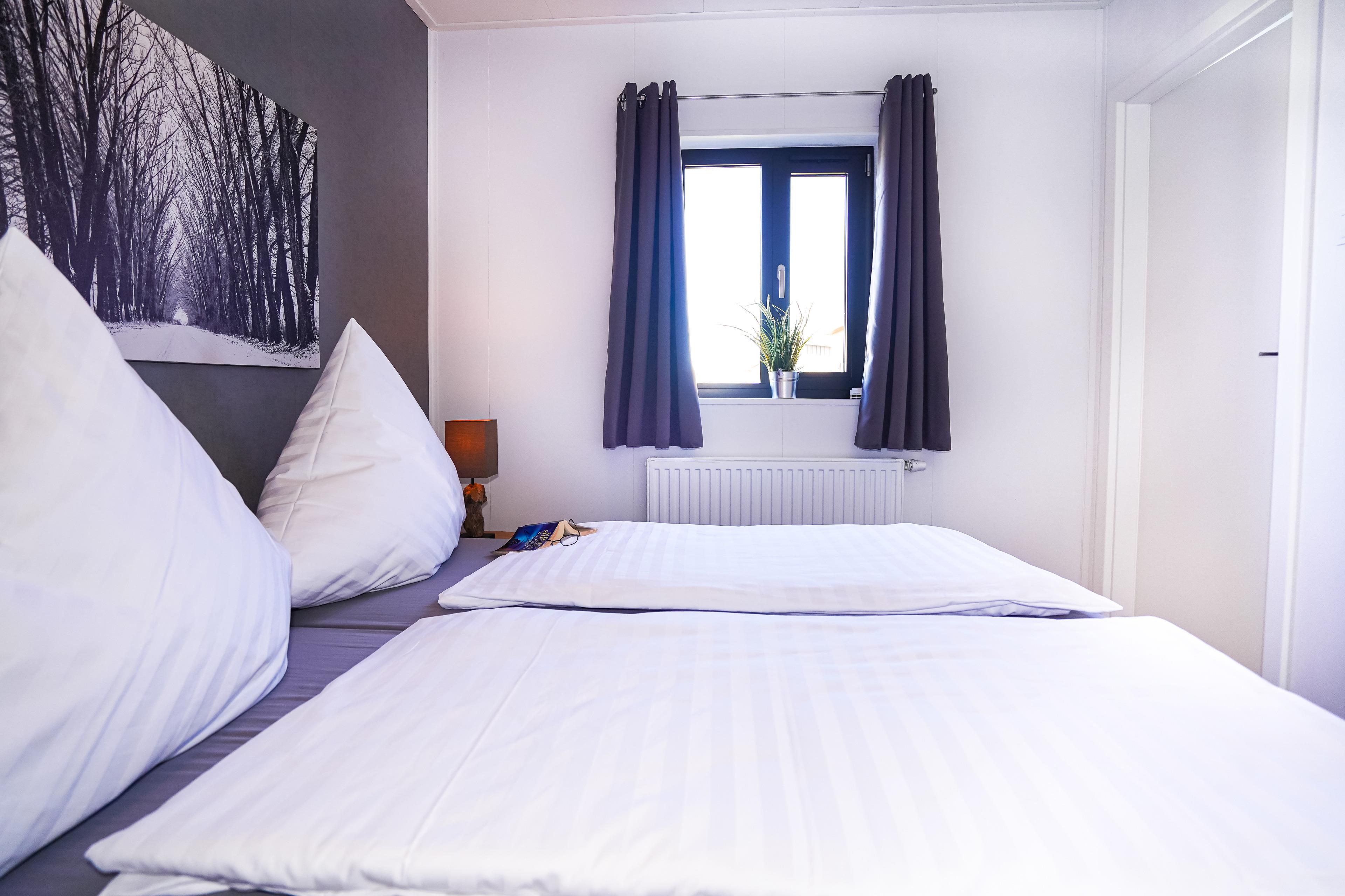 Diese gemütlichen Unterkünfte bieten Platz für bis zu 4 Personen und sind perfekt für einen entspannten Urlaub. Jedes Mobilheim verfügt über eine voll ausgestattete Küche mit Gasherd und Mikrowelle, Kühl- und Gefrierkombination, Geschirrspüler, Kaffeemaschine und Wasserkocher. Ein modernes Badezimmer mit Dusche, WC und Waschtisch sowie zwei einladende Schlafzimmer (ein Doppelbett 2x80x200cm und zwei Einzelbetten 80x200cm) sorgen für Ihren Komfort.