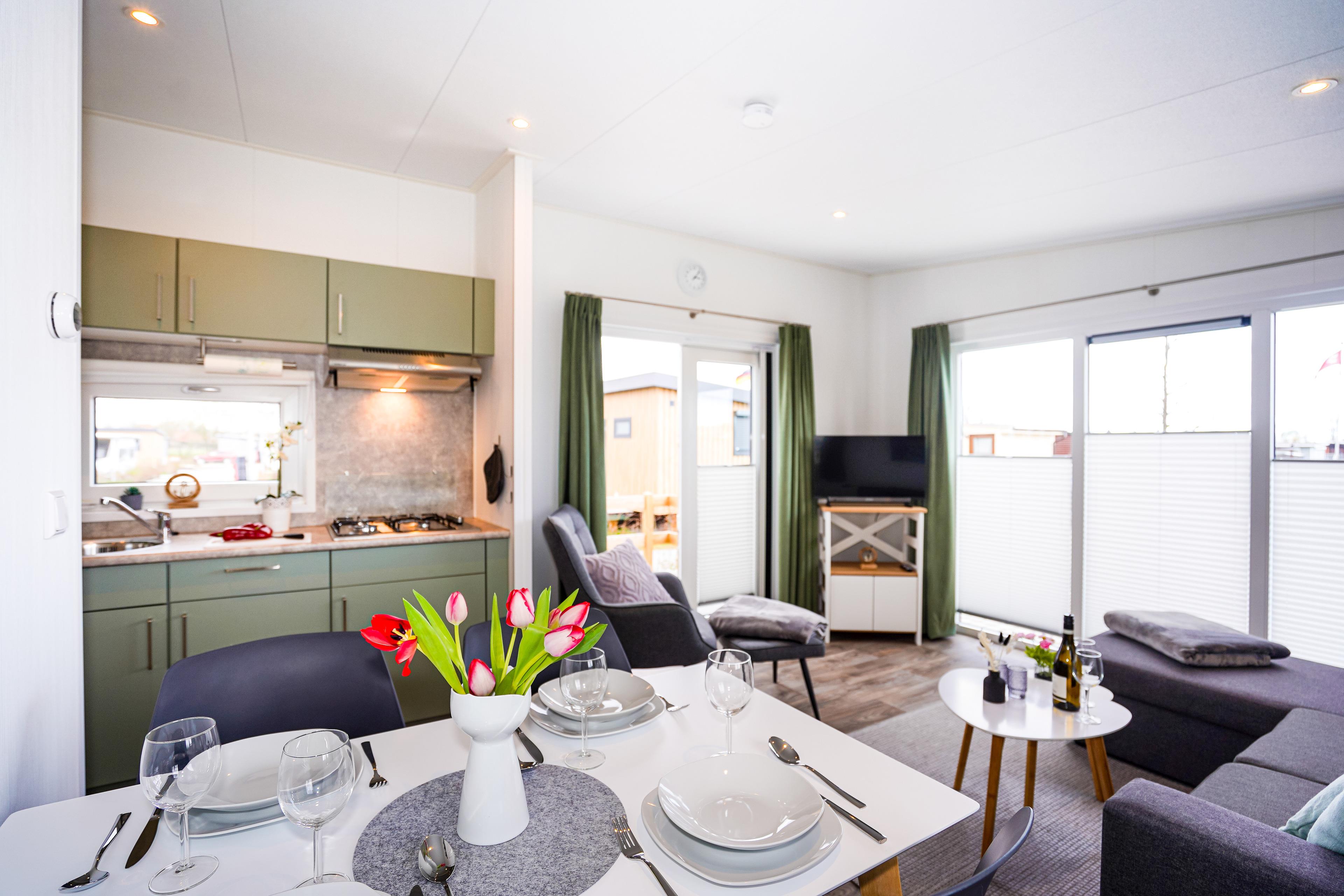 Diese gemütlichen Unterkünfte bieten Platz für bis zu 4 Personen und sind perfekt für einen entspannten Urlaub. Jedes Mobilheim verfügt über eine voll ausgestattete Küche mit Gasherd und Mikrowelle, Kühl- und Gefrierkombination, Geschirrspüler, Kaffeemaschine und Wasserkocher. Ein modernes Badezimmer mit Dusche, WC und Waschtisch sowie zwei einladende Schlafzimmer (ein Doppelbett 2x80x200cm und zwei Einzelbetten 80x200cm) sorgen für Ihren Komfort.