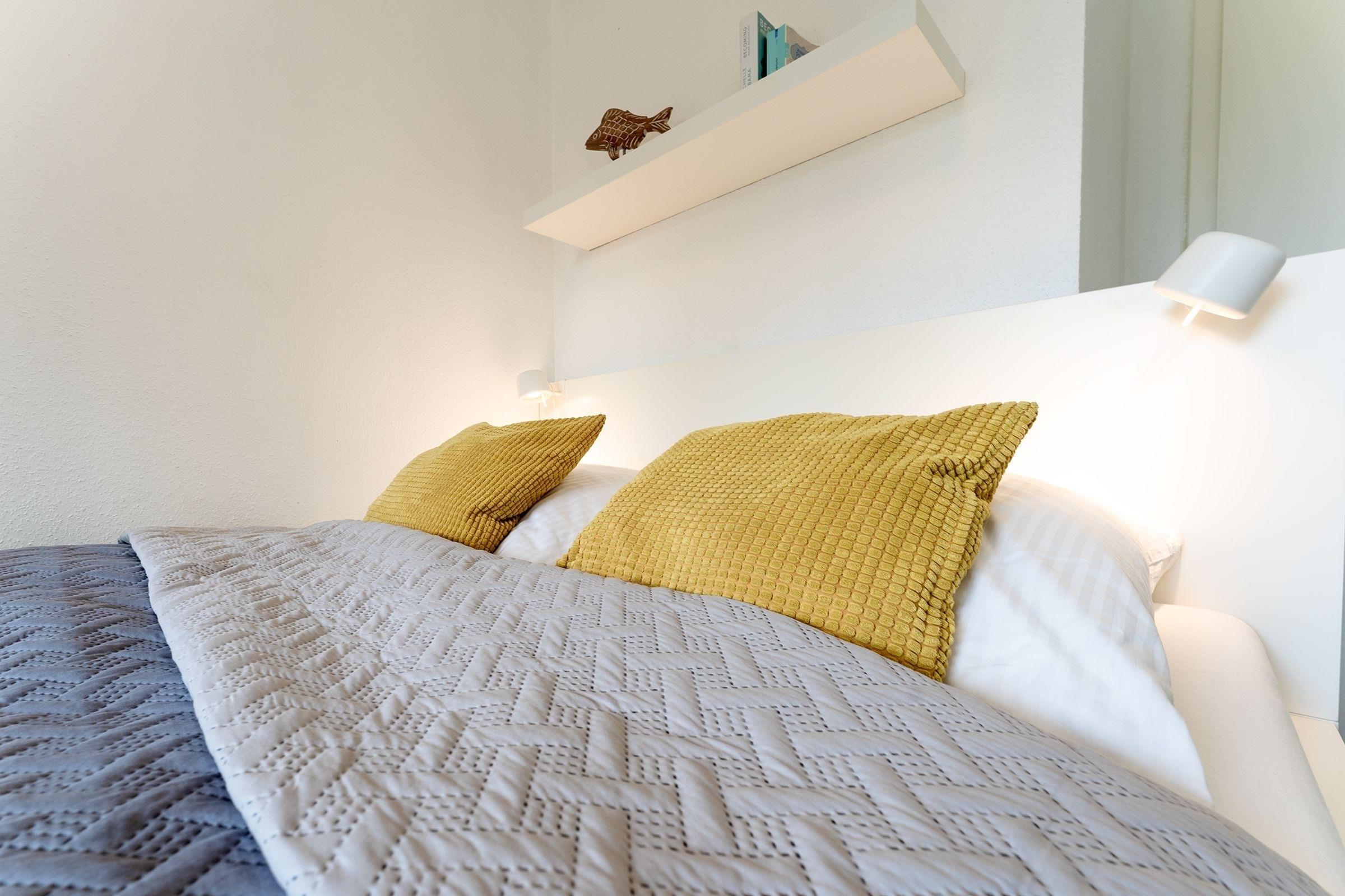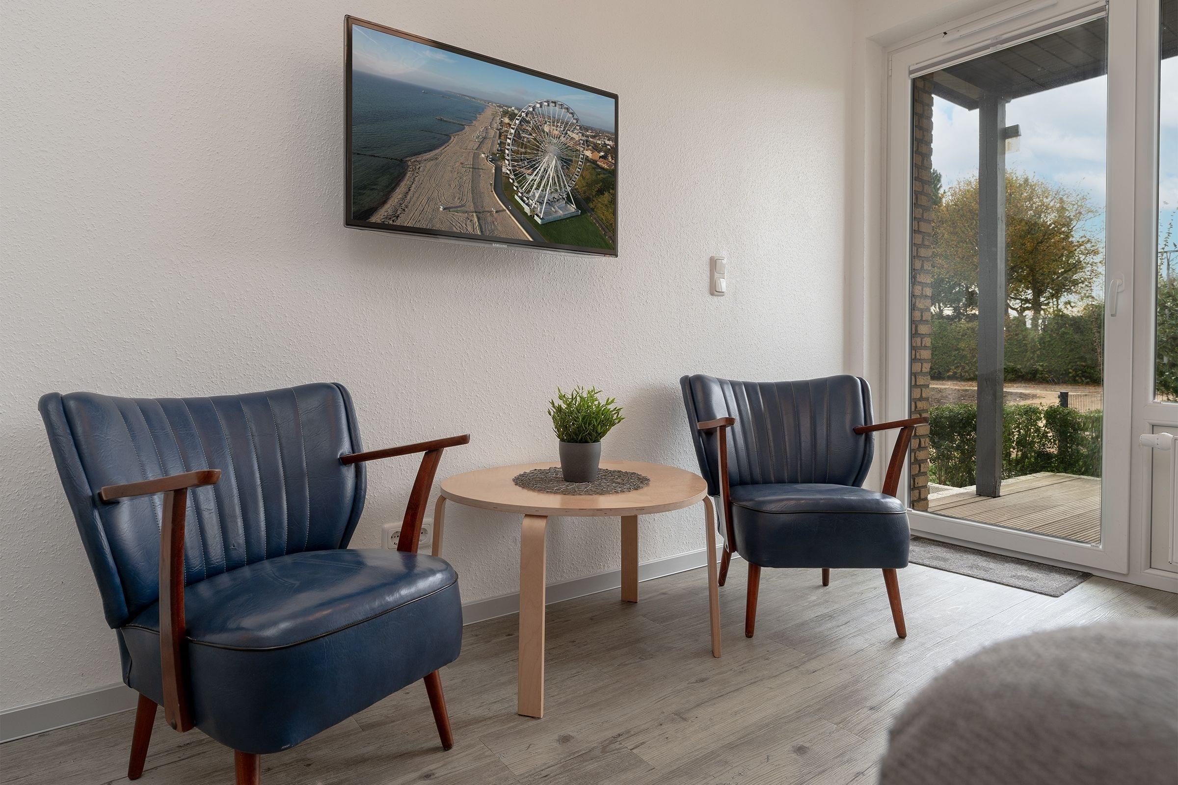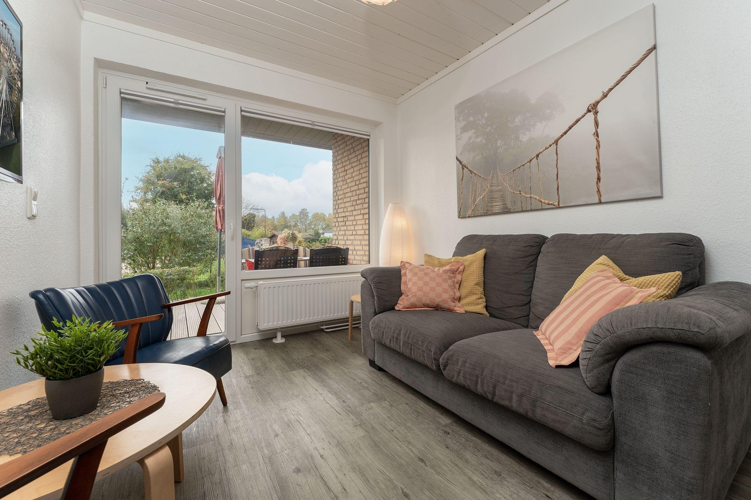 Im Wohnzimmer mit Sofa, Sessel und TV befindet sich eine offene Küche ausgestattet mit Herd, Backofen, Mikrowelle, und vieles mehr. Von hier haben Sie Zugang zu Ihrer Terrasse und dem Gemeinschaftsgarten. Das Badezimmer überzeugt mit einer bodentiefer Dusche, Fußbodenheizung und beheizbarem Handtuchhalter. Ein Schlafzimmer verfügt über ein Doppelbett (160x200 cm) und ein zweites TV Gerät, ein weiteres Schlafzimmer über 2 Einzelbetten (90x200 cm). Der WLAN-Anschluss ist selbstverständlich inklusive.