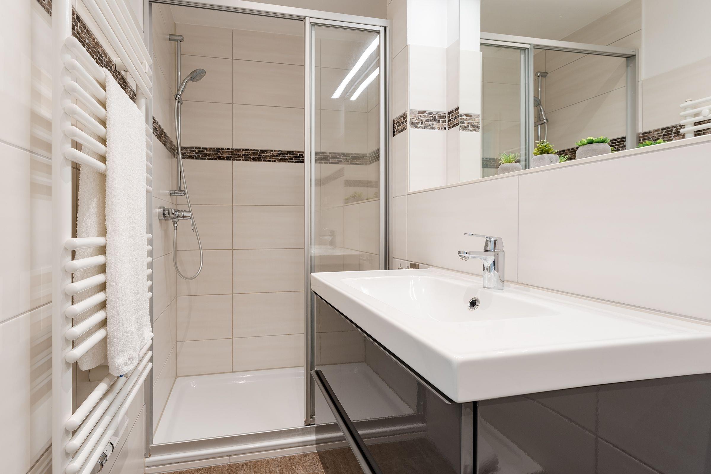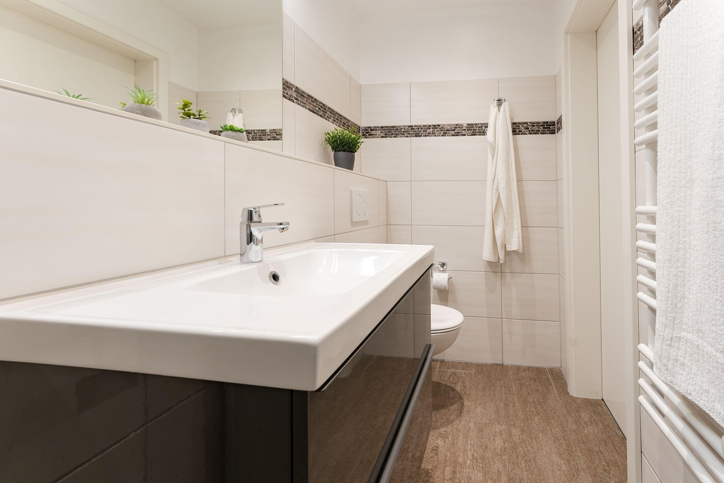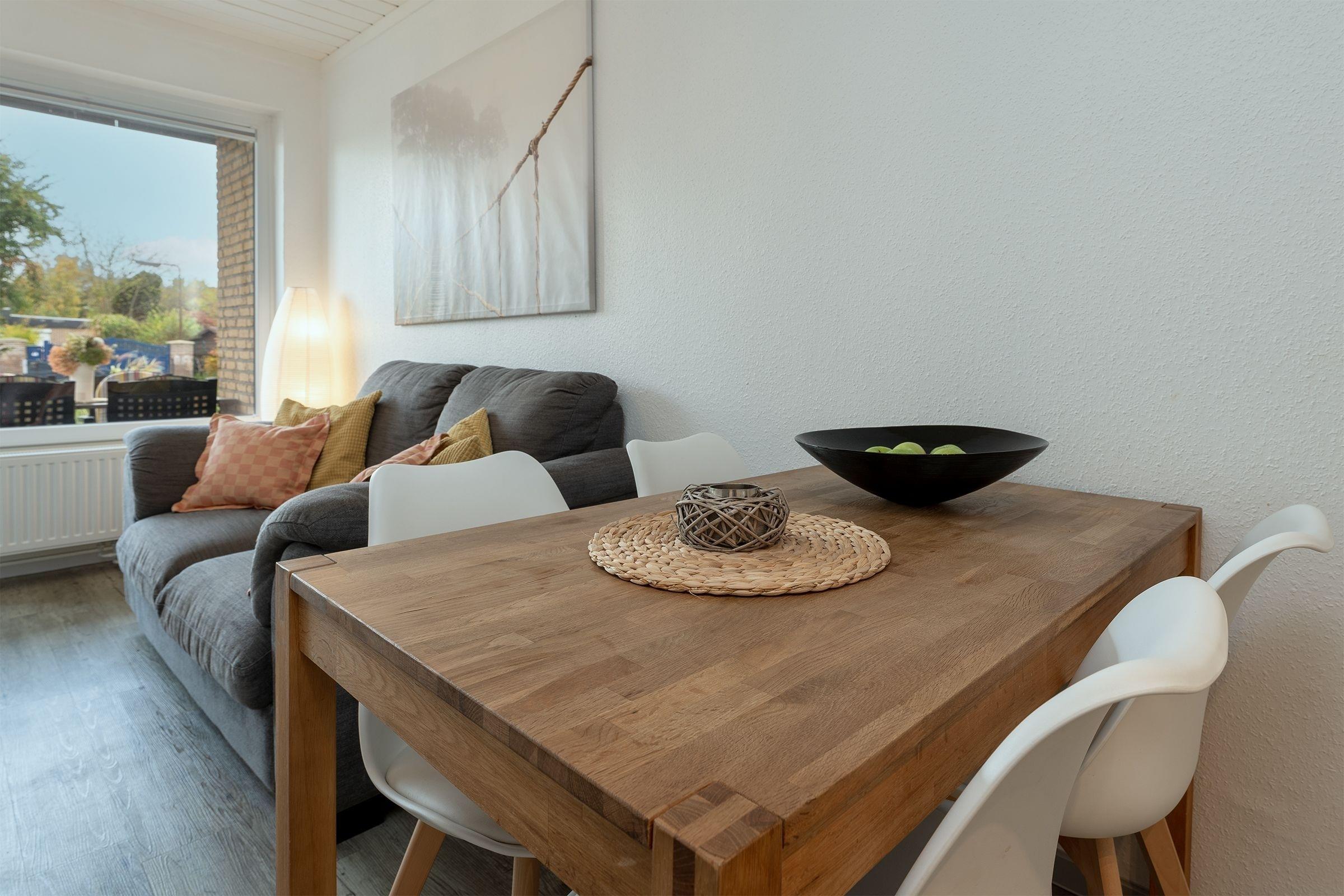 Im Wohnzimmer mit Sofa, Sessel und TV befindet sich eine offene Küche ausgestattet mit Herd, Backofen, Mikrowelle, und vieles mehr. Von hier haben Sie Zugang zu Ihrer Terrasse und dem Gemeinschaftsgarten. Das Badezimmer überzeugt mit einer bodentiefer Dusche, Fußbodenheizung und beheizbarem Handtuchhalter. Ein Schlafzimmer verfügt über ein Doppelbett (160x200 cm) und ein zweites TV Gerät, ein weiteres Schlafzimmer über 2 Einzelbetten (90x200 cm). Der WLAN-Anschluss ist selbstverständlich inklusive.