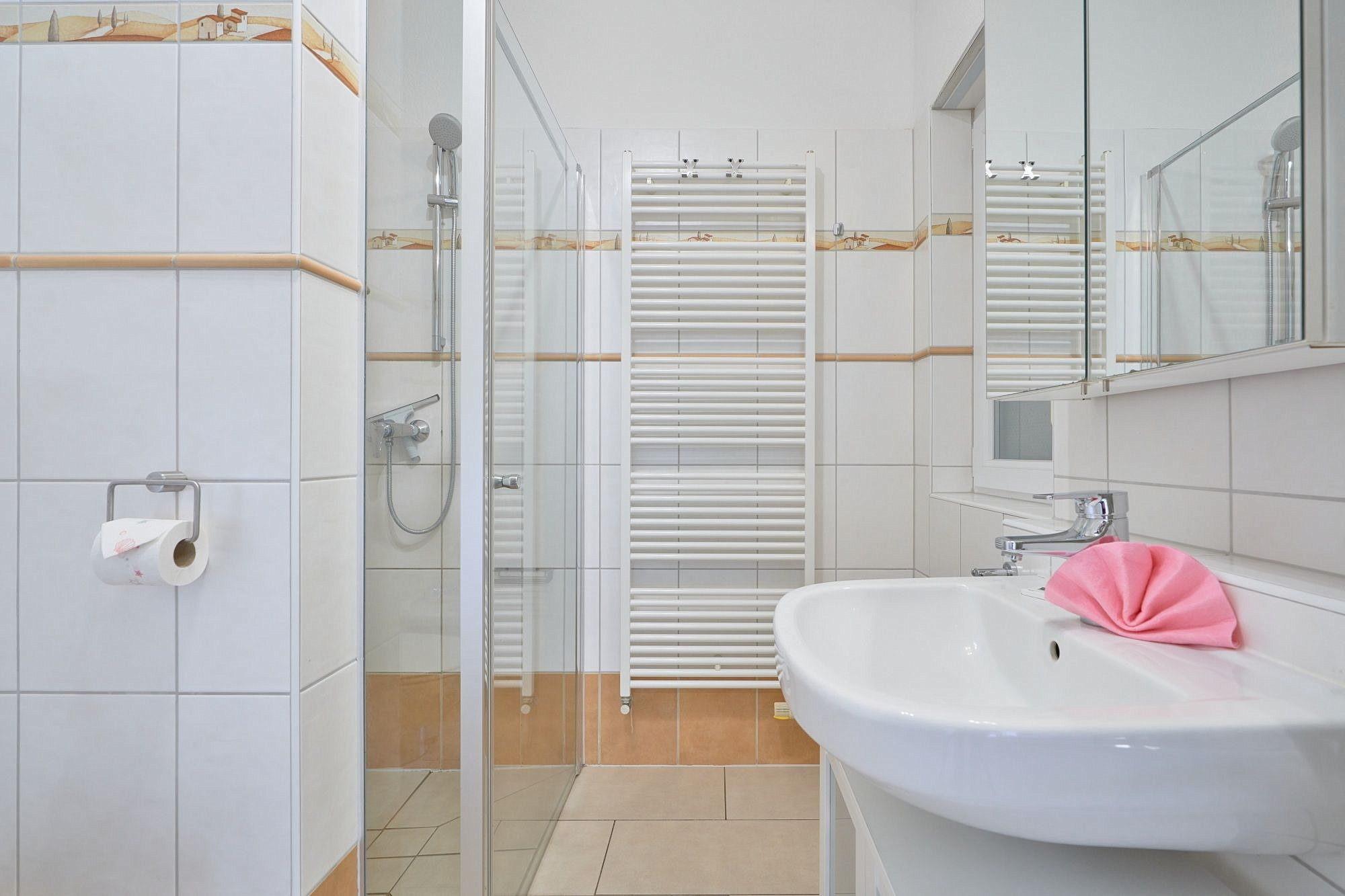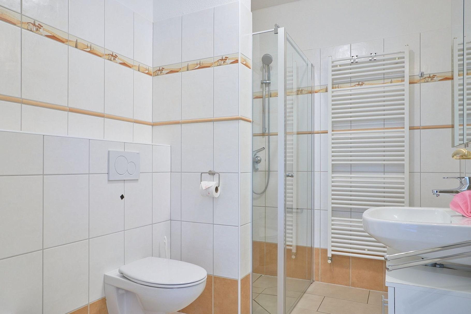 Modernes, hell gefliestes Tageslichtbad mit ebenerdiger Dusche, Urinal, WC und Waschbecken.