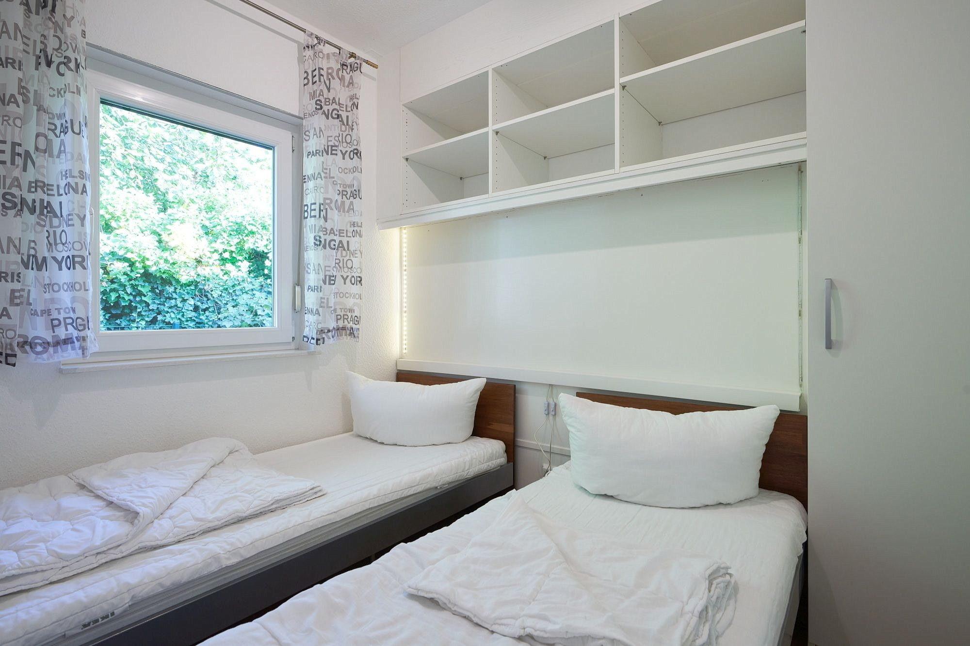 Separates Kinderzimmer mit 2 Einzelbetten (2x 80x200cm) und einem Kleiderschrank. Das Kinderzimmer ist gefliest und hat Fußbodenheizung. Das Fenster lässt sich durch einen elektrischen Außenrolladen vollständig verdunkeln.