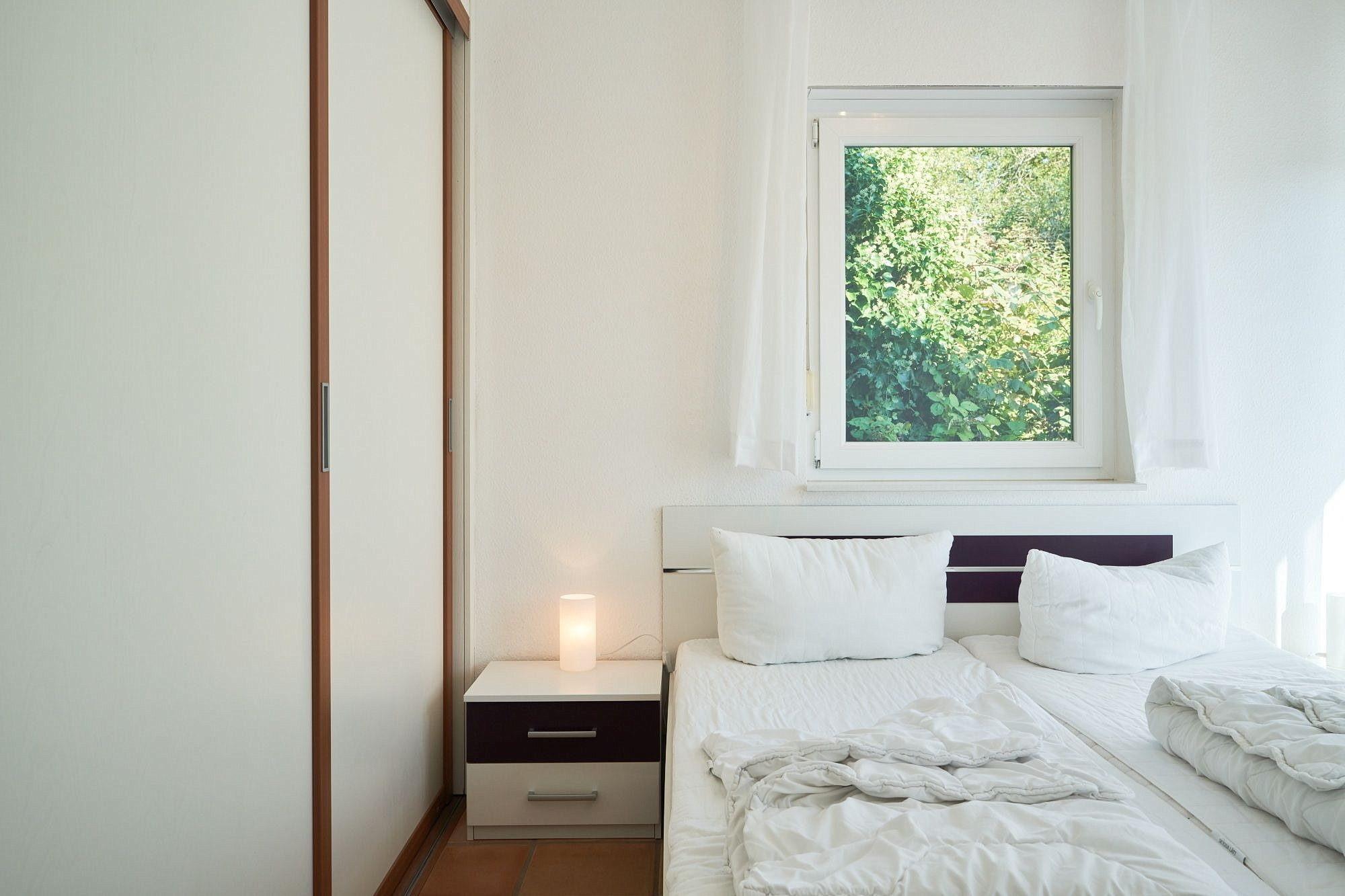 Modern eingerichtetes Schlafzimmer mit Doppelbett (2x 80x200cm) und einem Kleiderschrank. Das Zimmer ist gefliest und hat Fußbodenheizung. Die Fenster lassen sich z.T. durch einen elektrischen Außenrolladen vollständig verdunkeln.