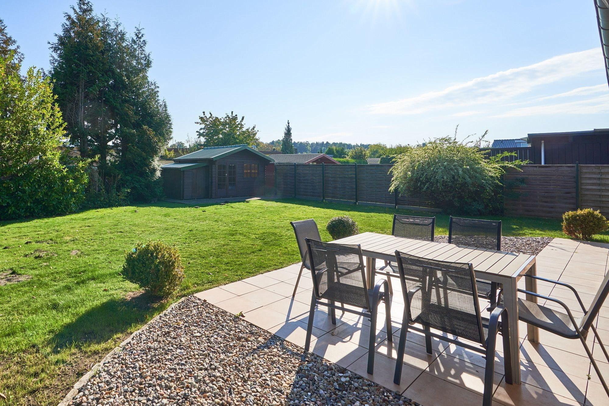 Großer, eingezäunter Garten mit kleinem Gartenhaus, großzügige Terrasse in südliche Richtung mit elektrischer Markise, 2 PKW-Abstellplätze direkt vor dem Haus. Fahrradunterstand. Waschmaschine (gegen Gebühr).