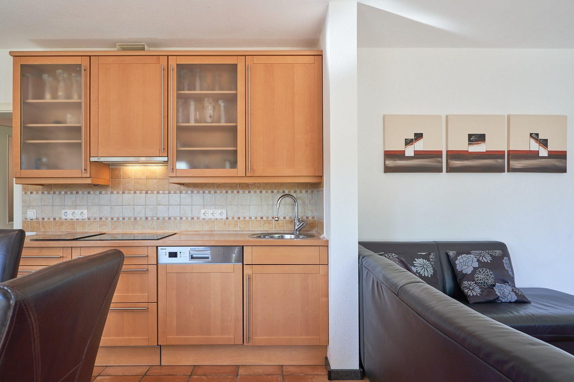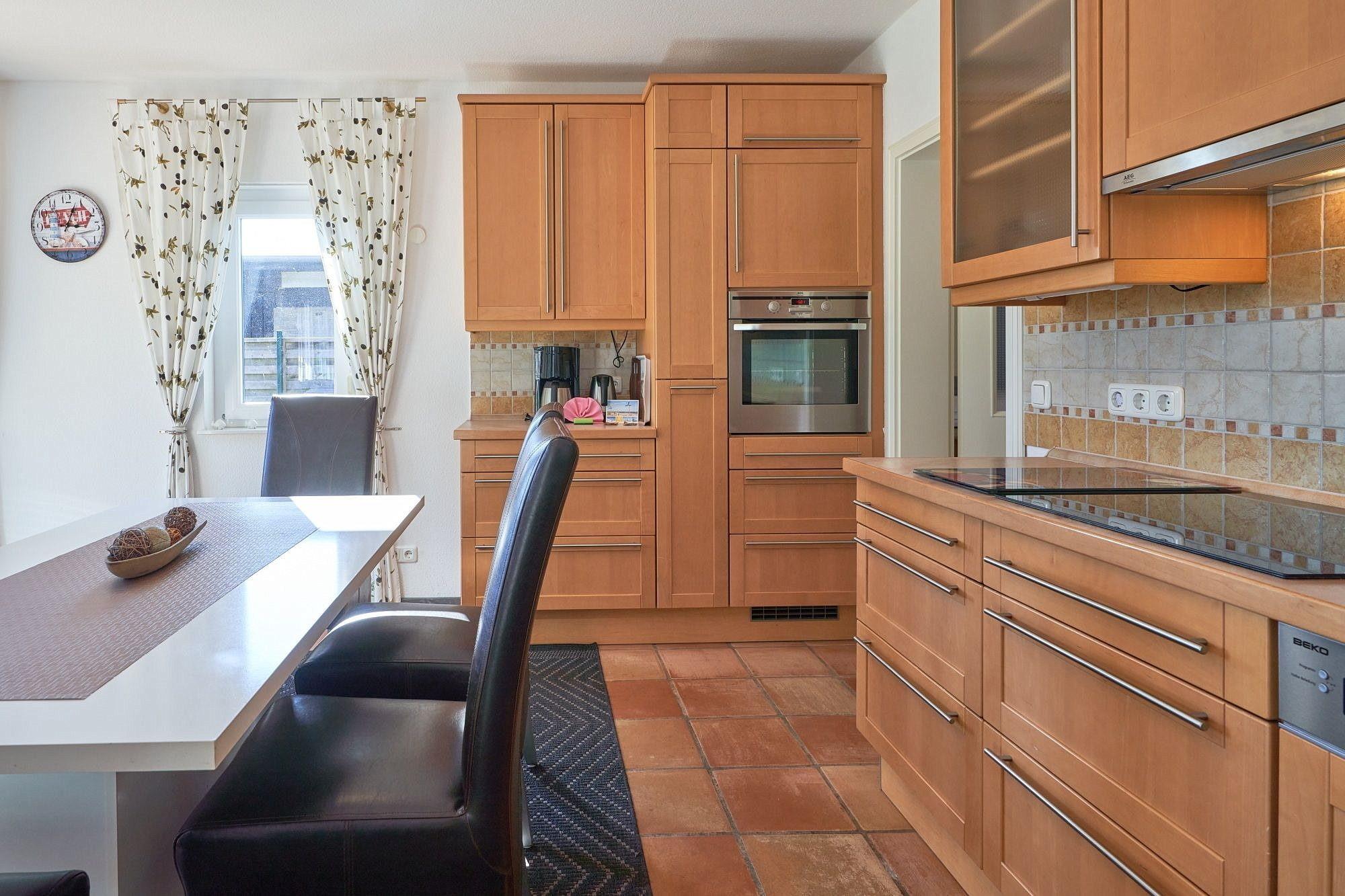 Moderne, komplett ausgestattete, zum Wohn- und Esszimmer offene Küche mit Induktionsherd, Backofen, Spülmaschine, Mikrowelle, Kühlschrank mit 3 Sterne Gefrierfach, Kaffeemaschine, Toaster, Wasserkocher, Mixer und Eierkocher.