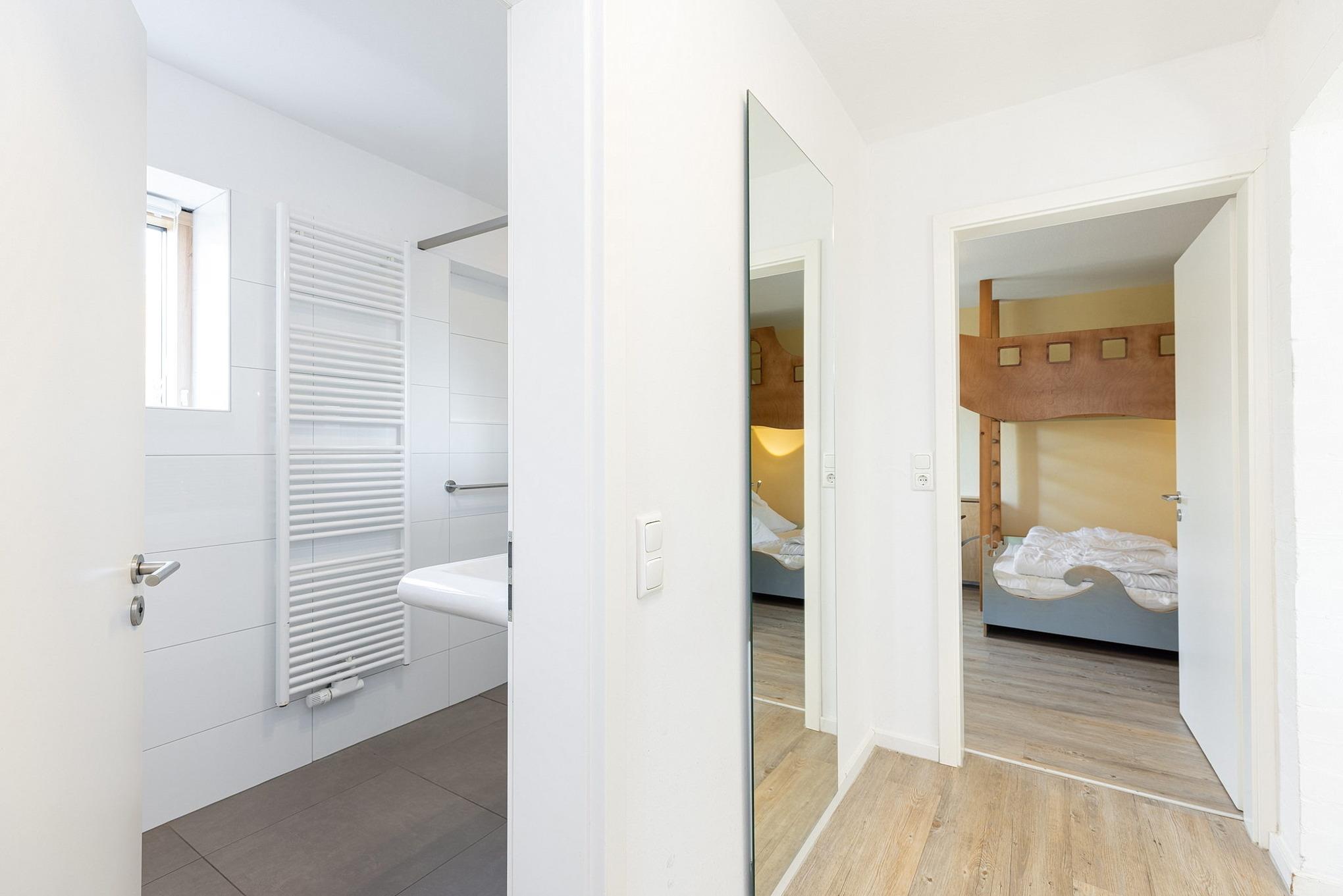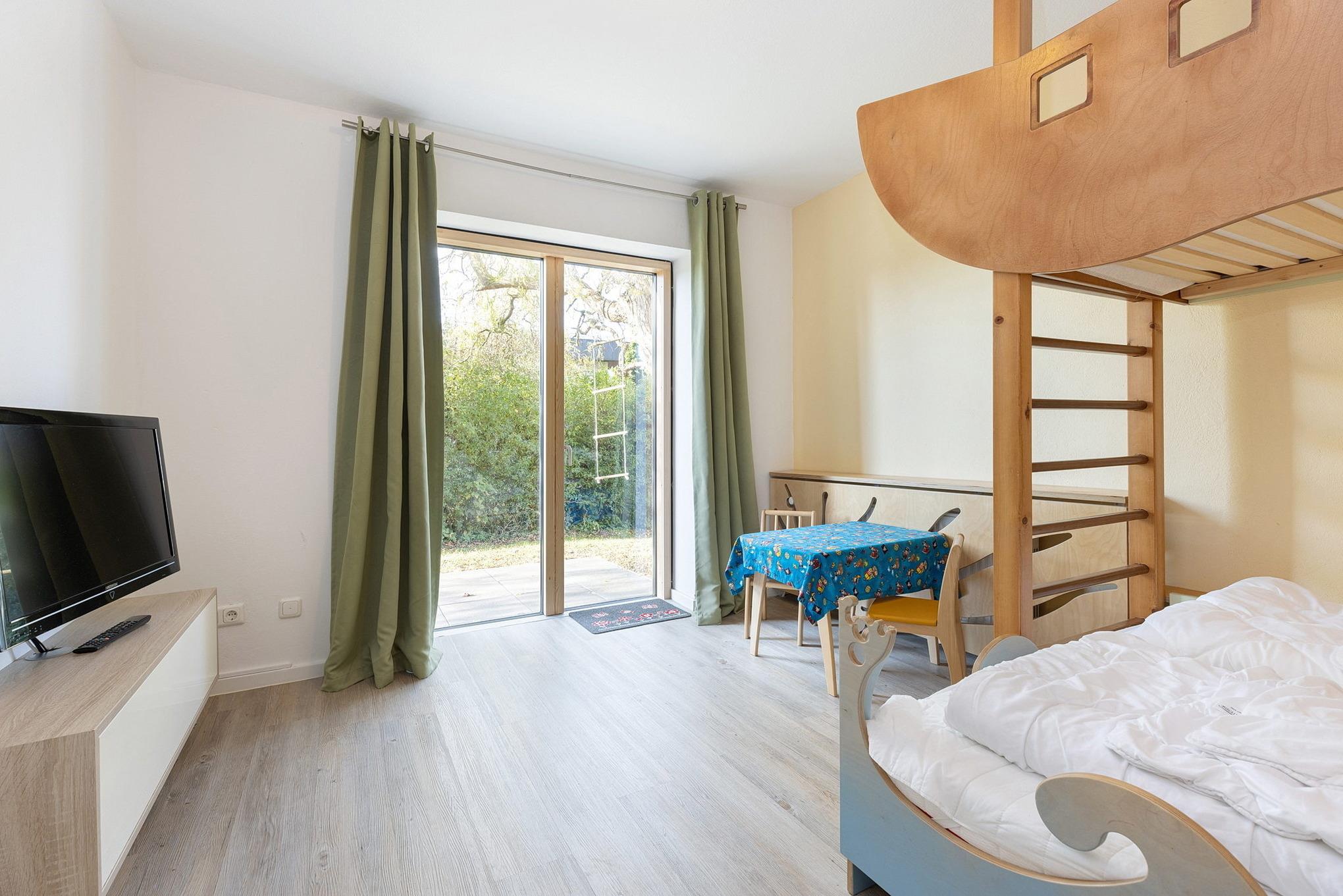 Separates Kinderzimmer mit einem Hochbett in Form eines Schiffes. Die Liegefläche beträgt unten 1,40 m x 2 m und oben 0,9 m x 2 m. Es bietet einen Raum, in den Kinder sich gern zwischendurch zum Spielen zurückziehen. Vom Kinderzimmer aus hat man direkten Zugang auf eine, kleine, nach Westen gelegene Terrasse. Die Terrassentür verfügt über einen Verdunklungsvorhang.