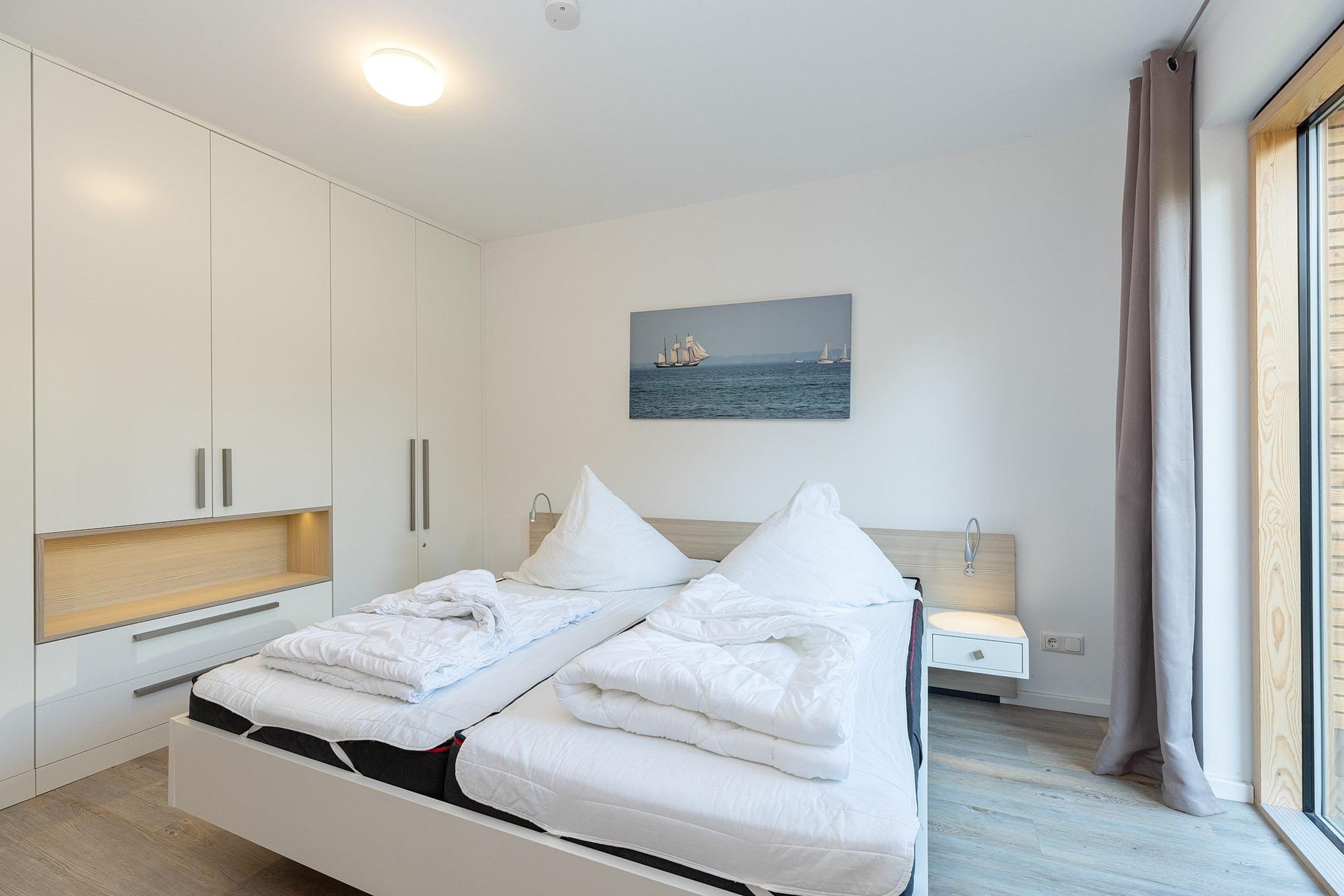Modern eingerichtetes Schlafzimmer mit Doppelbett (2x 90x200cm) und einem Kleiderschrank. Terrassentür an der Ostseite in Richtung Sonnenaufgang.