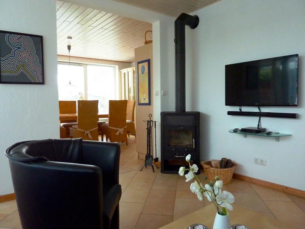 Die 4 Zimmer mit einem Dusch- und einem Vollbad sowie komplett eingerichteter moderner Küche und Wintergarten befinden sich auf einer Ebene im Erdgeschoss. Das mit einer Gaszentralheizung ausgestattete Einzelhaus ist für 5-7 Personen modern eingerichtet. Alle Räume sind mit Laminat oder schönen Fliesen versehen. Im Wohnraum finden Sie eine gemütliche Sitzgruppe, einen Kaminofen mit Sichtfenster, Sat-TV mit DVD/CD-Player. In zwei von den drei Schlafräumen befinden sich jeweils Doppelbetten, (1 mal 1,60 m x 2,00 m; 1 mal 1,80 m x 2,00 m groß). Im kleinen Kinderzimmer steht ein Etagenbett (0,90 m x 1,90 m), eine zusätzliche Schlafmöglichkeit durch ein Schlafsofa (ca. 1,40 m x 2,00 m) befindet sich im Wintergarten. Ein Kinderreisebettchen und ein Kinderstuhl sind vorhanden. Die komfortable helle Küche ist dem Wohnraum angegliedert und verfügt über einen großen Essplatz. Die Einbauküche ist mit allem, was das Chefkochherz begehrt, ausgestattet. Natürlich finden Sie auch hier genug Platz zum Verstauen Ihrer Vorräte. Ein Holzkohlegrill und geschmackvolle Polyrattanmöbel und Sonnenliegen für die Terrasse und den Garten runden die Ausstattung ab. Das Haus verfügt über kostenlosen Internetzugang über WLAN.