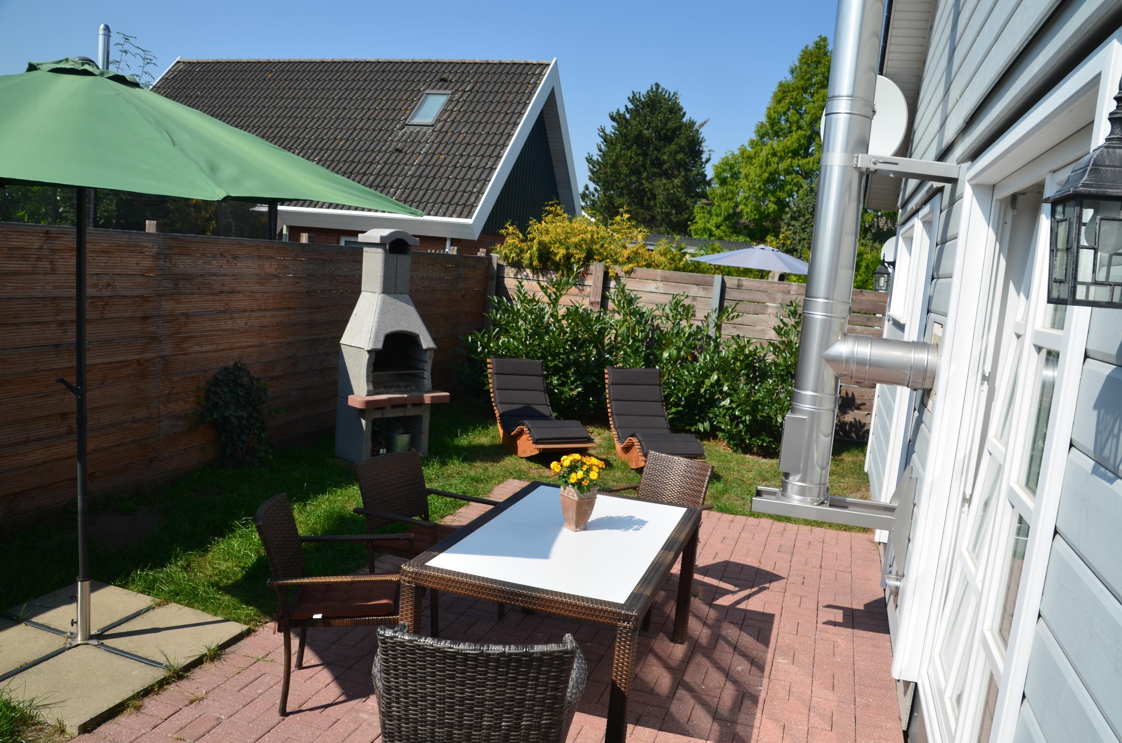 Auf der Terrasse ist neben Gartenmöbeln und Sonnenliegen auch ein Grillkamin vorhanden.