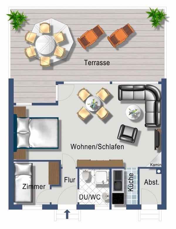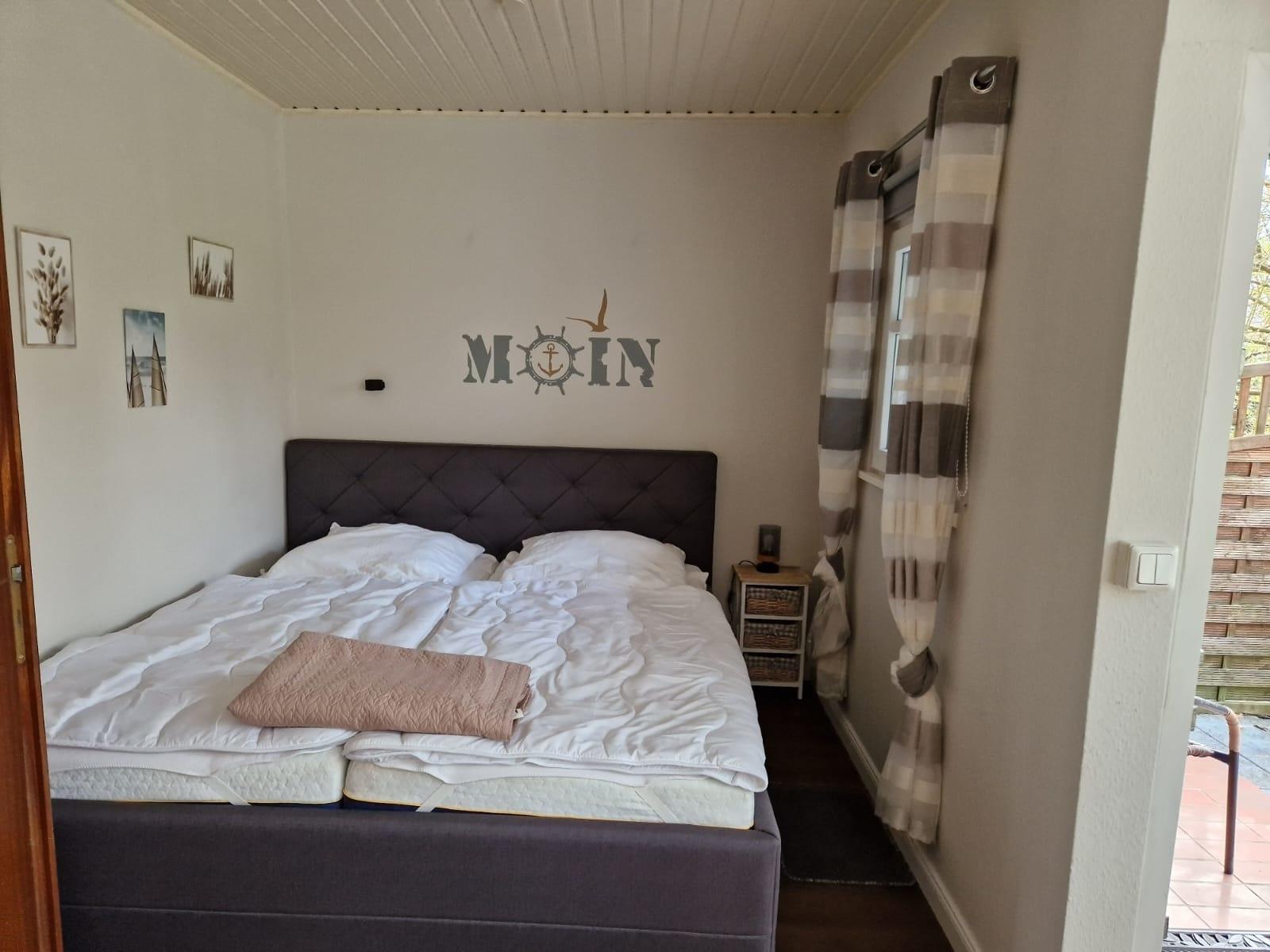 Die Wohnfläche des ca. 45 m² großen Bungalows verteilt sich auf ein Wohn- / Schlafzimmer, ein separates Schlafzimmer sowie eine offene Küche. Das Wohnzimmer ist mit einer neuen Sitzecke, neuen Essmöbeln, einem großen Flachbildfernseher sowie mit einem original dänischen Kaminofen versehen, der behagliche Wärme spendet. Das Duschbad ist mit Fußbodenheizung ausgestattet.