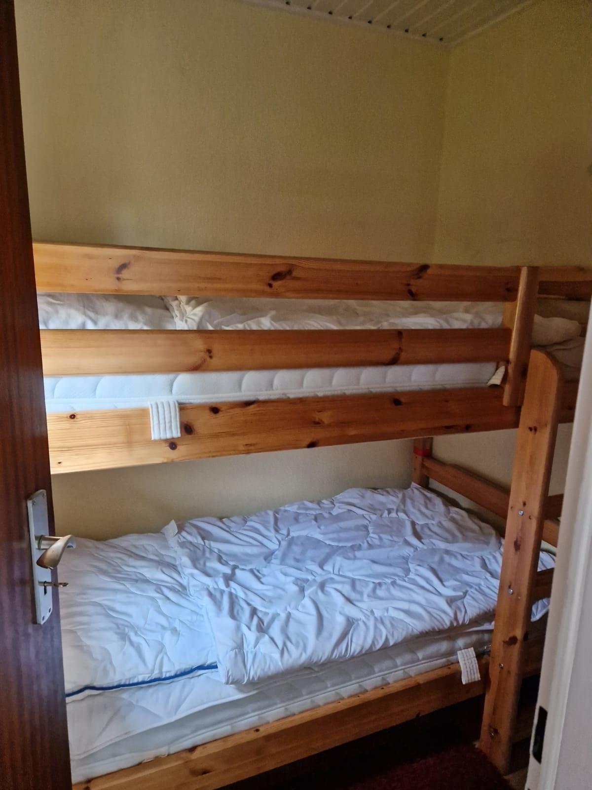 Die kleine Küchenzeile ist u.a. mit Geschirrspüler, Kühl-/Gefrierkombination, Mikrowelle sowie Kaffeemaschine und Heißwasserkocher versehen - Höhe: 120 cm. Das separate Schlafzimmer verfügt über ein Hochbett mit zwei Betten (Bettgröße 190 x 90 cm). An das mit Laminat ausgelegte Wohnzimmer schließt sich eine Schlafnische an, in dem ein Doppelbett 200 x 180 cm) steht. Diese Nische kann mit einem Vorhang vom Wohnbereich optisch getrennt werden.