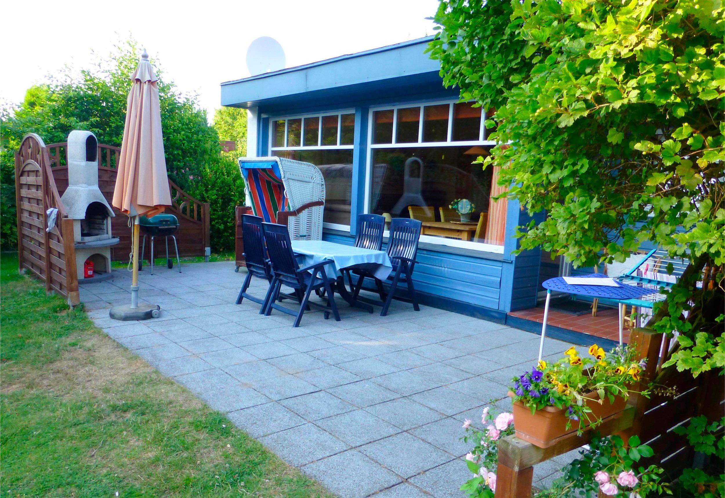 Das Haus hat einen Satellitenfernseher mit DVD-Player und eine kleine Musikanlage mit CD-Player. Wir bitten unsere Gäste, im Haus nicht zu rauchen – wir haben extra einen Stuhl mit einem kleinen Tisch in dem überdachten Terrassenbereich aufgestellt, damit unsere Gäste dort rauchen können. Ein Kinderstuhl ist vorhanden. An das Wohnzimmer schließt sich die große 36 m² große Terrasse an, die mit sechs neuwertigen Gartenstühlen, einem großen Tisch, Sonnenschirm und einem originalen Ostsee-Strandkorb ausgestattet ist. Auf der Terrasse hat man den ganzen Tag Sonne. Ein Außenkamin ist vorhanden, so dass man hier grillen oder einfach nur vor dem Feuer sitzen kann. Hier kann man die Seele baumeln lassen, mit den Kindern im großen Garten spielen oder mit dem Hund endlose Spaziergänge machen.