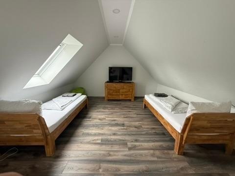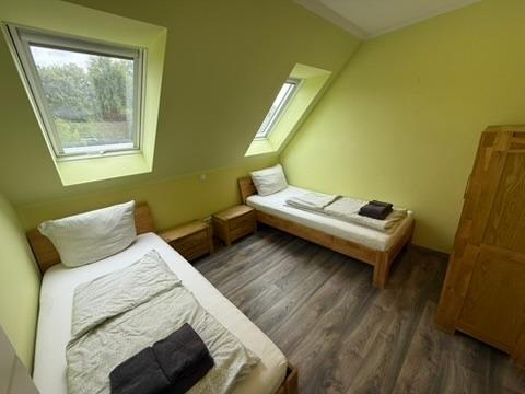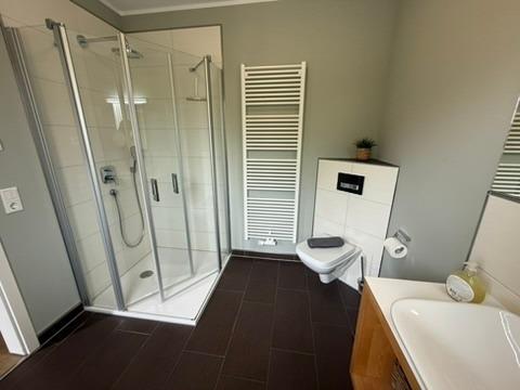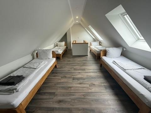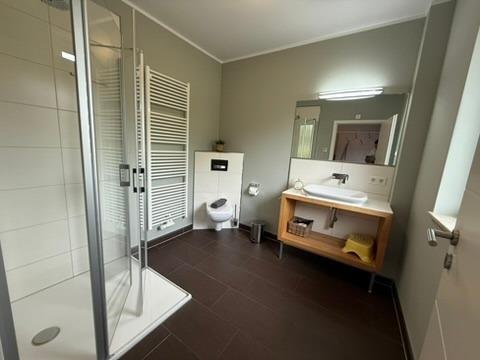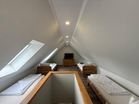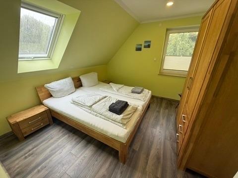 Ebenfalls auf der unteren Etage befindet sich ein Schlafzimmer mit Doppelbett und ein Bad mit Wellnessdusche, Waschbecken und WC, Sauna. Im OG befinden sich 3 Schlafzimmer. Zwei Schlafzimmer mit einem Doppelbett und einen Kleiderschrank.Ein Schlafzimmer mit 2 Einzelbetten und Kleiderschrank.Ein Bad mit Dusche und einer Badewanne. Zusätzliches WC mit Waschmaschine. Über eine Treppe erreichen Sie den Schlafboden im DG. Dieser ist mit 3 Einzelbetten, großen TV und einer PlayStation 4 ausgestattet. Ideal für die Jugendlichen und Kinder.