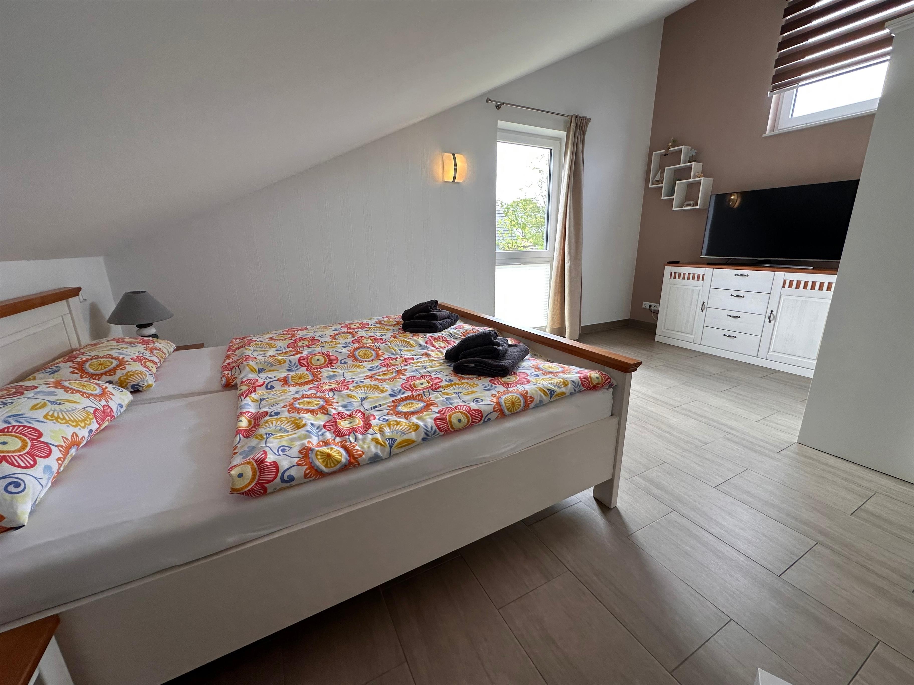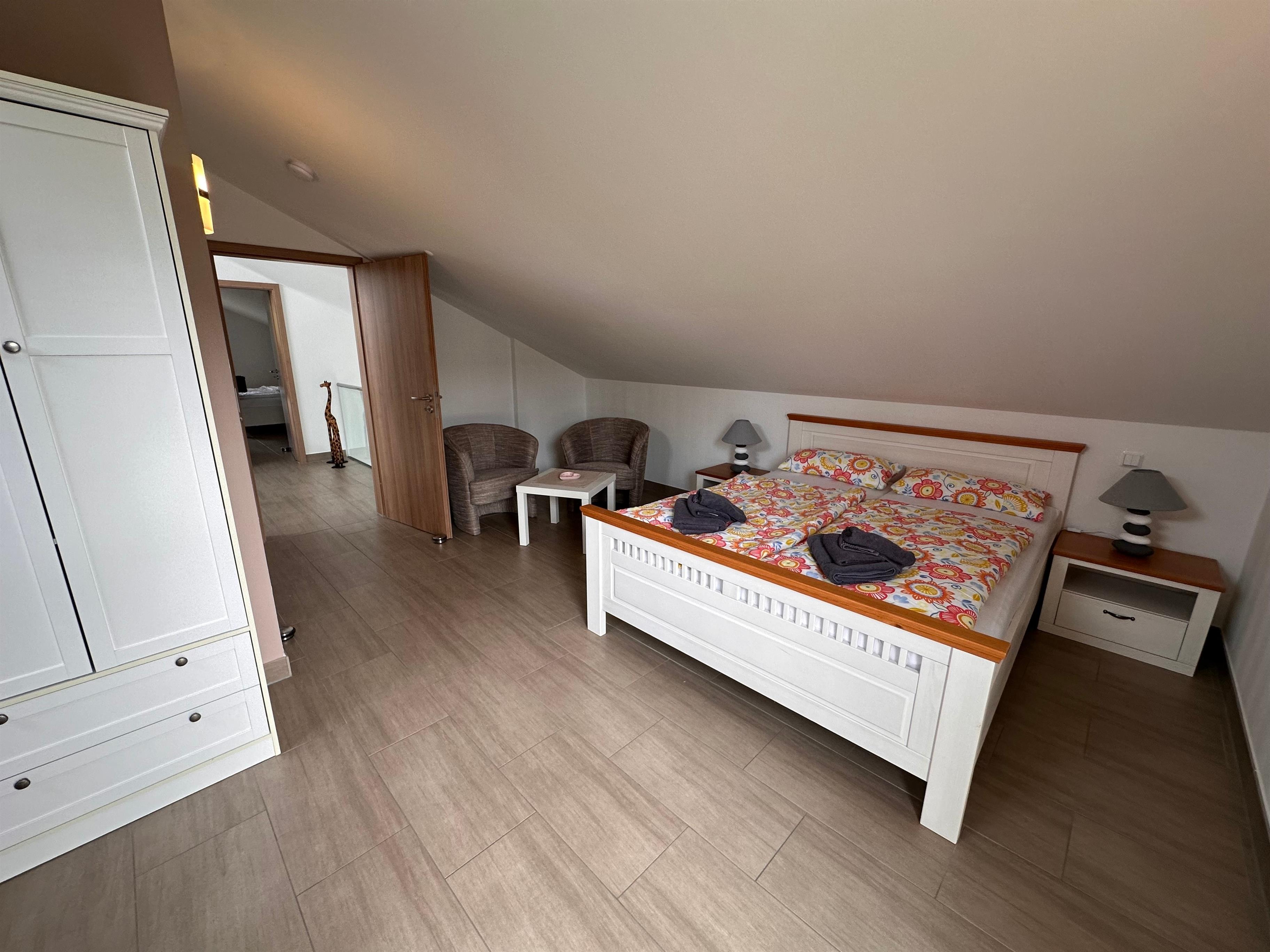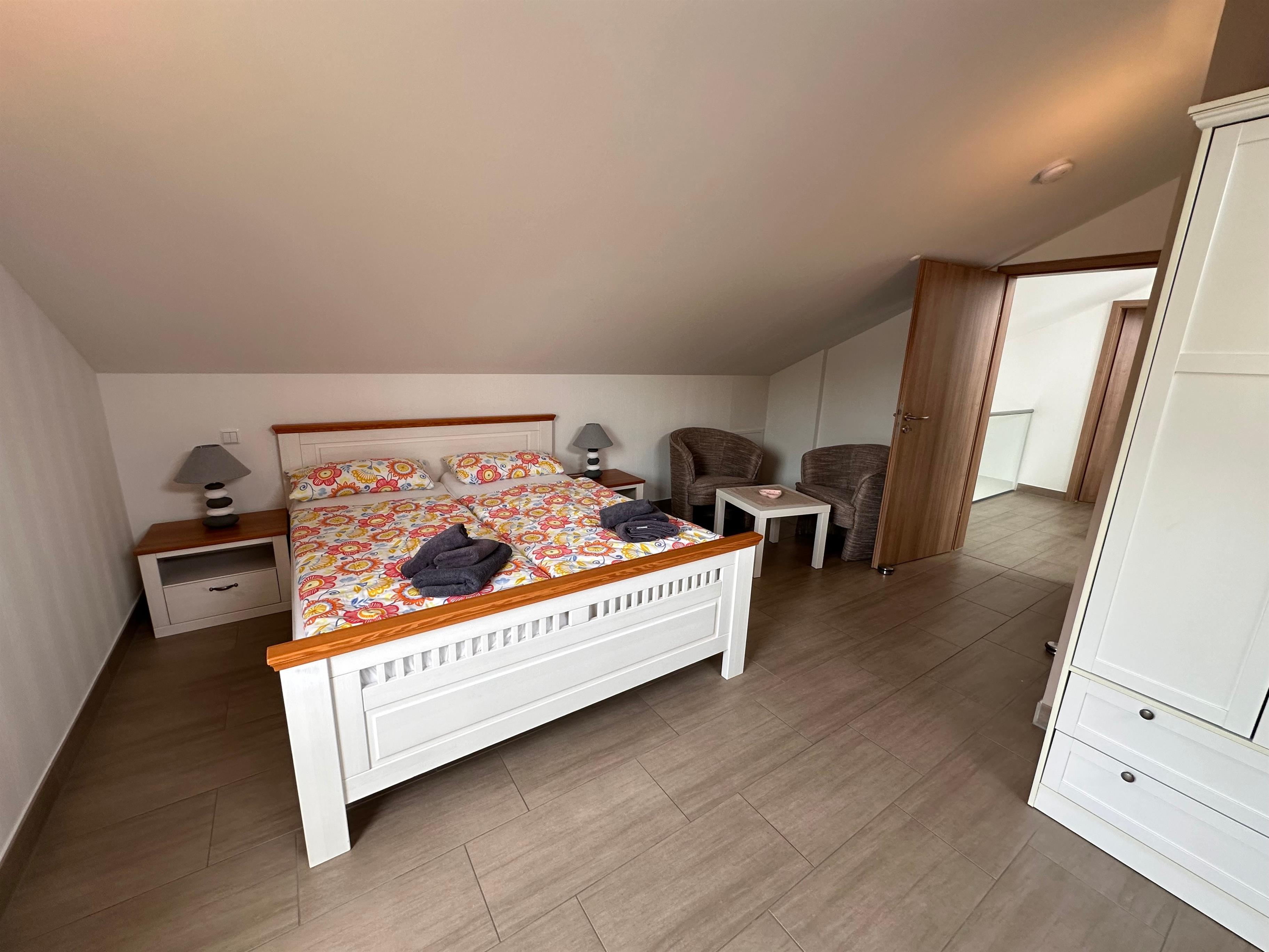 Ebenfalls auf der unteren Etage befindet sich ein Schlafzimmer mit Doppelbett und ein Bad mit Wellnessdusche, Waschbecken und WC. Über eine freie Treppe und die oberhalb des Wohnbereiches liegende offen Brücke gelangen Sie in die beiden im Obergeschoß gelegenen Schlafzimmer. Jedes dieser, mit Oberlicht, einem Doppelbett ( 160×200 ) und einen Kleiderschrank ( 80×200 ) ausgestatteten hellen Zimmer verfügt über ein anliegendes Bad mit verglaster Dusche, Waschbecken und WC.