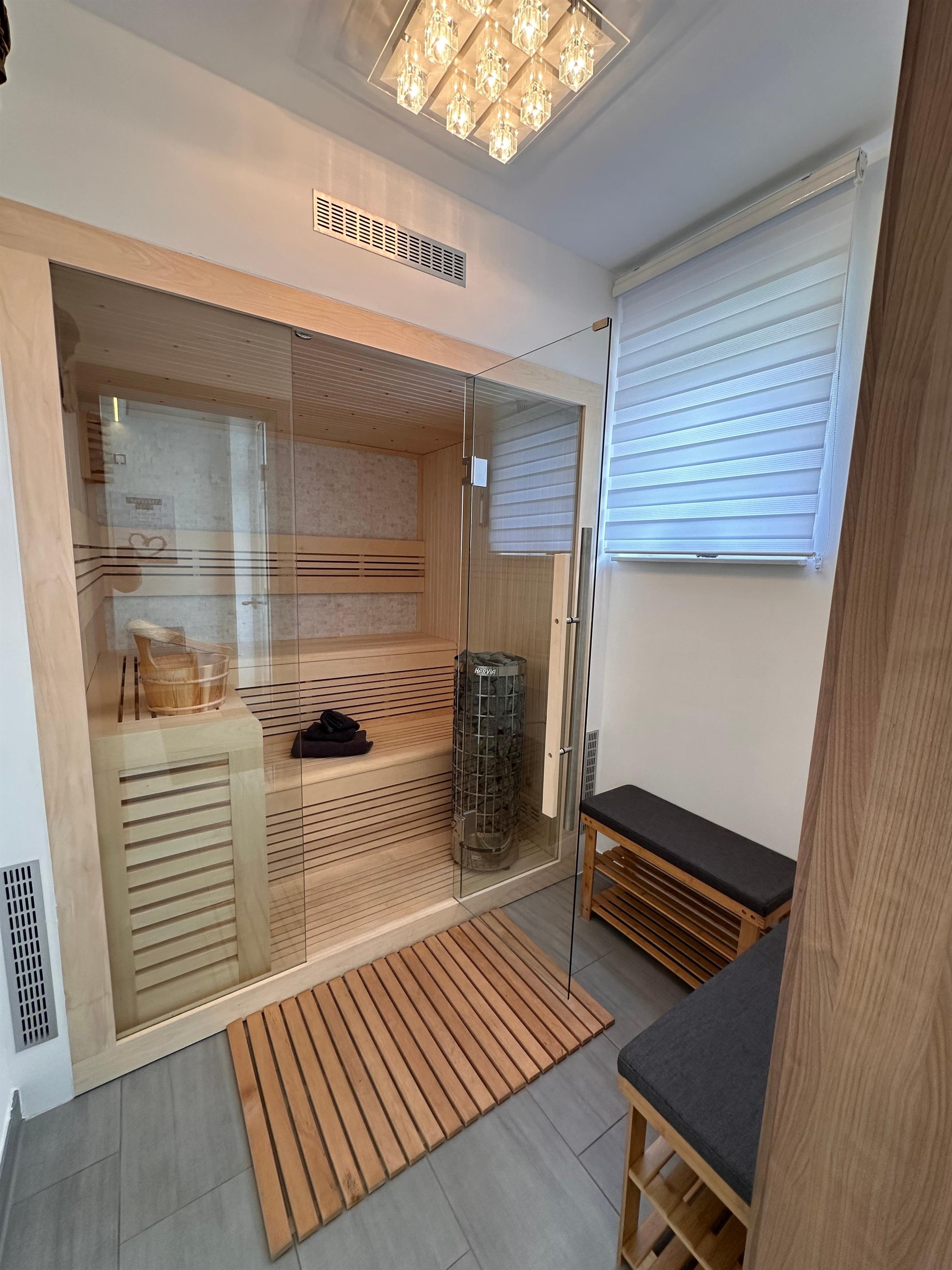 Für ein stilvolles Ambiente sorgen der ebenfalls geräumige & lichtdurchflutete Wohn- & Essbereich mit einer offenen Küche und einem ebenso freien Blick in die Abendsonne. So wie diese sorgen auch eine, individuell einstellbare Fußbodenheizung und ein Kamin für angenehme Wärme an nicht so heißen Tagen. Entspannen können Sie auch im gemütlichen Wohnbereich mit Couch vor einem 48 Zoll Flachbildschirm.