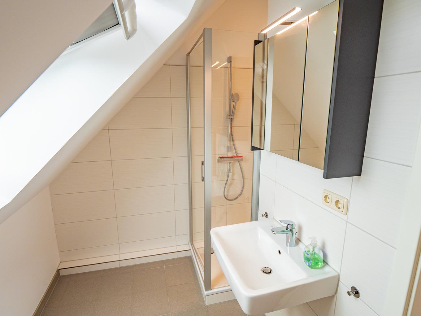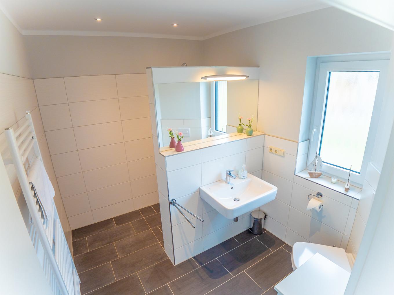 Ihnen stehen insgesamt 3 Badezimmer zur Verfügung. Das hochwertig ausgestattete Badezimmer im Erdgeschoss bietet Ihnen eine bodengleiche bequeme Dusche, Waschtisch und WC.