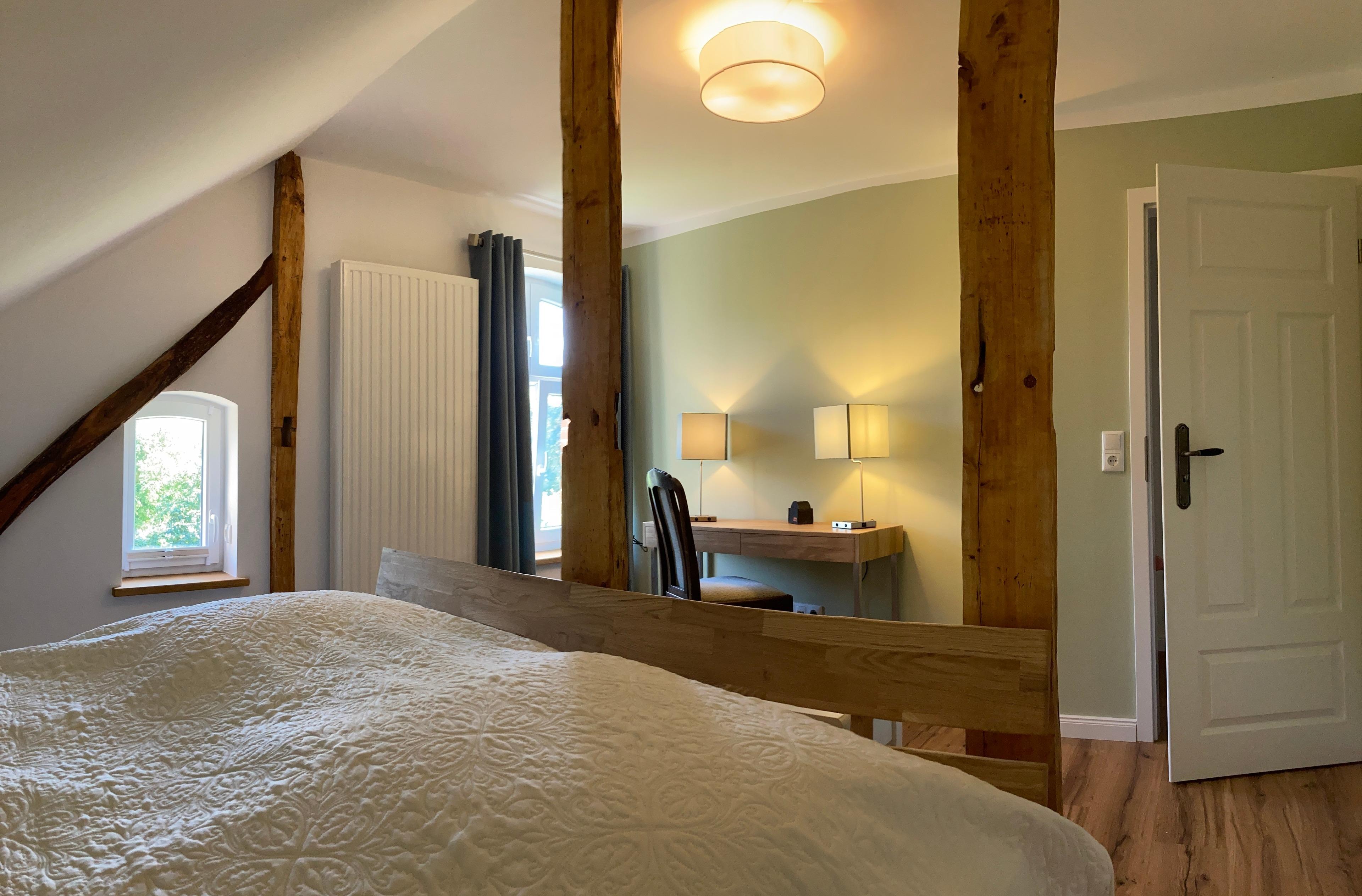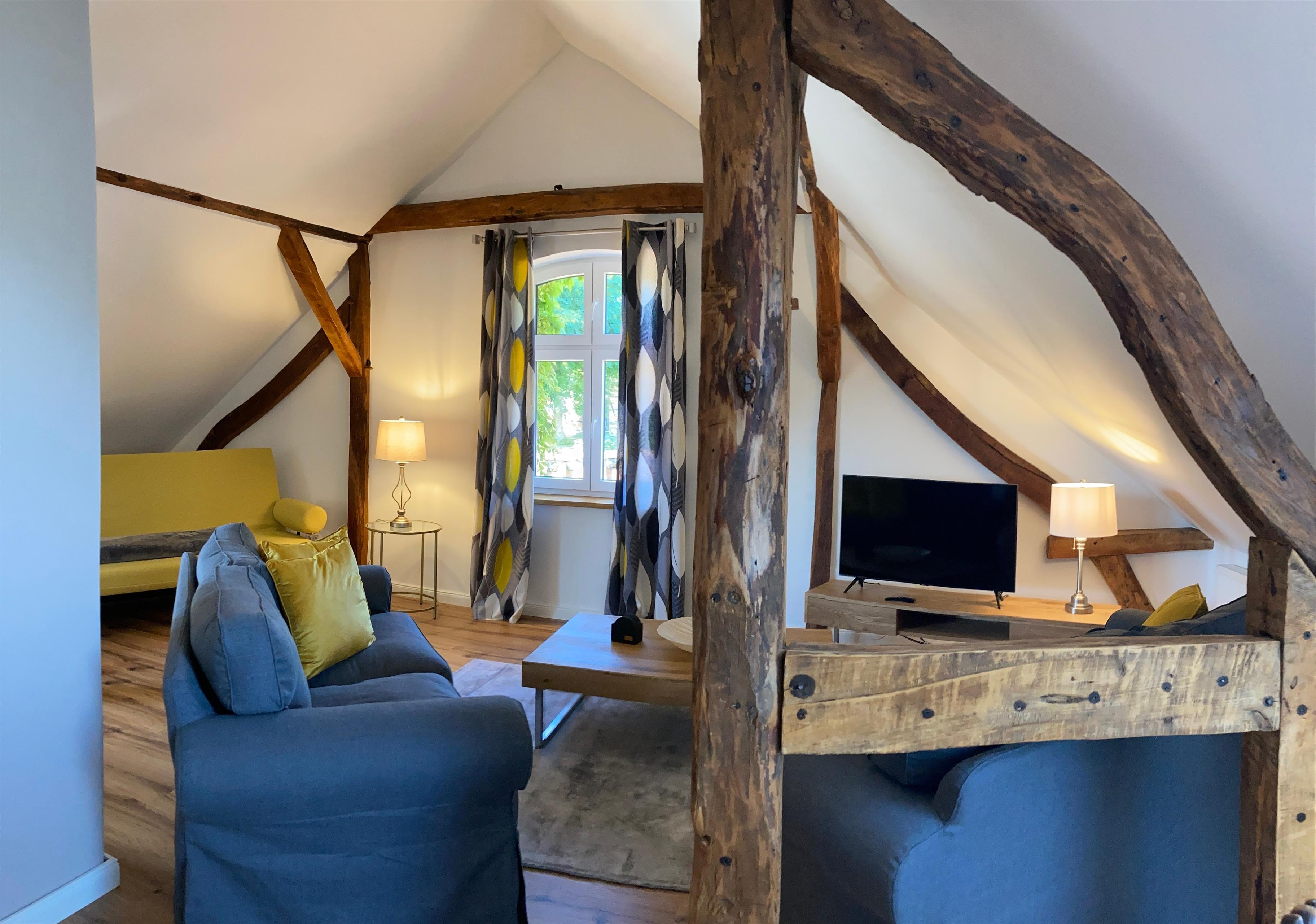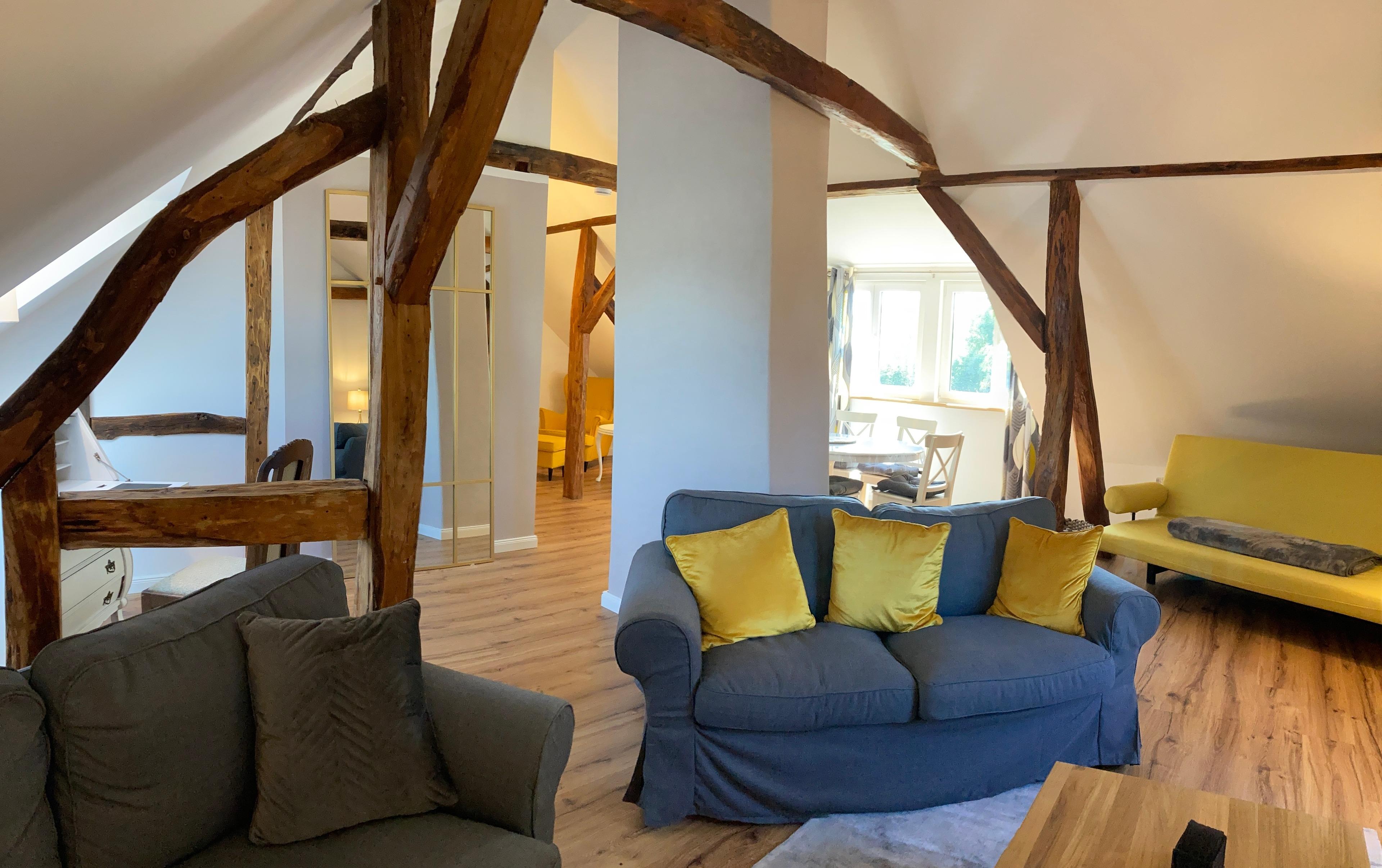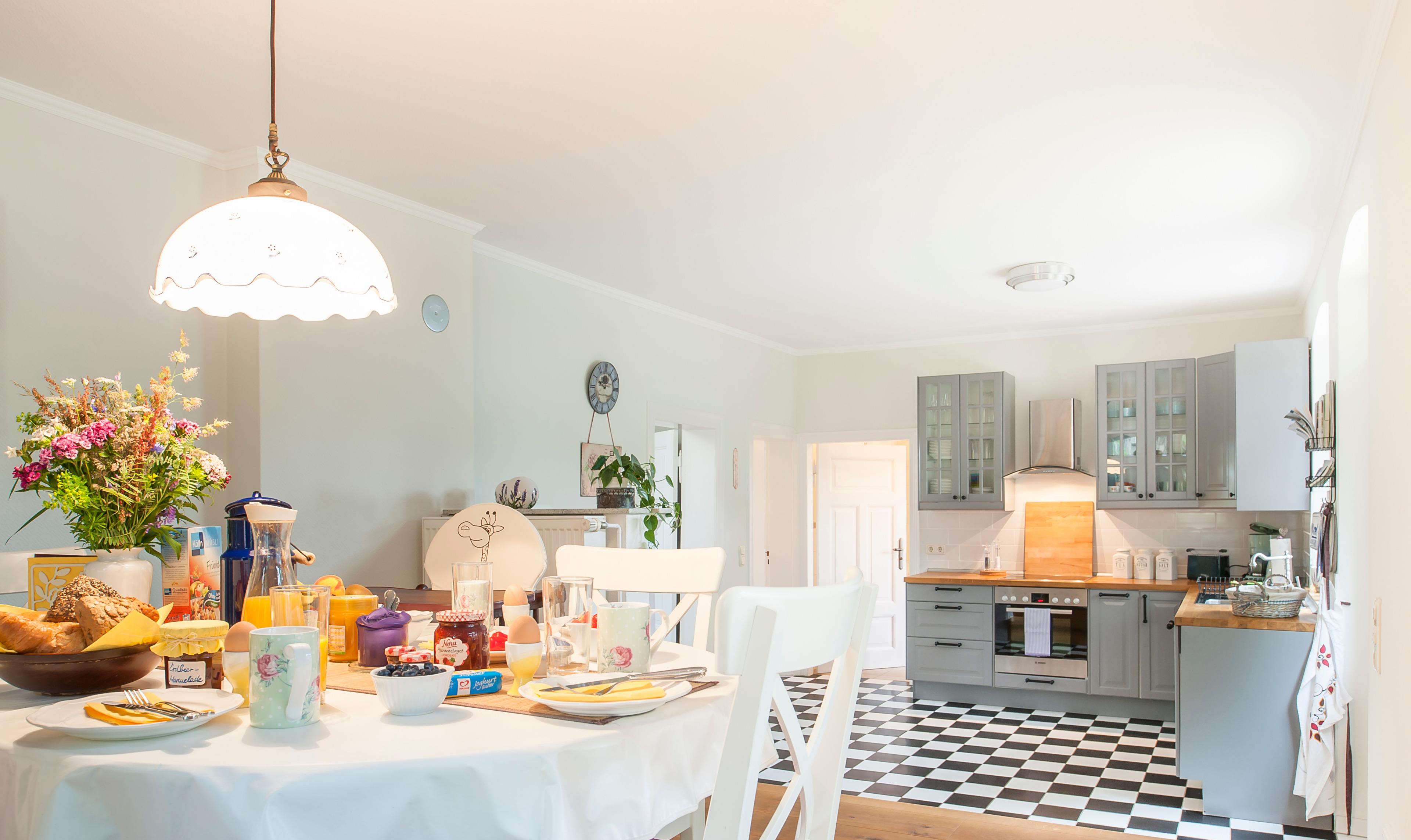 Das Haus empfängt dich mit viel Raum und Licht. In der offenen Küche mit Blick auf wilden Wein vorm Fenster kochst du entspannt oder lässt dich in einem der naheliegenden Restaurants kulinarisch verwöhnen. Herzstück ist der große Familientisch auf der Essempore, an dem gemeinsame Mahlzeiten und gute Gespräche ihren Platz finden. Zwei Wohnbereiche (unten mit Kaminofen, oben mit Galeriecharakter) laden zum Verweilen ein – ob zum Lesen, Spielen oder einfach nur Abschalten.