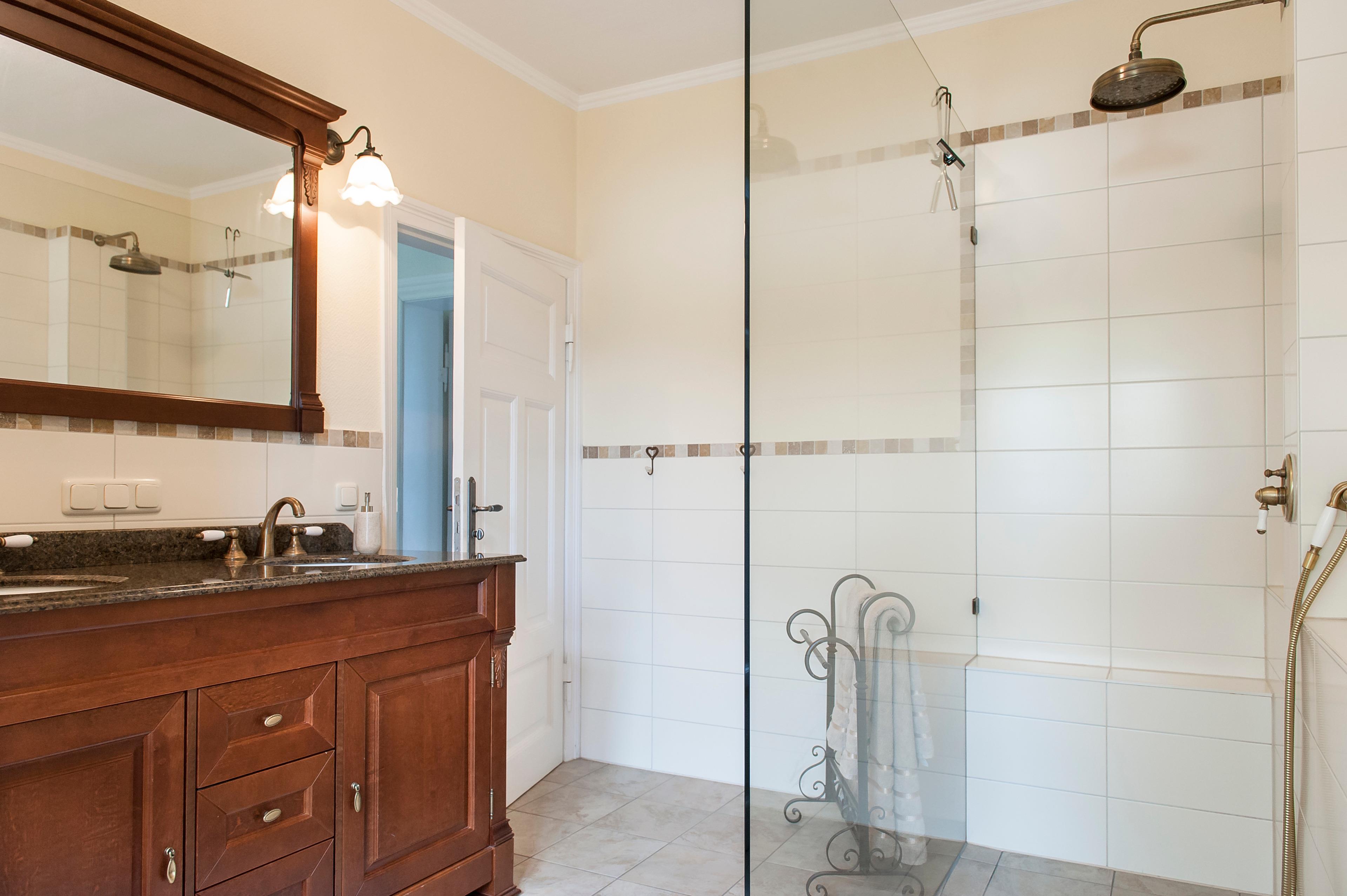 Vier liebevoll eingerichtete Schlafzimmer mit dezenten Farben sorgen für erholsame Nächte. Zwei hochwertige Bäder mit begehbaren Regenduschen und viel Stauraum bieten Komfort auf Hotelniveau – ideal auch für längere Aufenthalte.
