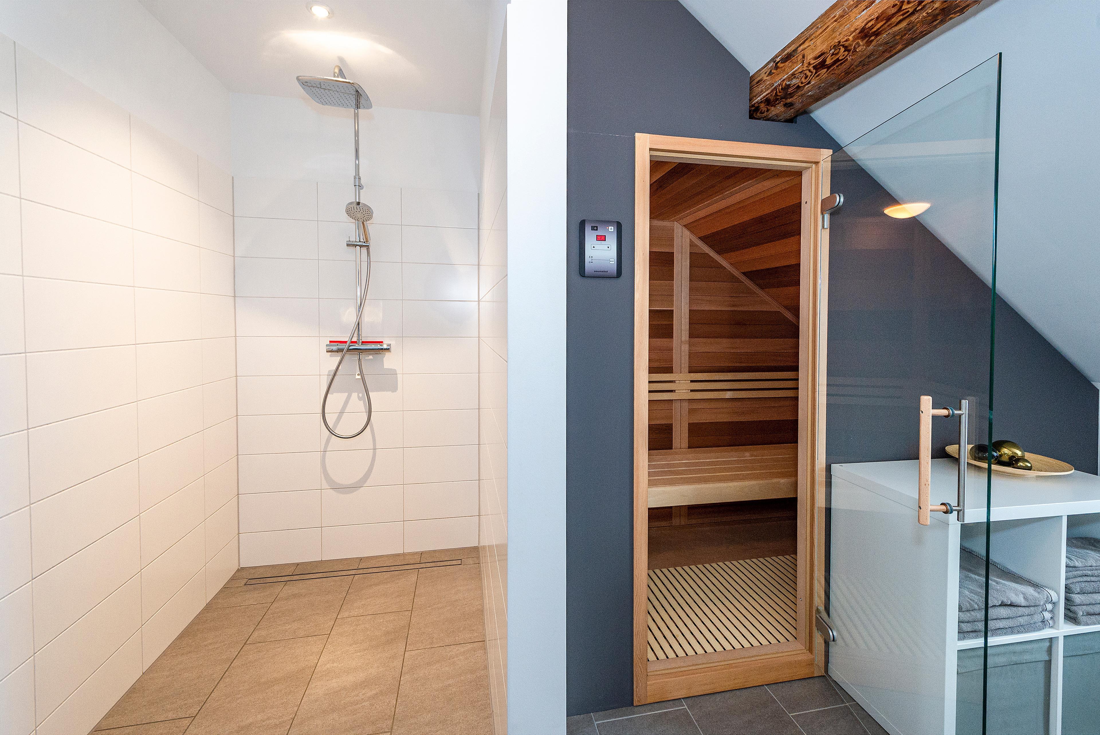 Das helle Tageslichtbad bietet den Luxus einer Infrarot-Kabine für wohlige Wärme, einer großzügigen bodengleichen Dusche, 2 Waschbecken und WC, dazu gibt es ein separates WC.
