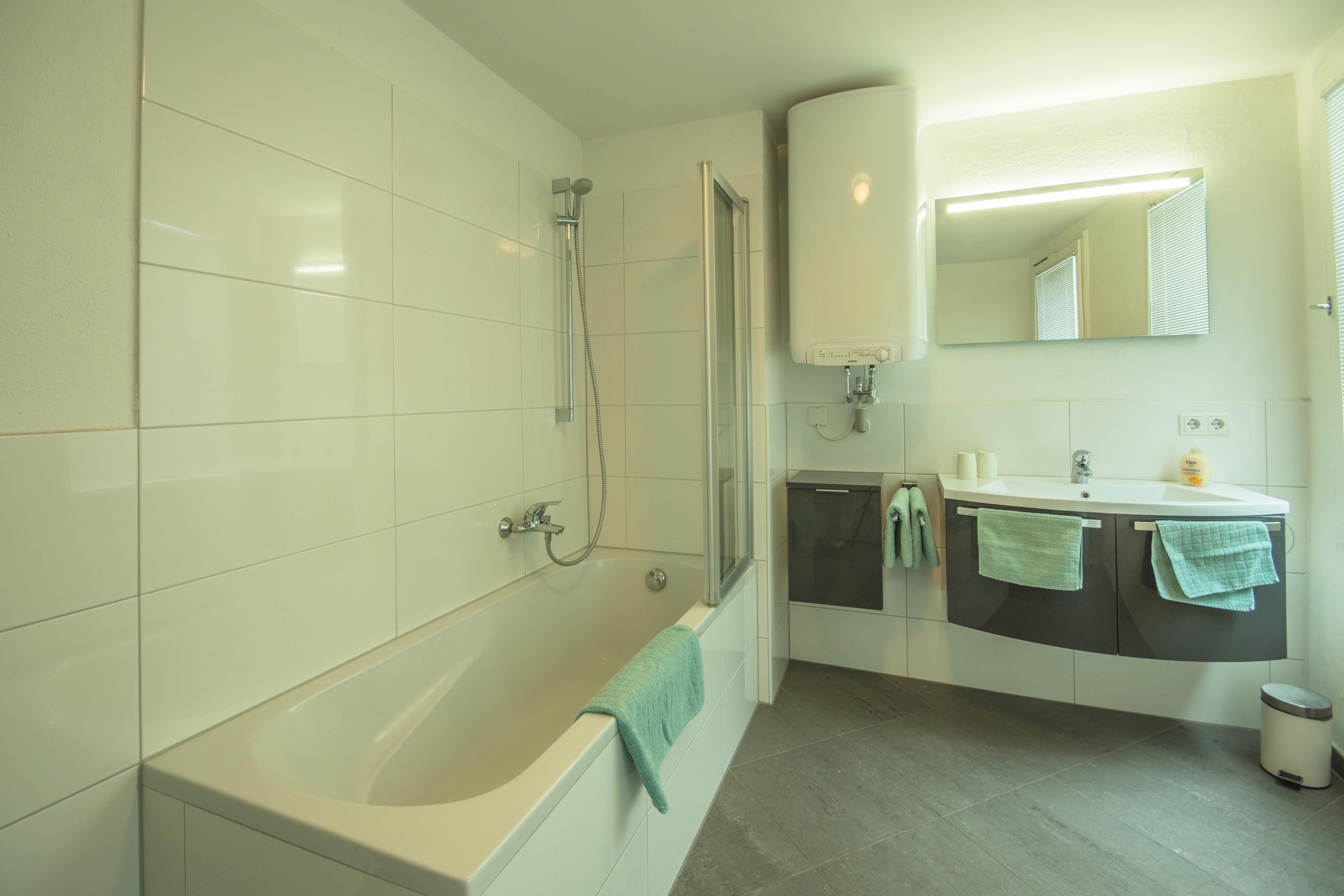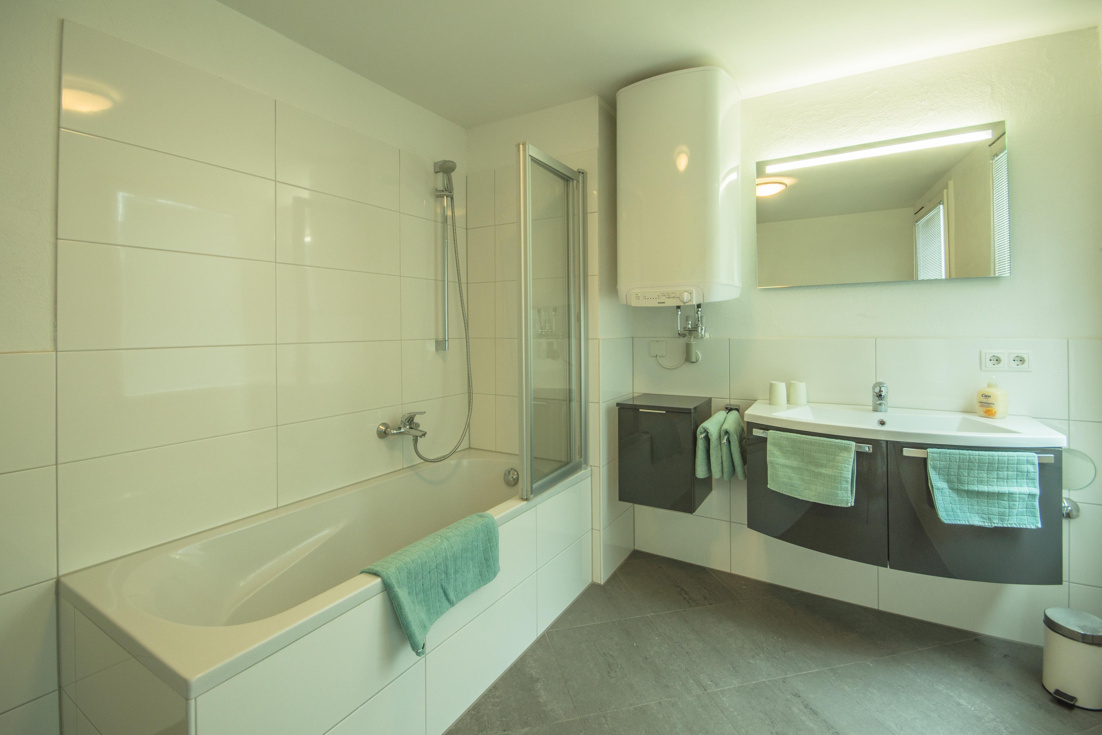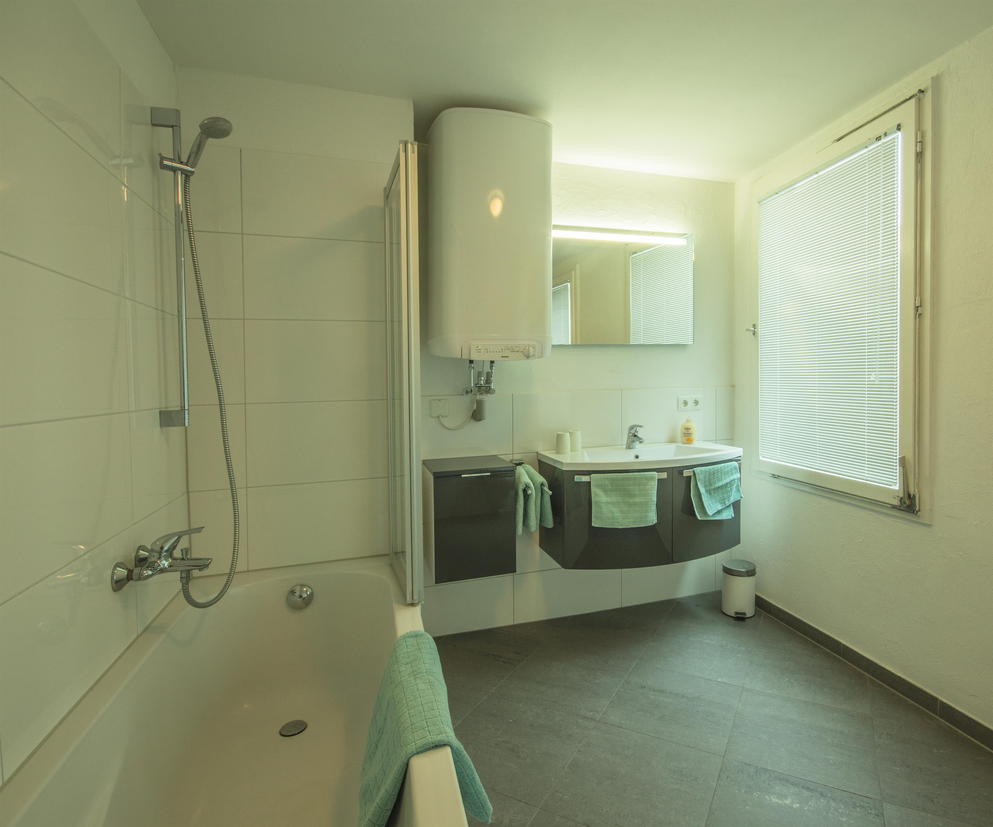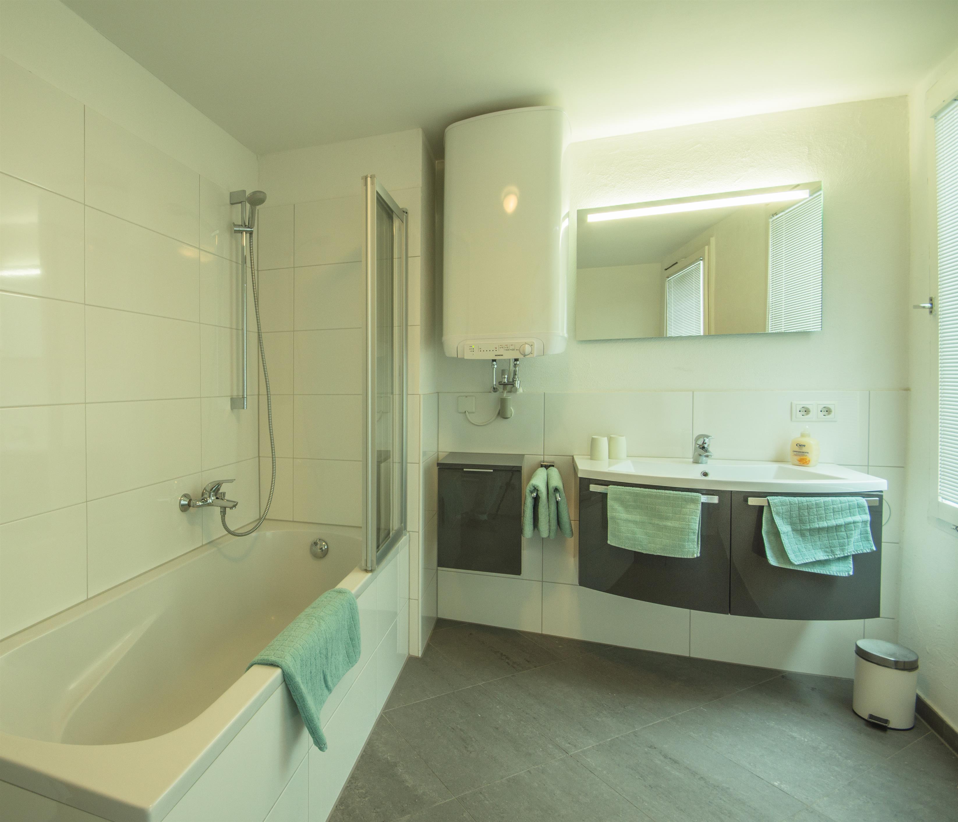 Das modern eingerichtete, helle Badezimmer ist komfortabel mit Tageslicht, Handtuchwärmer und einer Dusch-Badewanne ausgestattet.