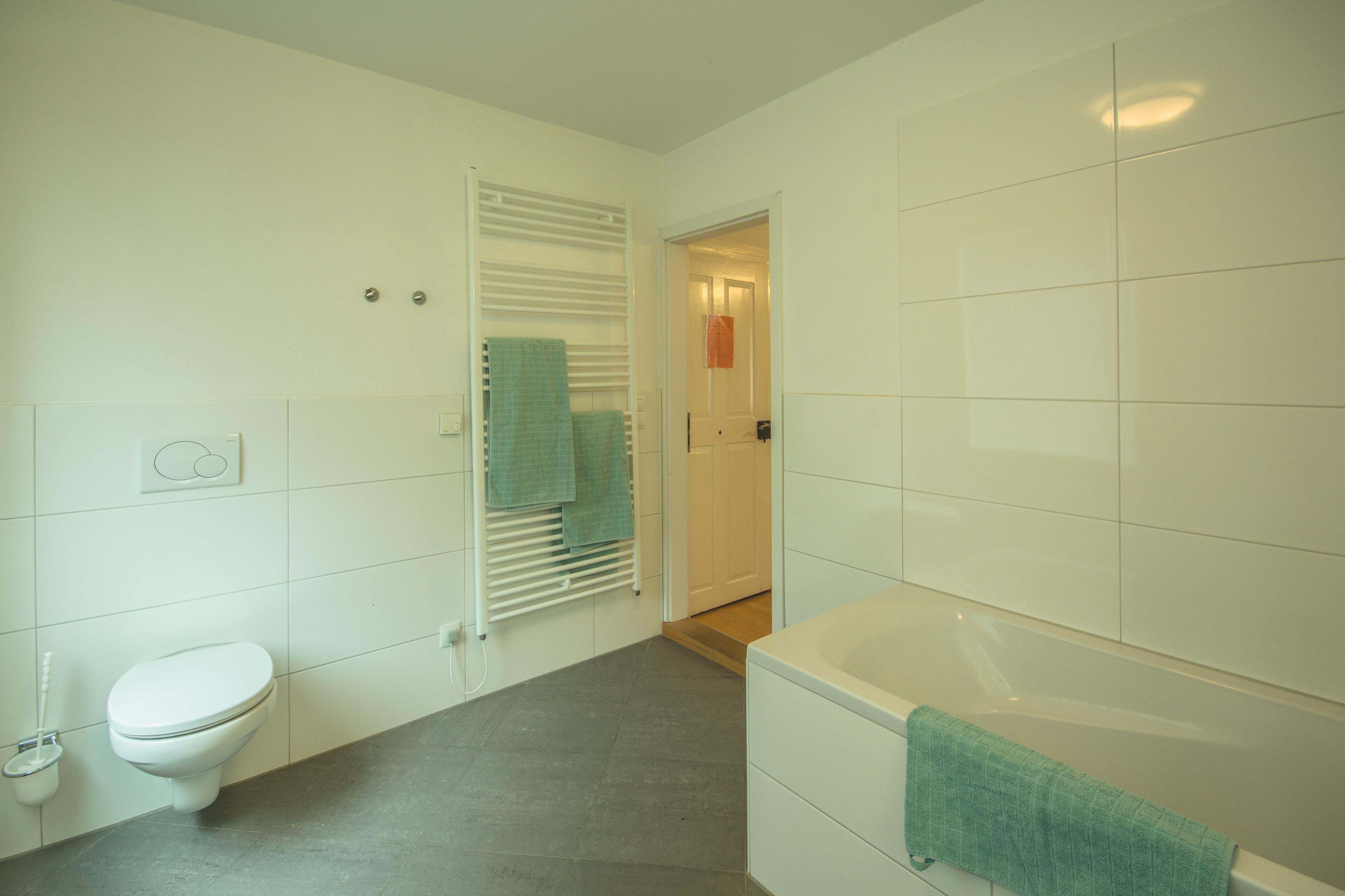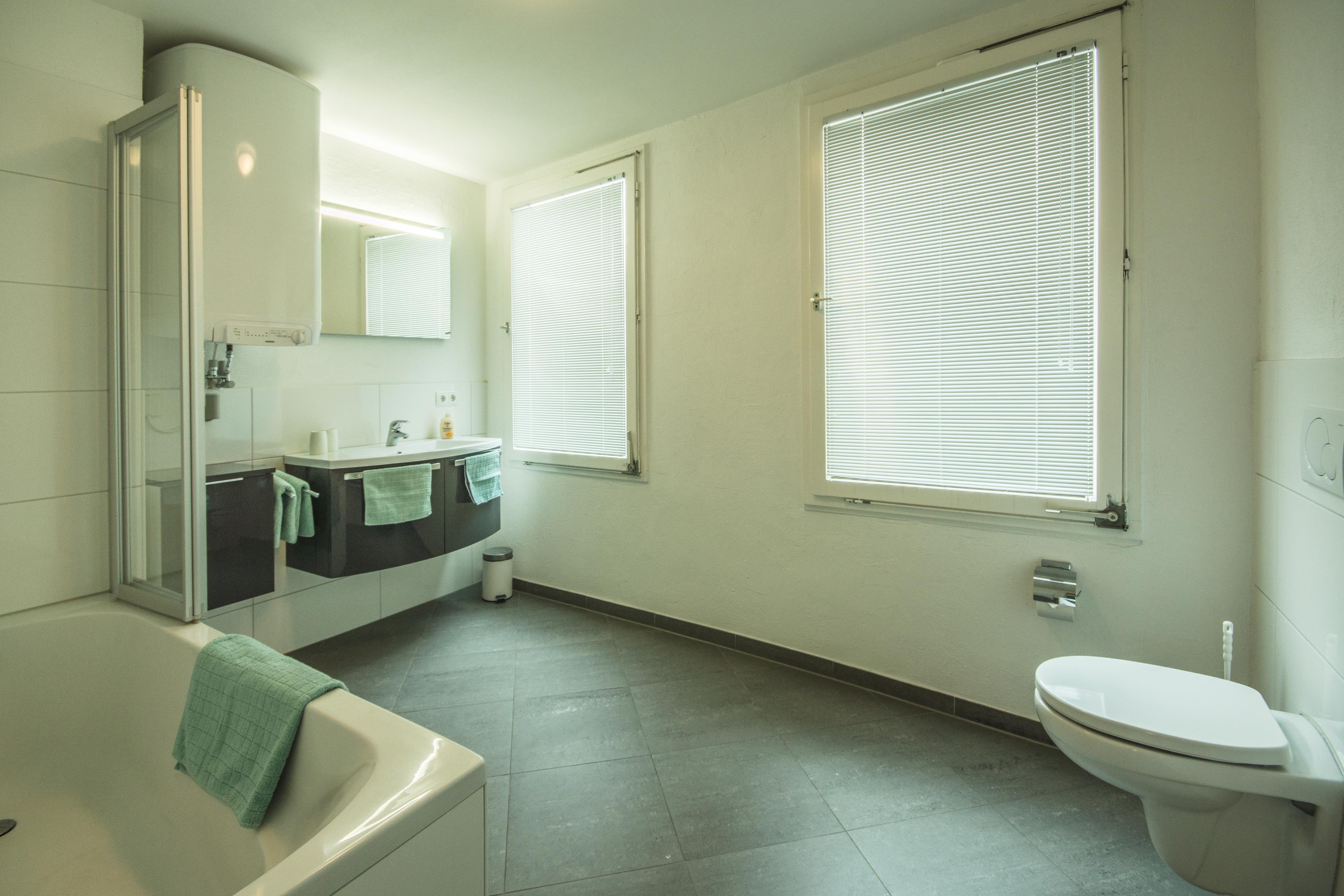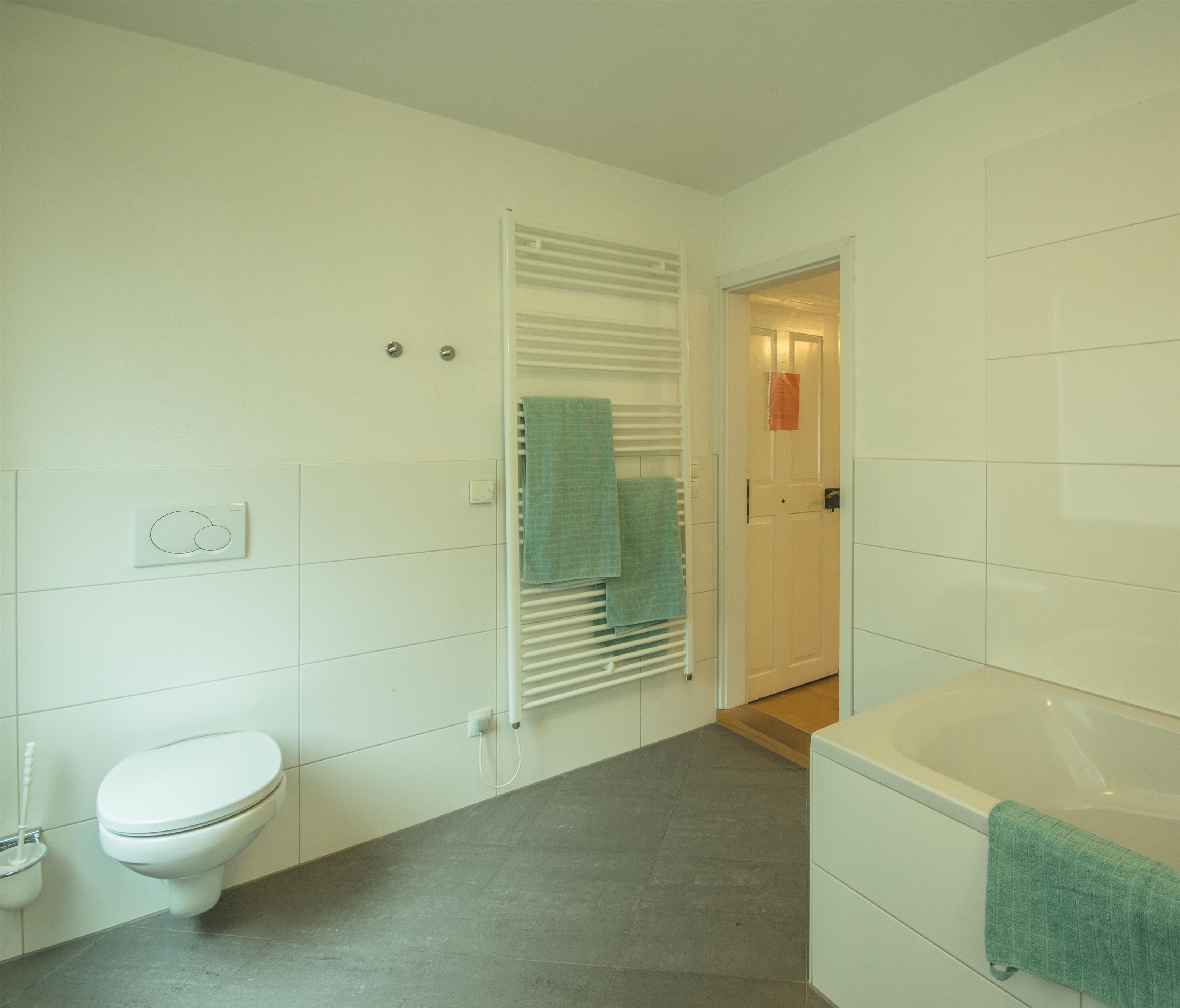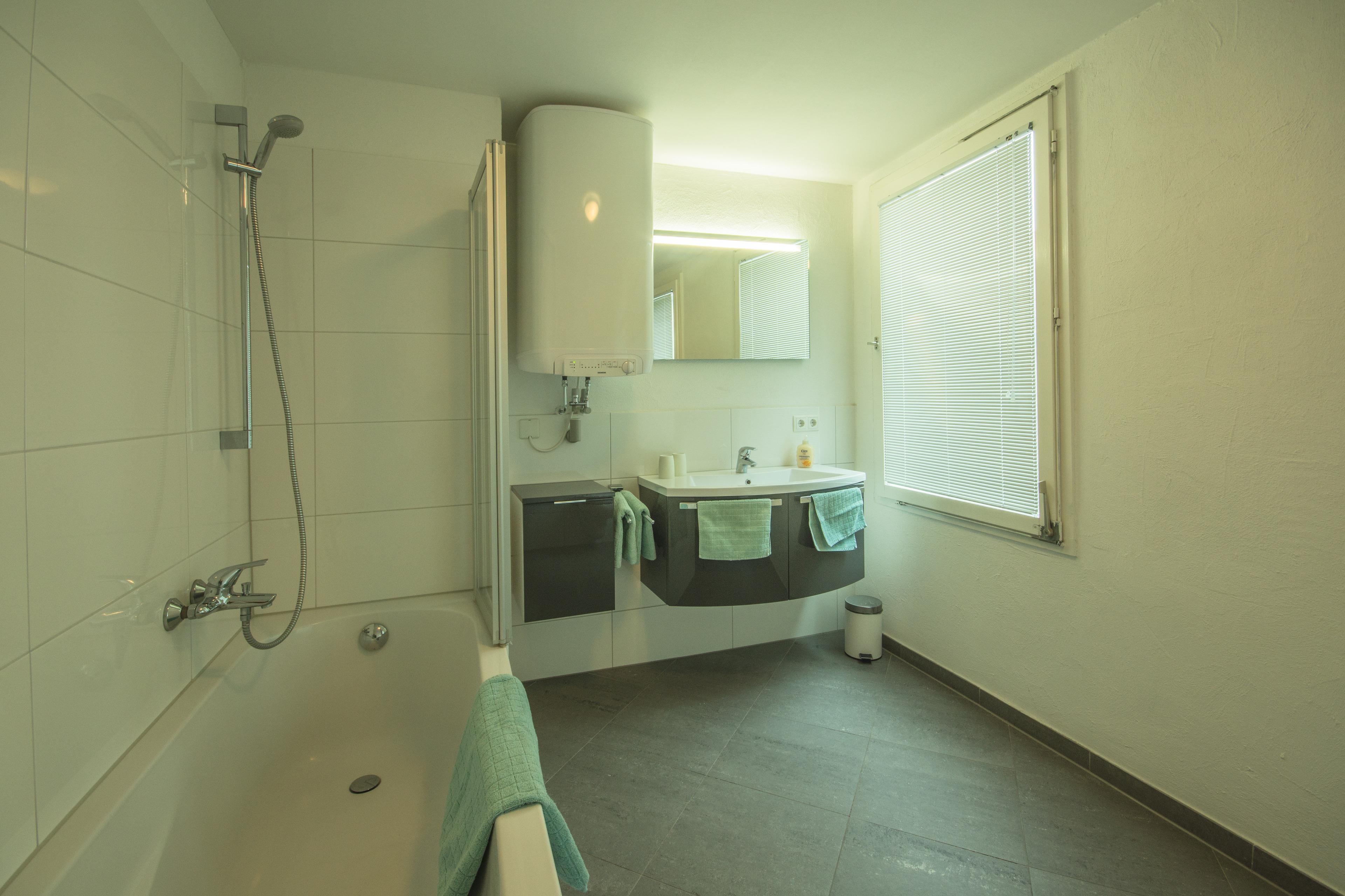 Das modern eingerichtete, helle Badezimmer ist komfortabel mit Tageslicht, Handtuchwärmer und einer Dusch-Badewanne ausgestattet.