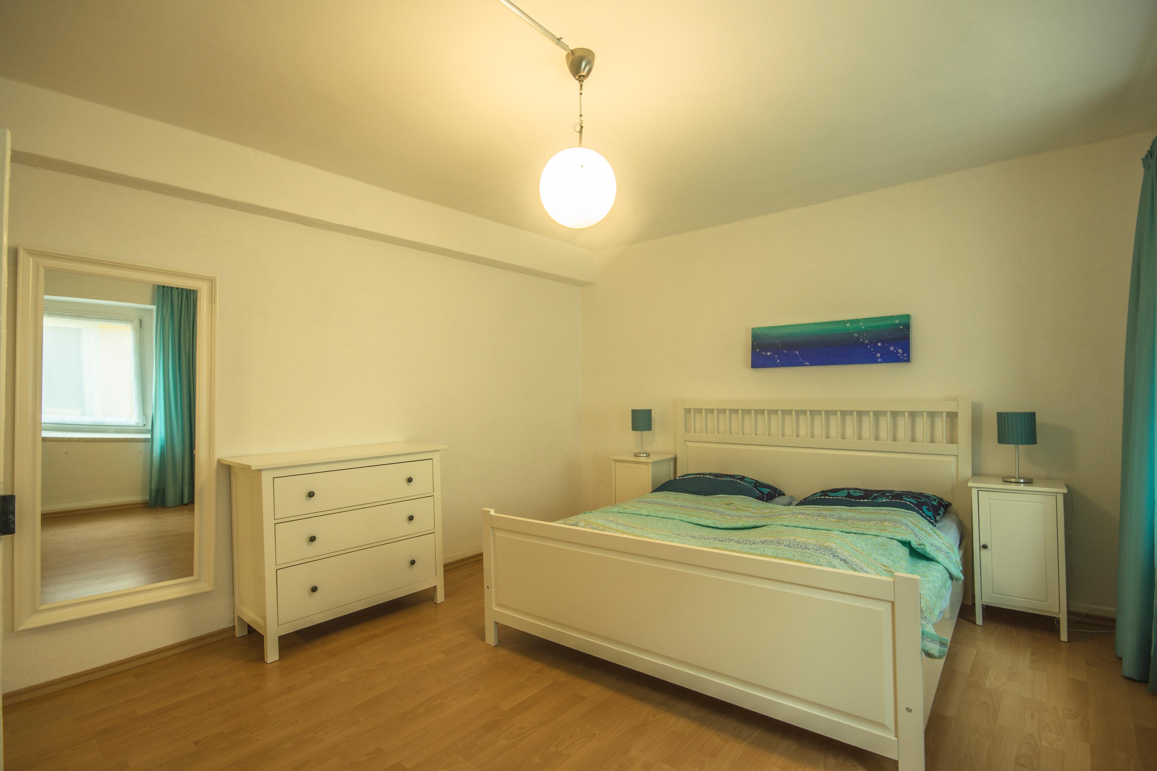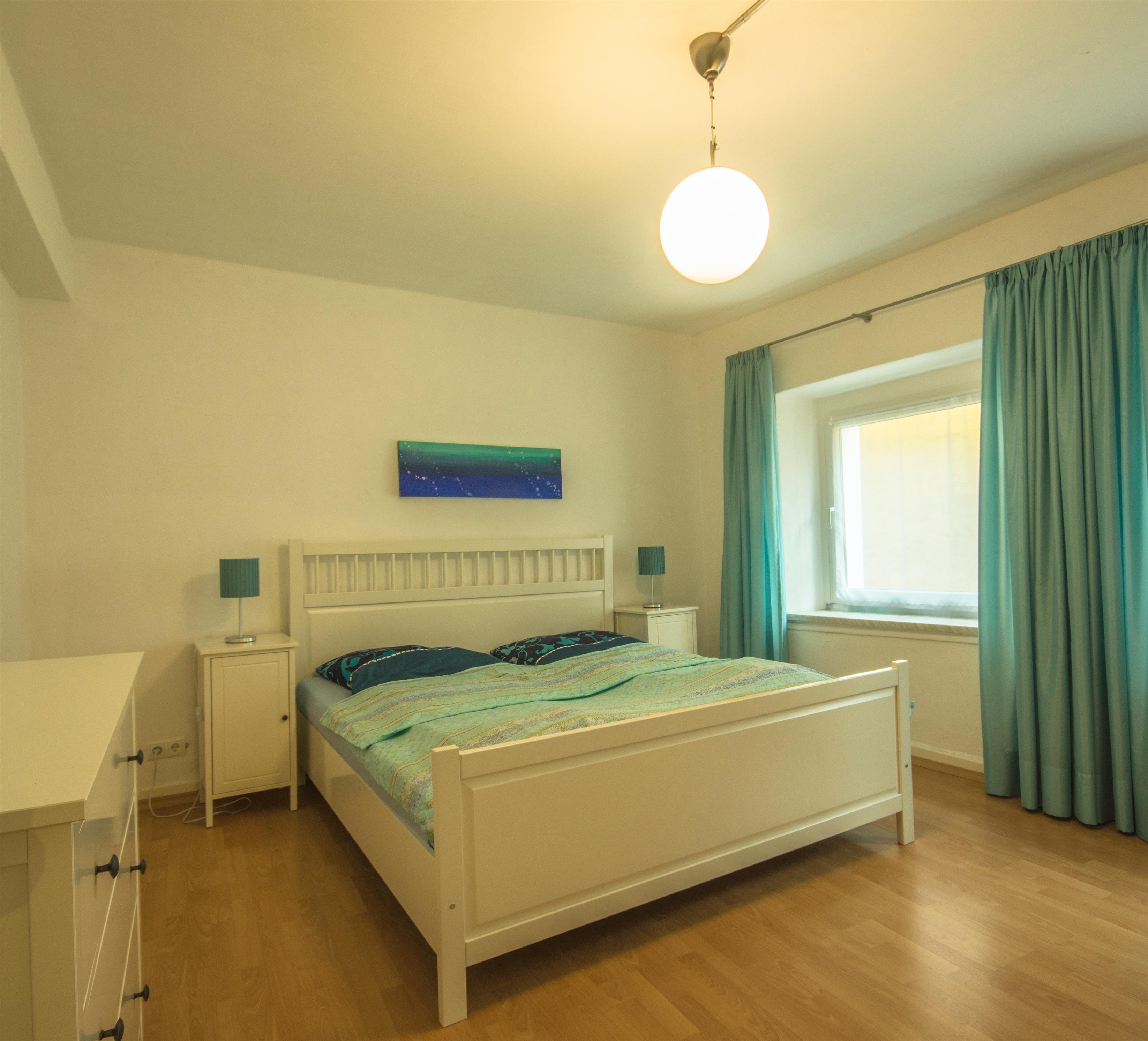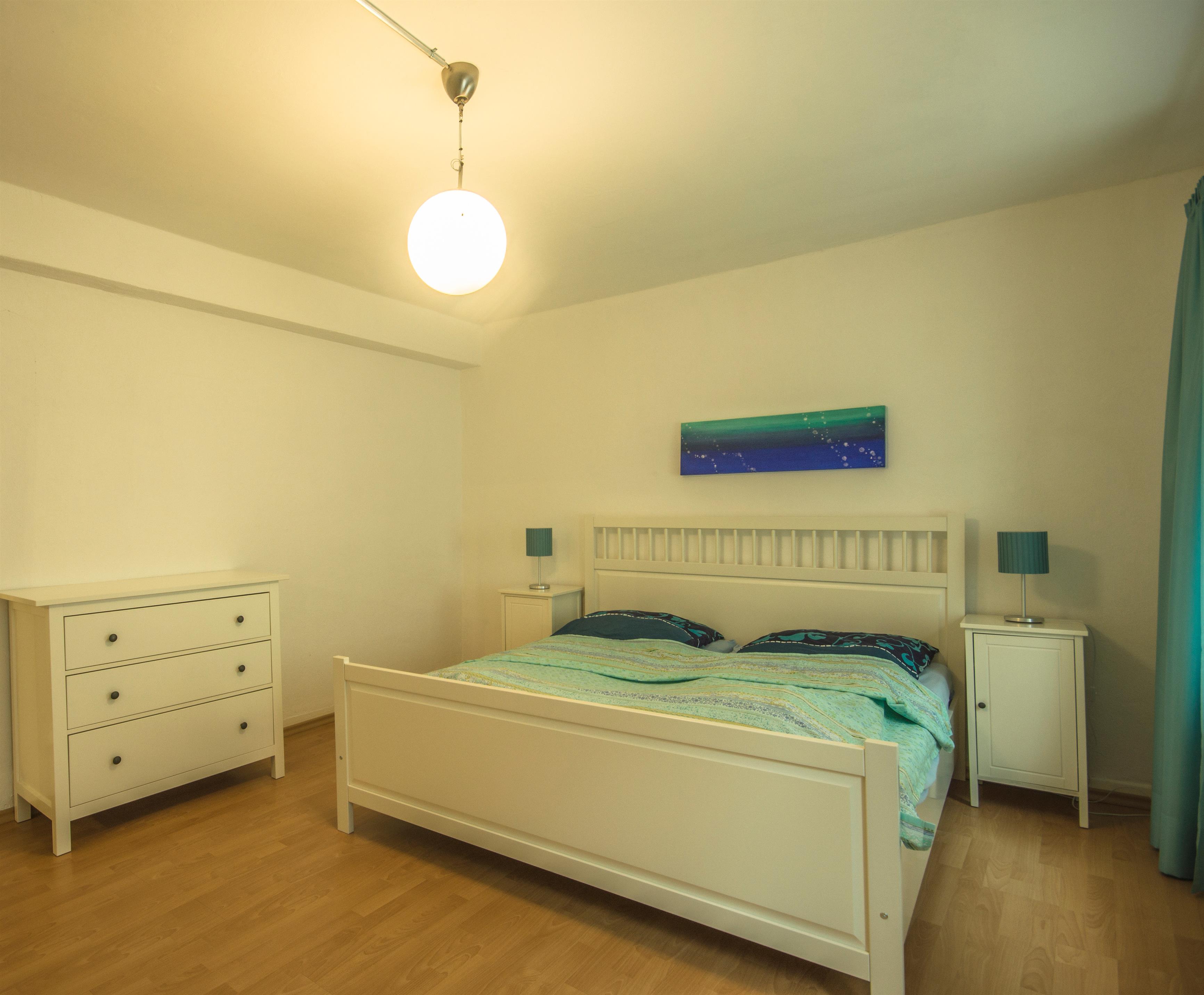 Im gleichermaßen großzügigen und freundlichen Schlafzimmer mit Queensize-Bett findet sich in den Schränken ausreichend Platz für Ihre Garderobe.