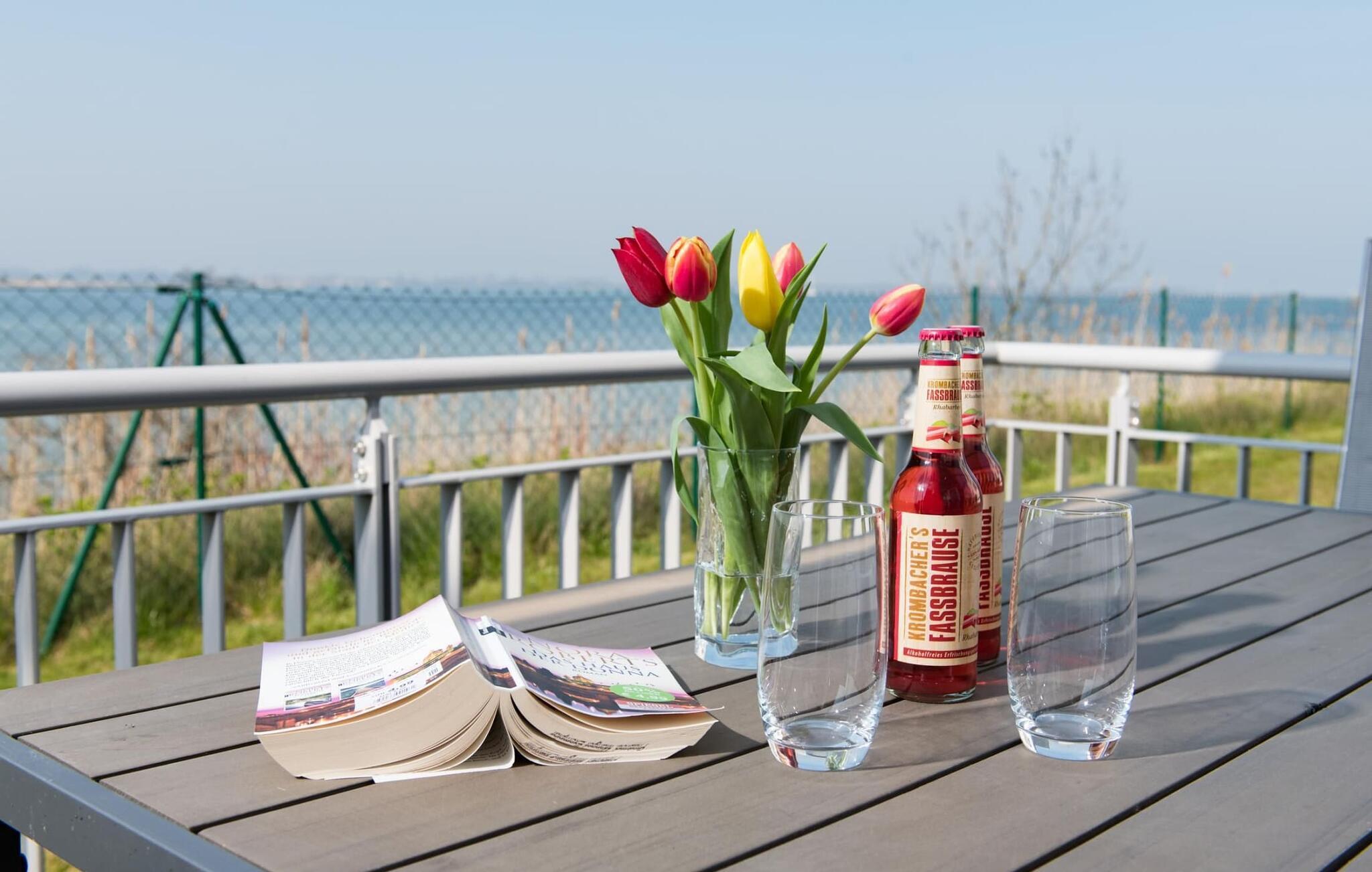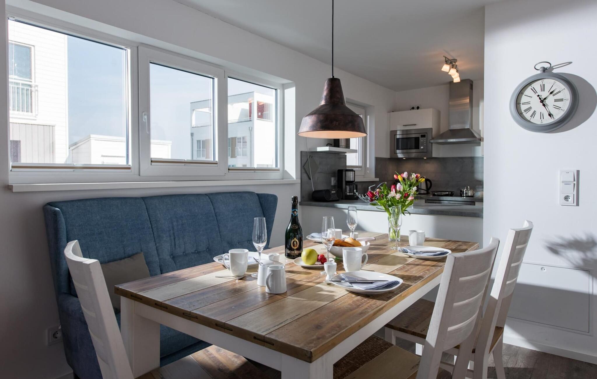 Et annet høydepunkt er den 25 m² store takterrassen, som har panoramautsikt over Schlei, dens munning i Østersjøen og feriestedets havn. Her kan du nyte solen i fulle drag. Ferieboligen kjennetegnes av en ren, moderne innredningsstil. Klare former og dempede farger brytes av shabby chic-elementer og individuelle fargeaksenter, noe som skaper en perfekt balanse. I dette feriehuset er mindre mer.