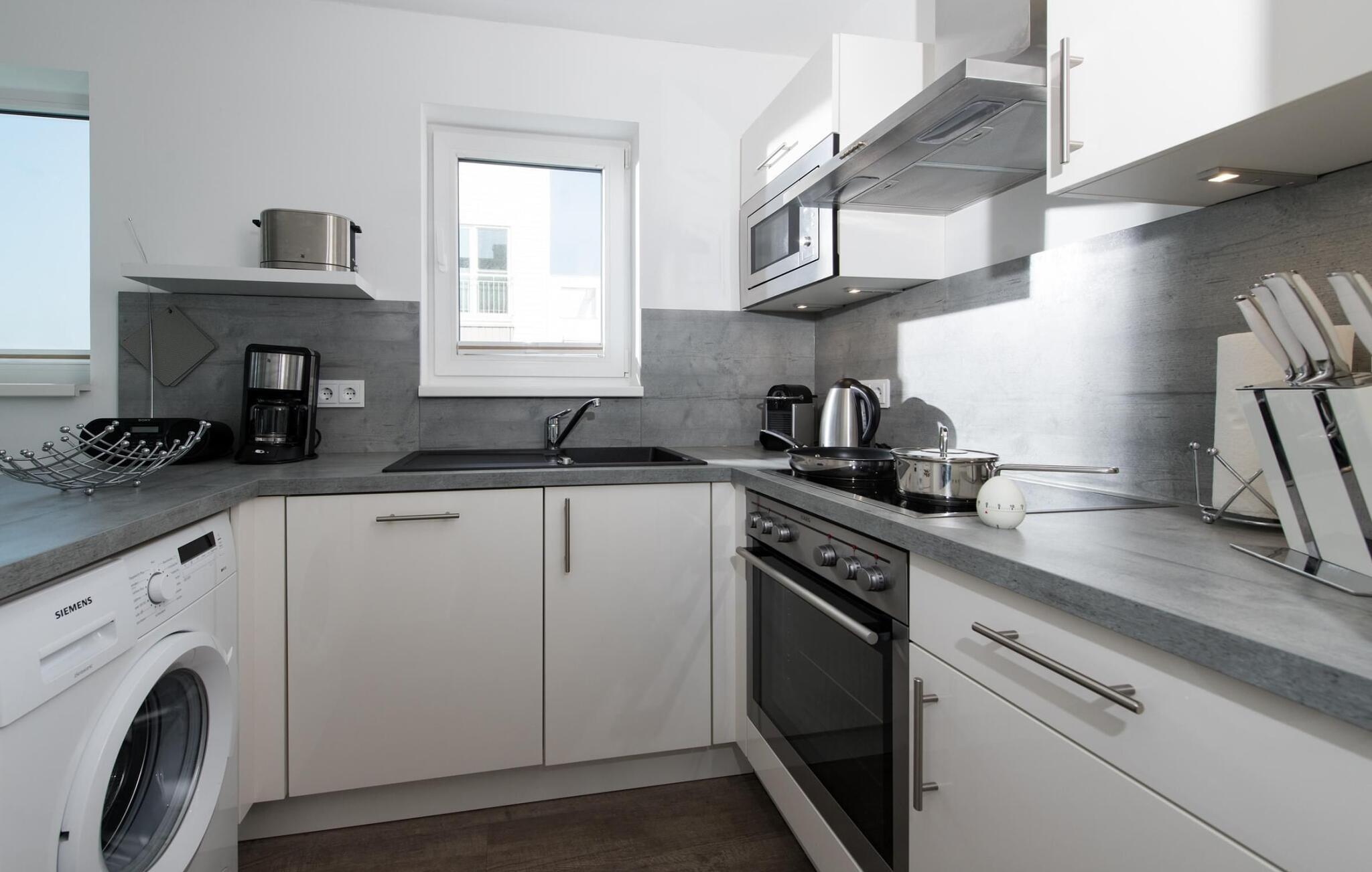 Det er et fullt utstyrt bad i hver etasje. Et boblebad og en finsk badstue i første etasje gir deg et personlig spa- og velværeområde med utsikt over Schlei.