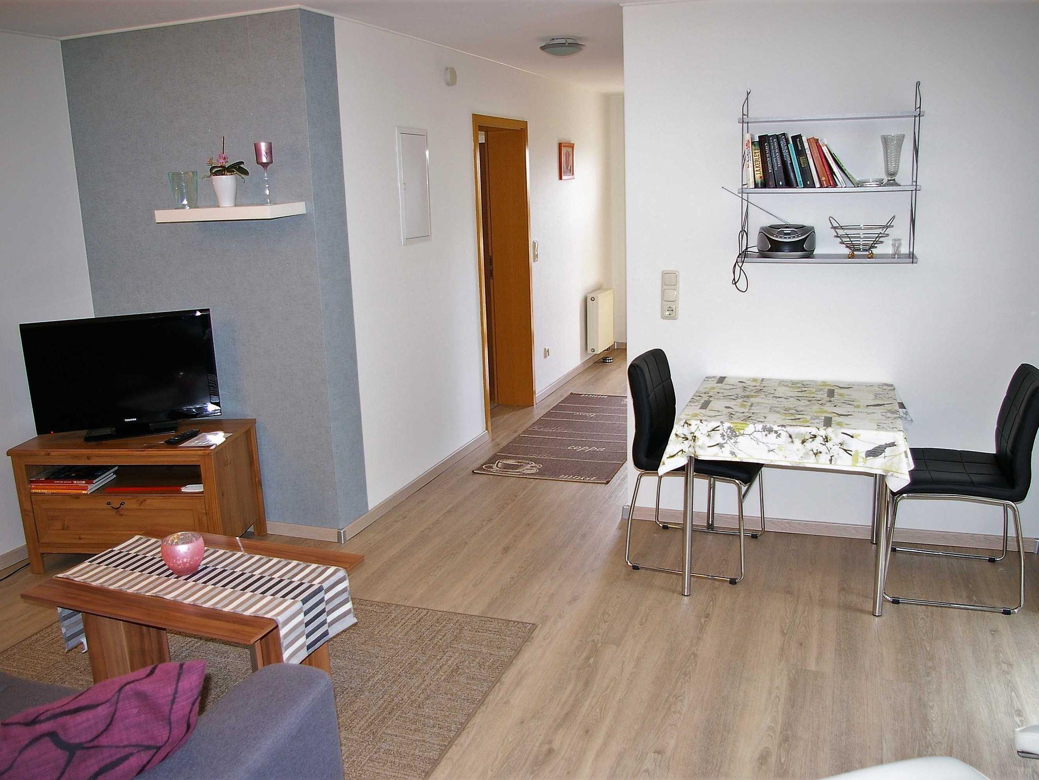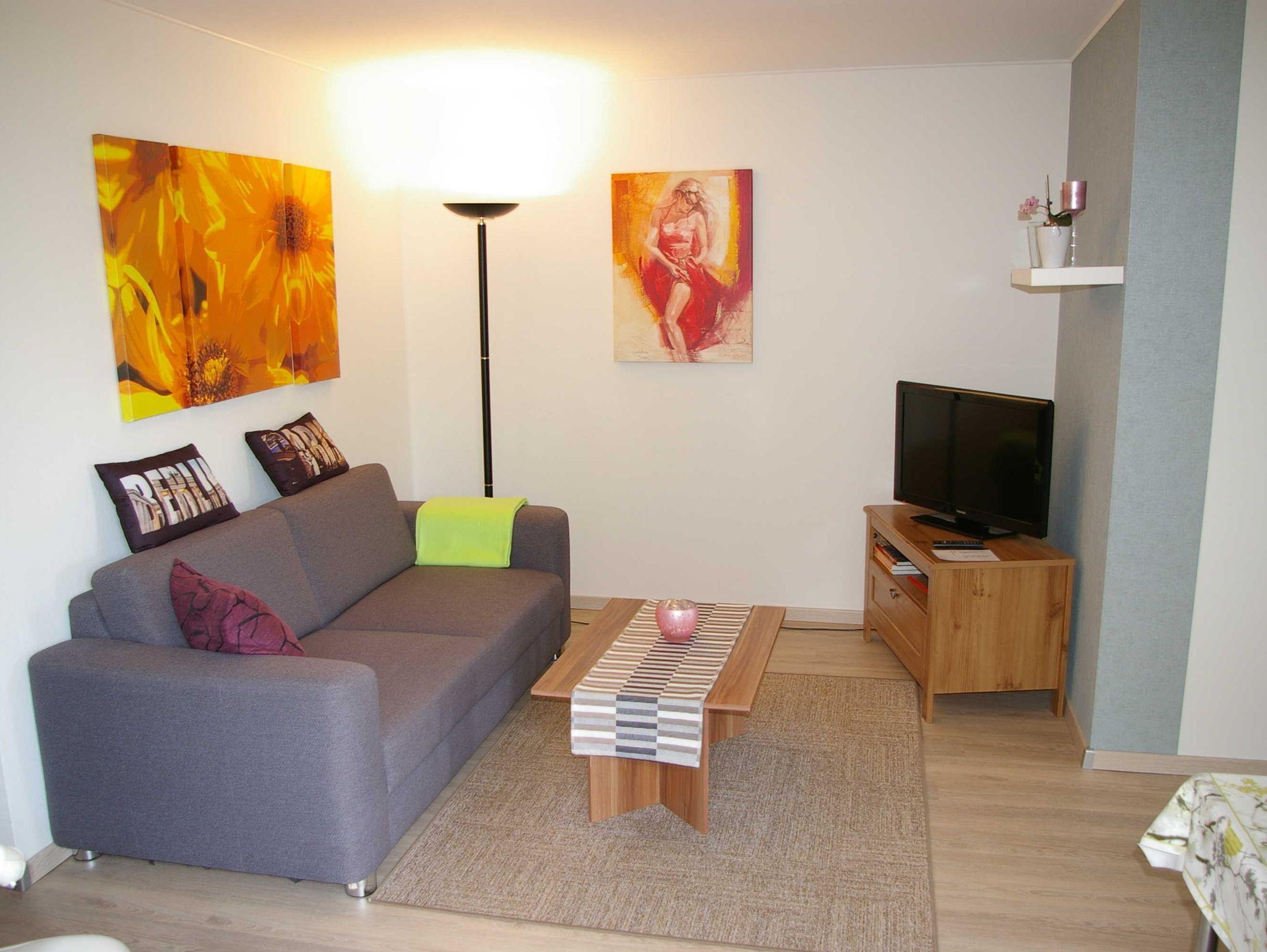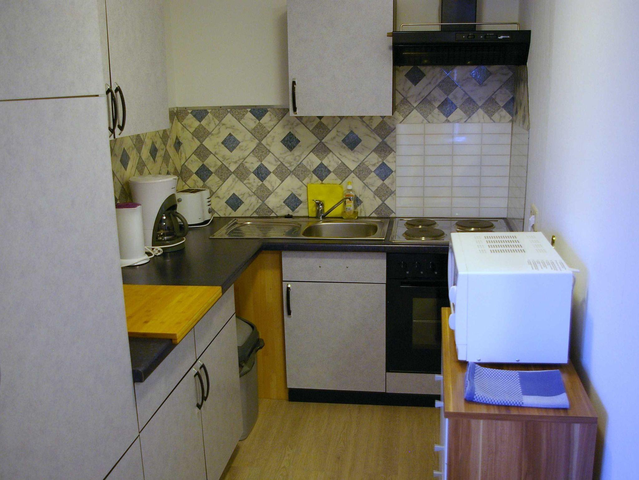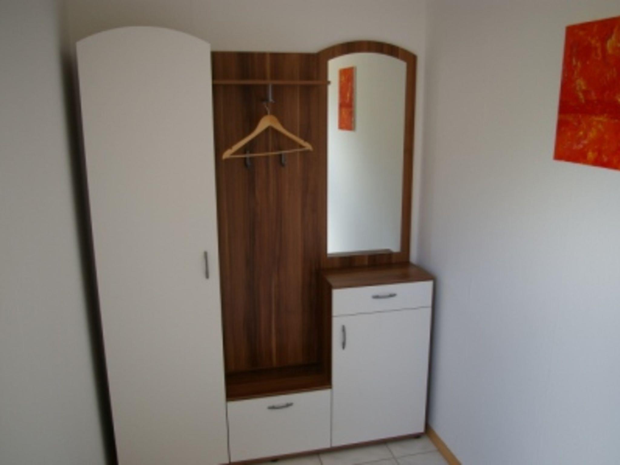 Ausstattung: 1 Flur, Garderobe im Eingangsbereich, Wohn-Essbereich mit Kabel-Tv, 1 Schlaffzimmer mit Doppelbett- 180x200m und Bettwäsche, 1 Abstellkammer, Küche mit Wasserkocher, Kaffeemaschine,Mikrowelle, Toaster, Besteck, Geschirr, Geschirrtücher ect.