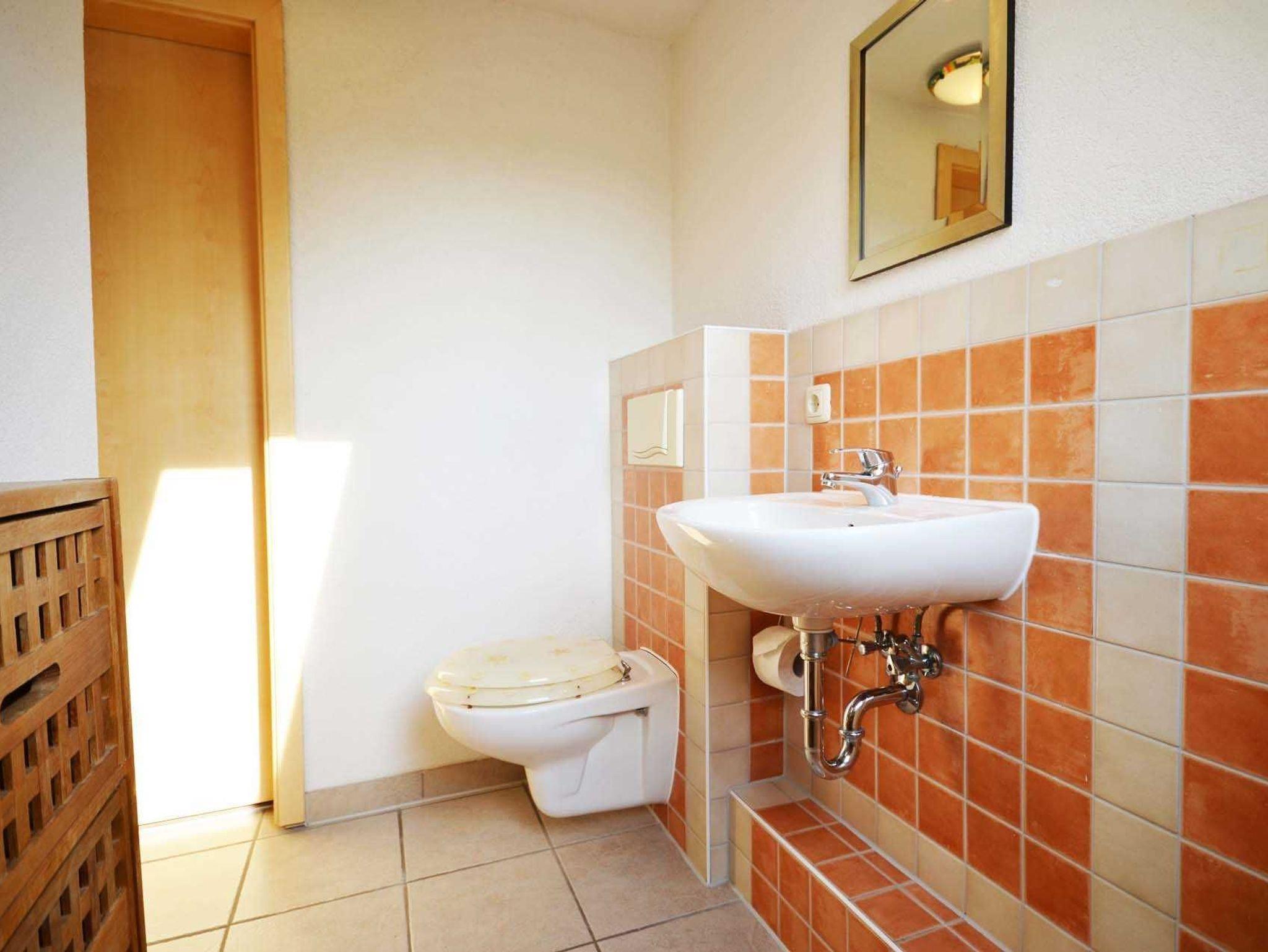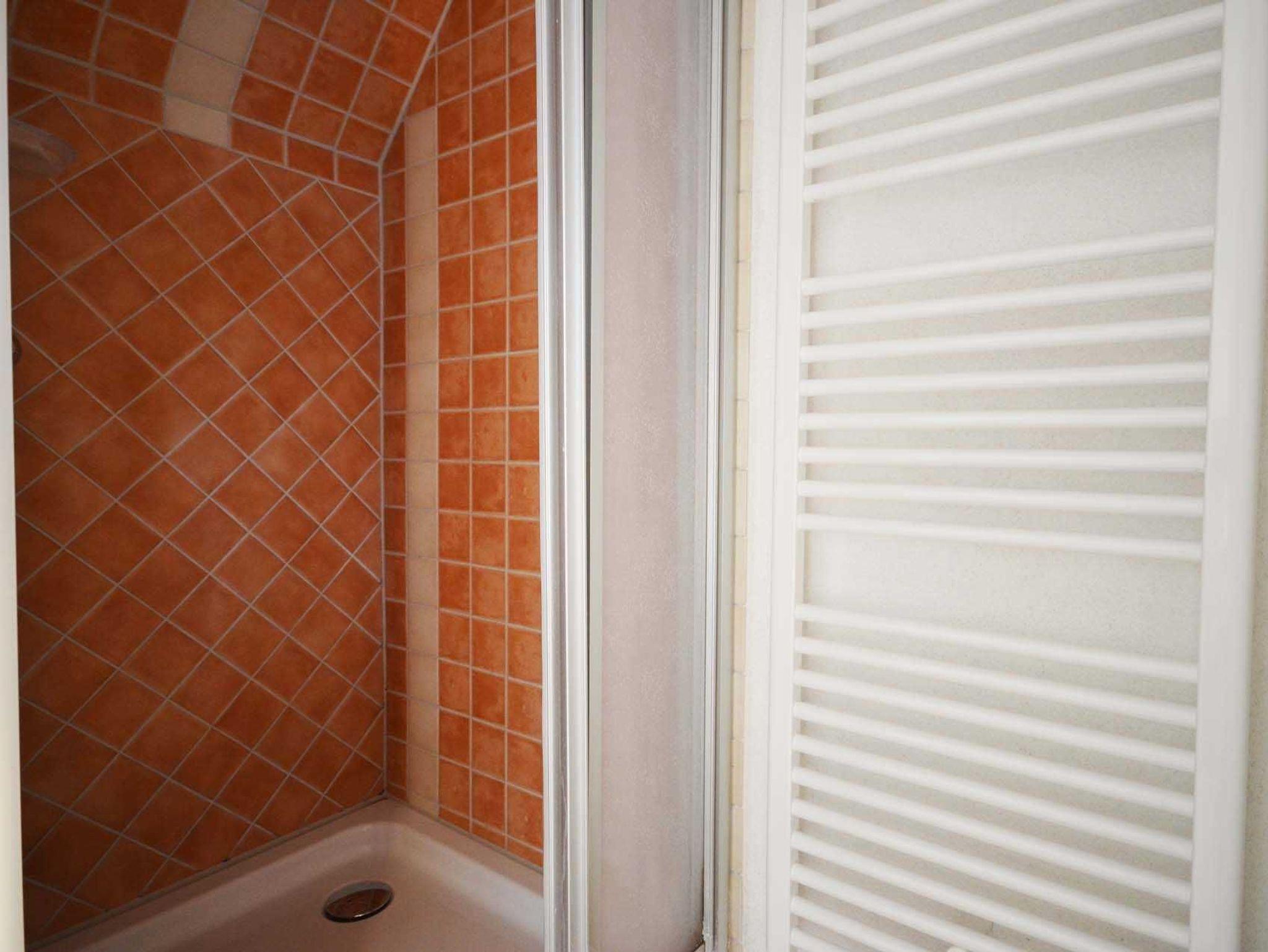 • Im Bad befindet sich die Dusche, Waschbecken, Toilette und ein Handtuchheizkörper.