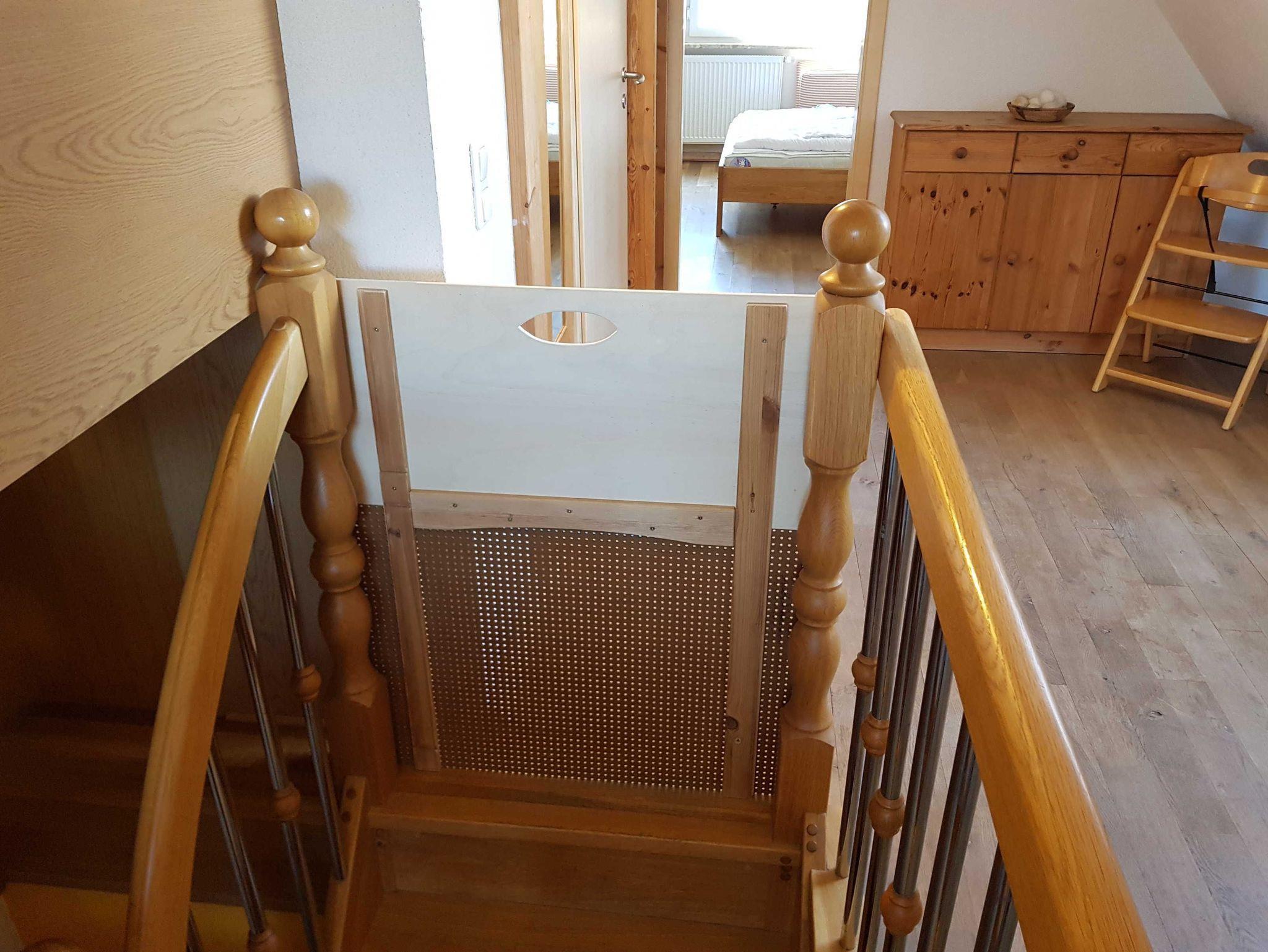 • Im Garten links und rechts der beiden Ferienhäuser haben wir jeweils ein Gartentor mit Zaunabschnitten angebracht, damit die Kinder nicht unbeobachtet nach vorne zum Parkplatz und zur Straße gelangen können. So haben wir Eltern unsere Kinder von der Terrasse aus immer im Blick, da sie nicht um die Ecke neben der Terrasse kommen und nur nach vorne Richtung Steingrillplatz und Saunahaus zum Spielen gelangen. Die Tore lassen sich natürlich öffnen und haben zusätzlich eine Kindersicherung.