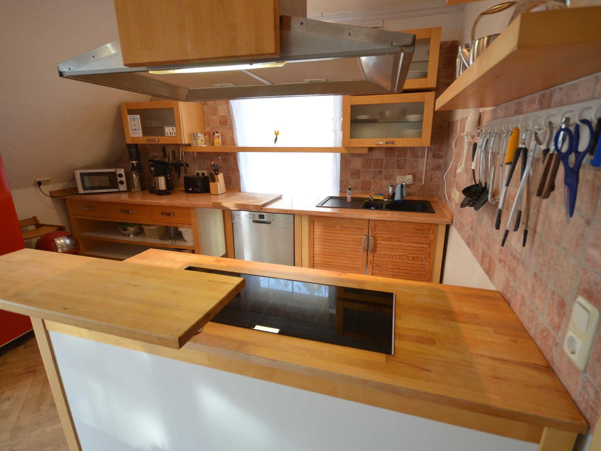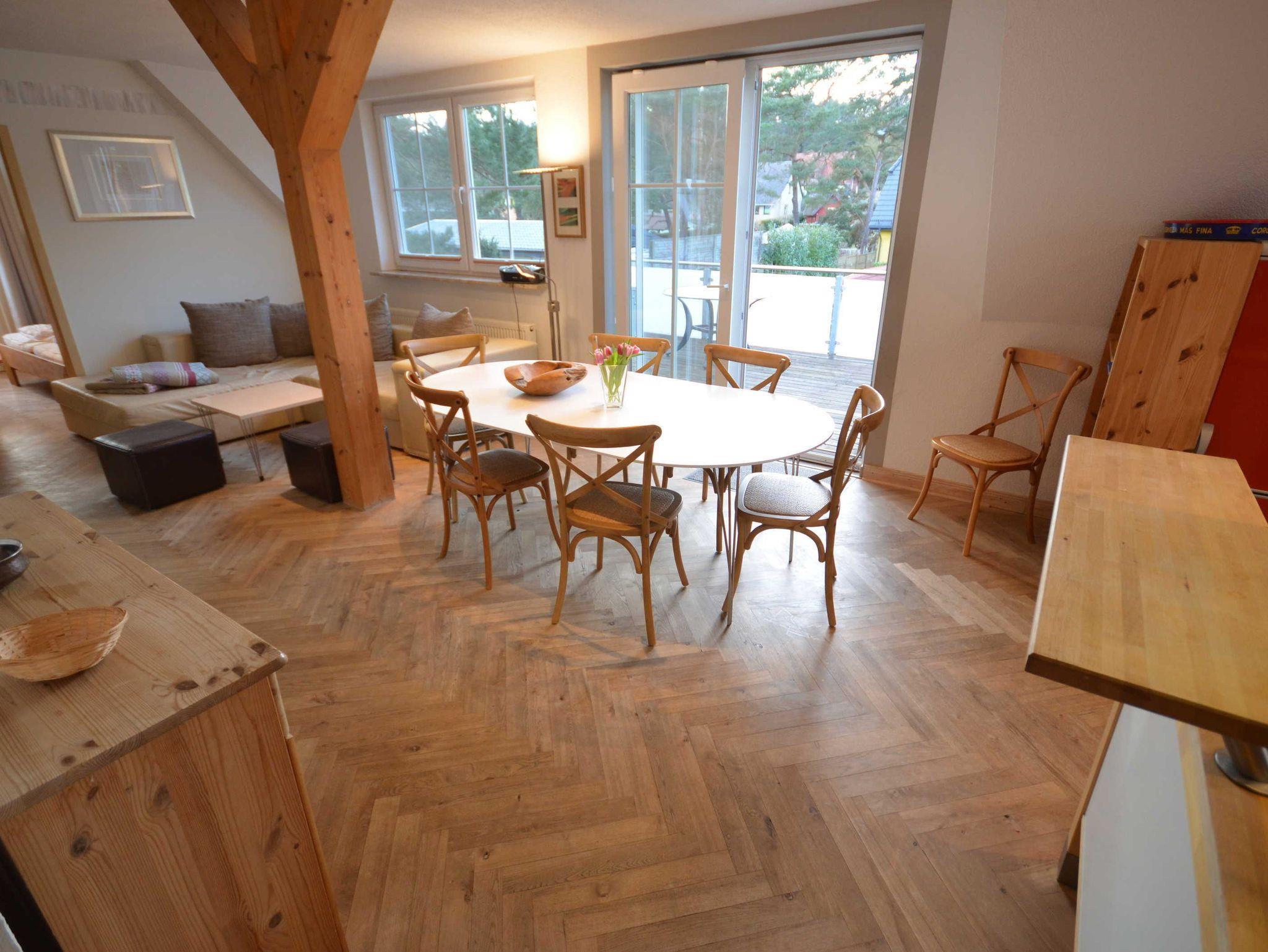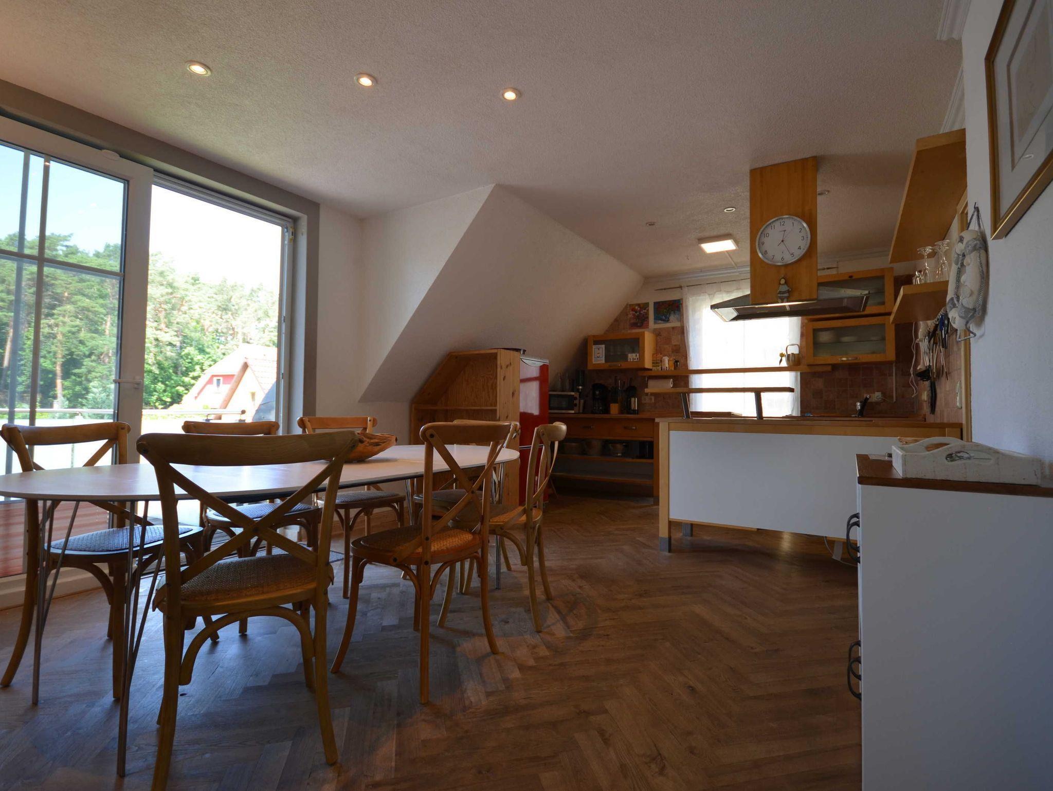 • Küche inkl. Spülmaschine, 4 Kochplatten (Ceranfelder), Backofen, großer Kühlschrank mit großem Kühlfach, Wasserkocher, Kaffeemaschine, Toaster, Esstischgarnitur mit 8 Stühlen.