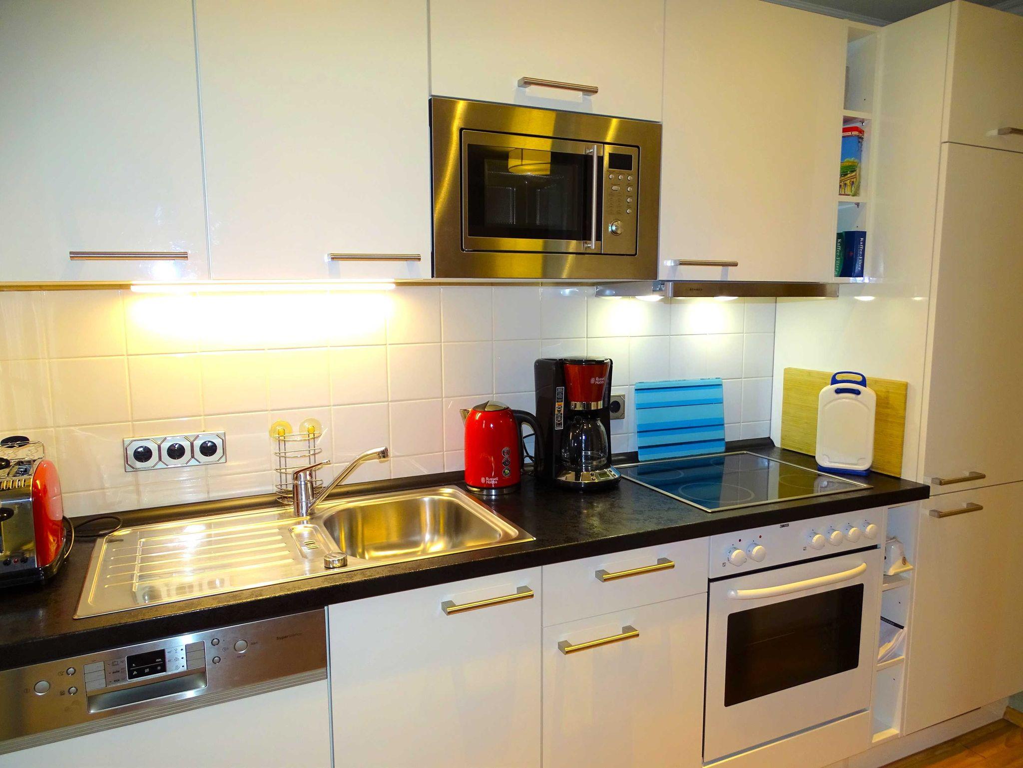 Im Erdgeschoß des Hauses finden Sie das gemütlich eingerichtete Wohnzimmer mit einer bequemen Couch (keine Schlafcouch), Fernseher und Radio, einen großzügigen Essplatz und die offene Küche. Die Küche ist komplett ausgestattet mit Geschirrspüler, Kaffeemaschine, Toaster, Wasserkocher, Geschirr und einem Kühlschrank mit Gefrierfach.